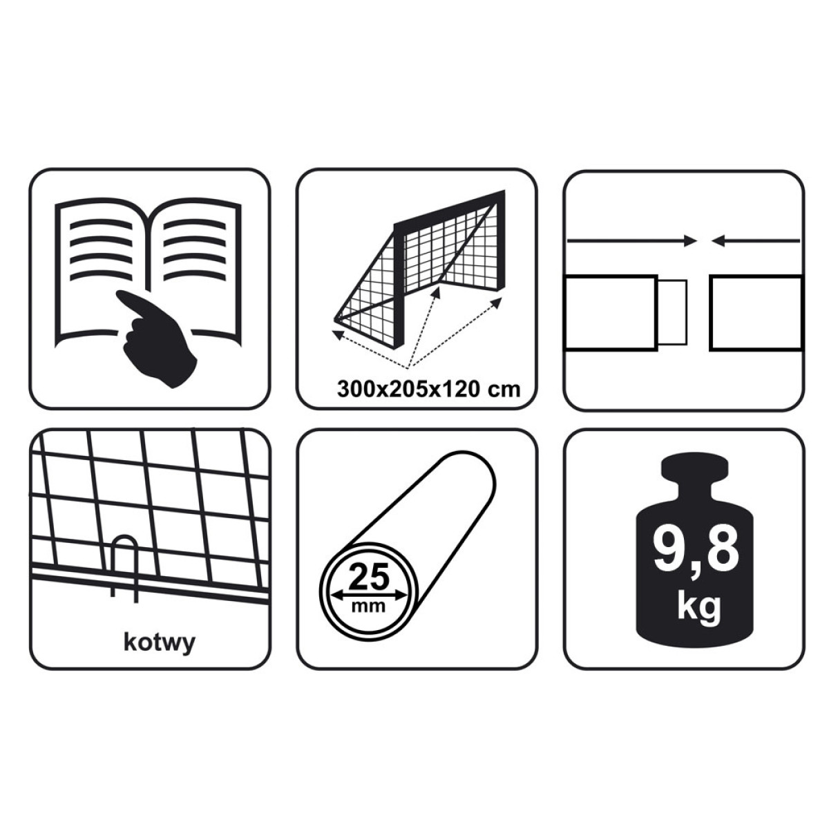 Futbola vārti ar izmēriem 300 cm x 205 cm x 120 cm ir ideāli piemēroti spēļu organizēšanai piemājas dārzā. Vārtiem ir lakota metāla rāmis, kas nodrošina aizsardzību pret mainīgiem laika apstākļiem. Tīkls ir izgatavots no izturīga poliestera.