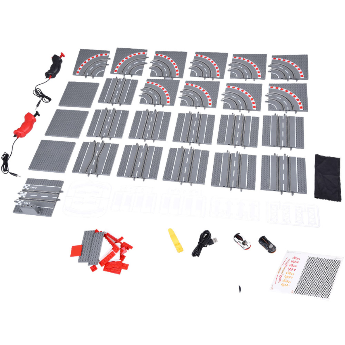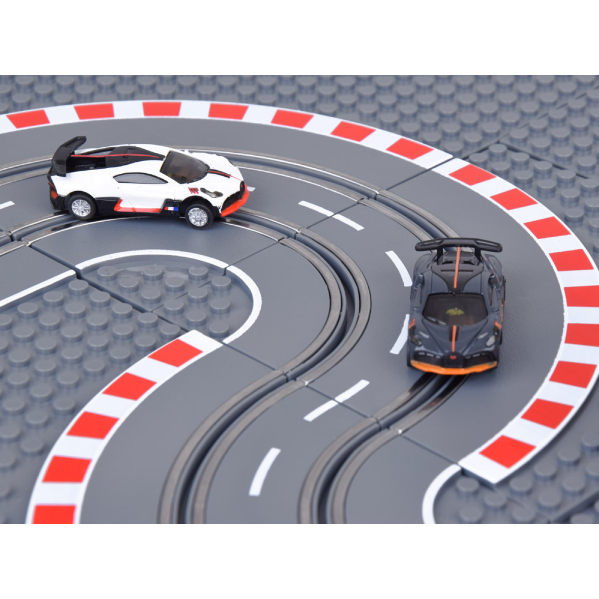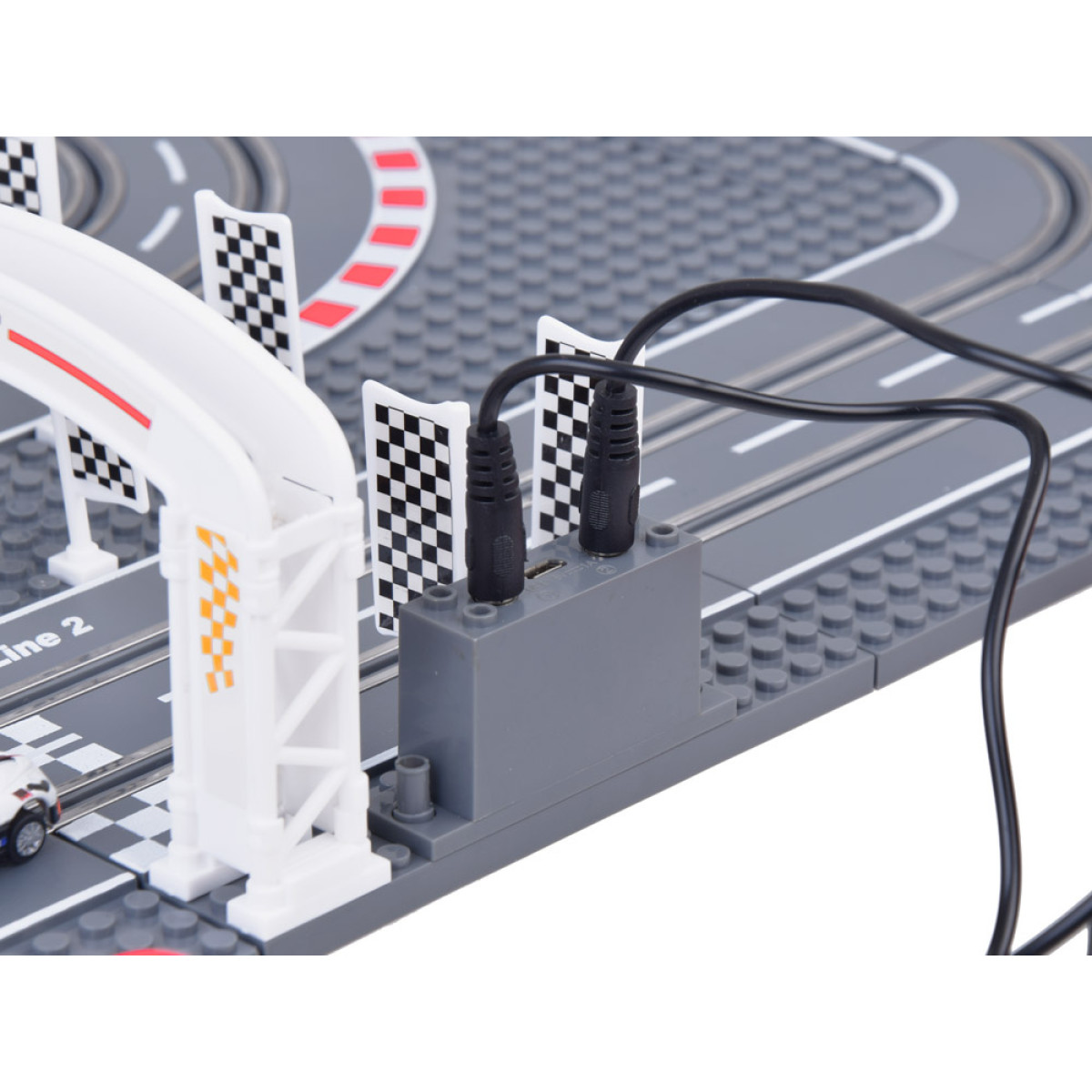 Trase ir vadāma ar tālvadības pultīm, kas aprīkotas ar gāzes funkciju. Vienkārši pievienojiet tās vadības stacijai uz trases, lai sāktu aizraujošu spēli. Gatavs piedzīvojumam? Izveidojiet savu trasi un dodieties trasē!