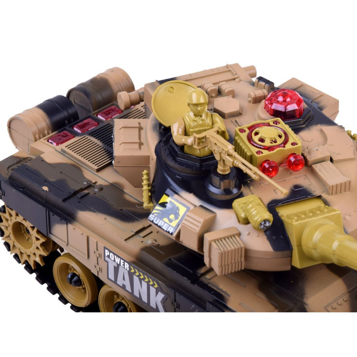 Tālvadības tvertne ļauj piedalīties daudzās cīņās. Tvertne ar tālvadību ir pieejama ļoti reālistiskā tuksneša kamuflāžā un darbojas ar 2,4 GHz frekvenci. Rotaļlieta noteikti sniegs neticamu prieku ikvienam, neatkarīgi no vecuma! (tvertne ar meža kamuflāžu pieejama citā izsolē).