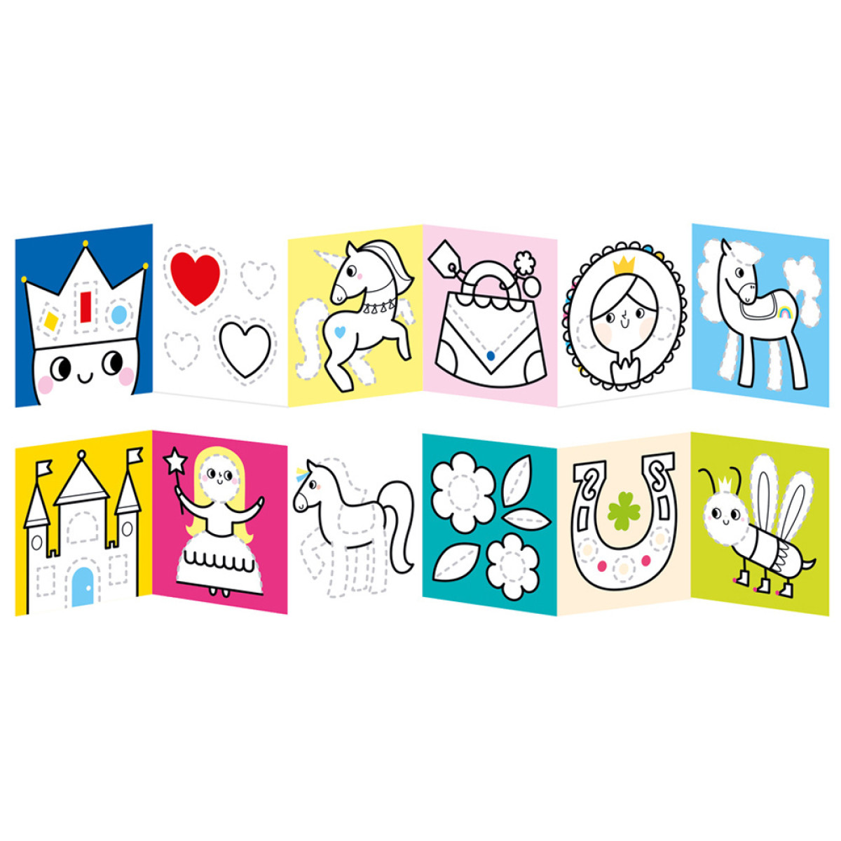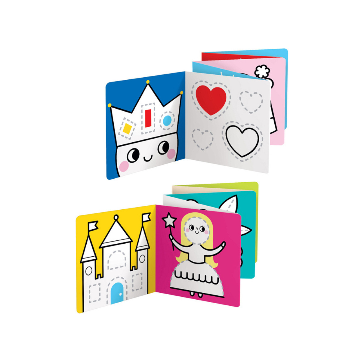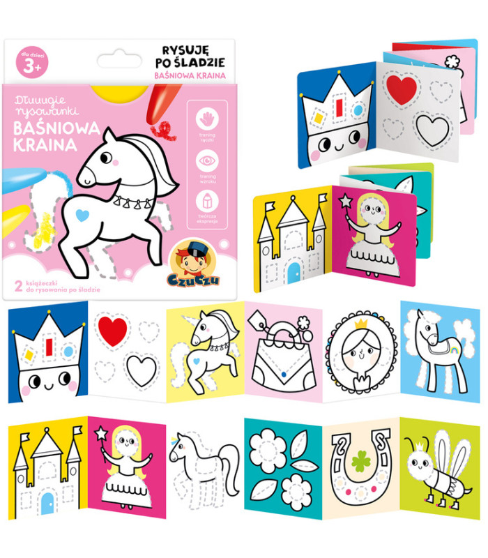 Radošais komplekts ietver 2 garas harmonikas grāmatiņas. Populārā tēma iedvesmo bērnus ņemt rokā krītiņus un krāsas: burvju ilustrācijas, kas rosina uz radošu spēlēšanos. Zīmējiet pa līniju, krāsojiet, piezīmējiet savus elementus, uzlabojot manuālās prasmes un iztēli.