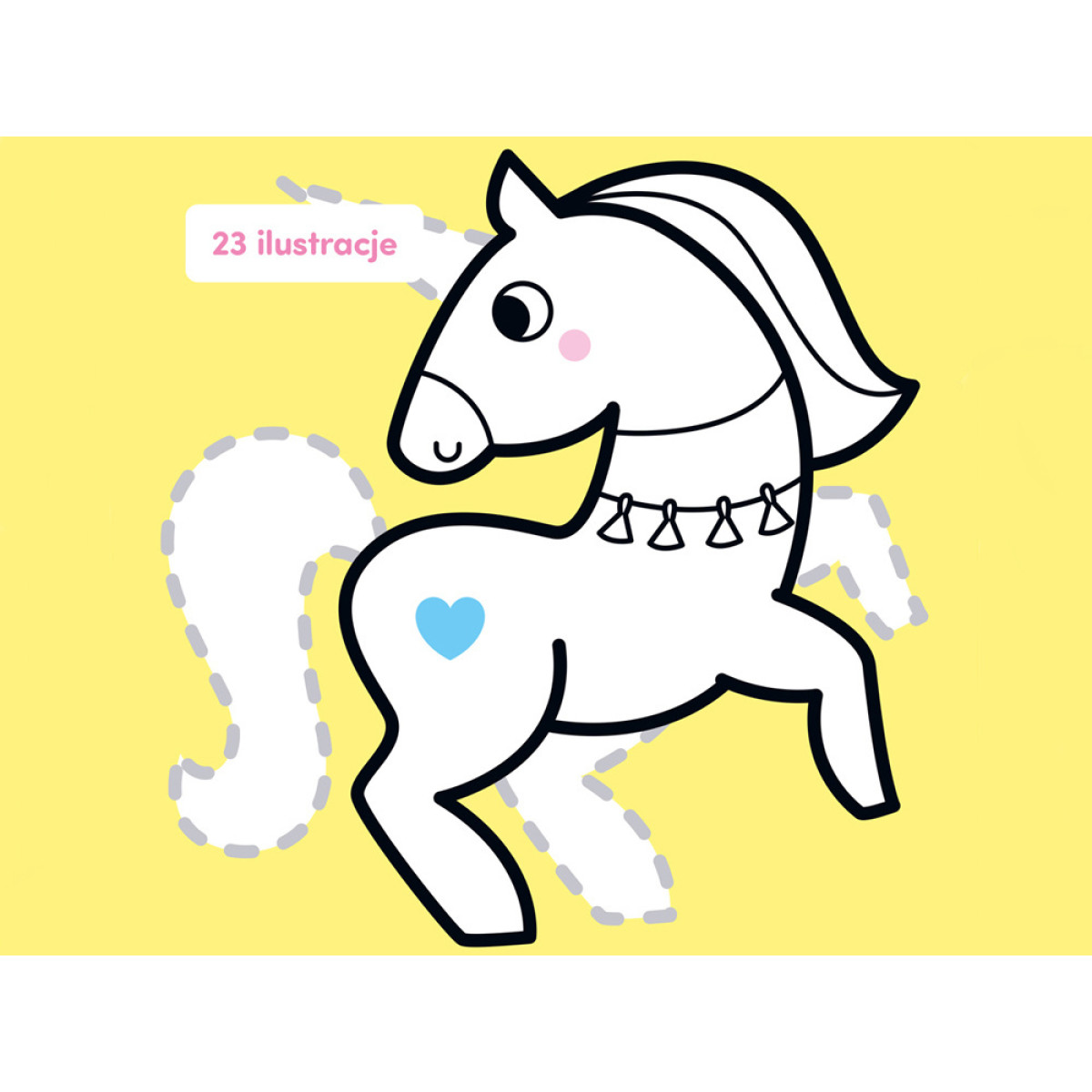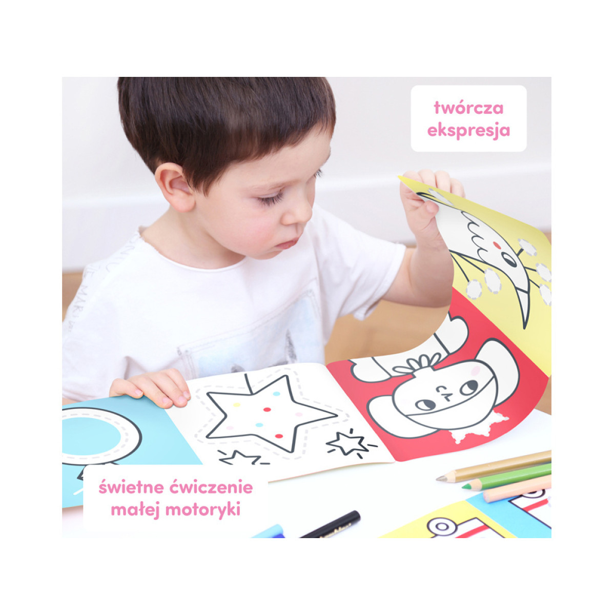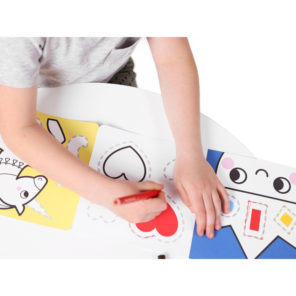 Radošais komplekts ietver 2 garas harmonikas grāmatiņas. Populārā tēma iedvesmo bērnus ņemt rokā krītiņus un krāsas: burvju ilustrācijas, kas rosina uz radošu spēlēšanos. Zīmējiet pa līniju, krāsojiet, piezīmējiet savus elementus, uzlabojot manuālās prasmes un iztēli.