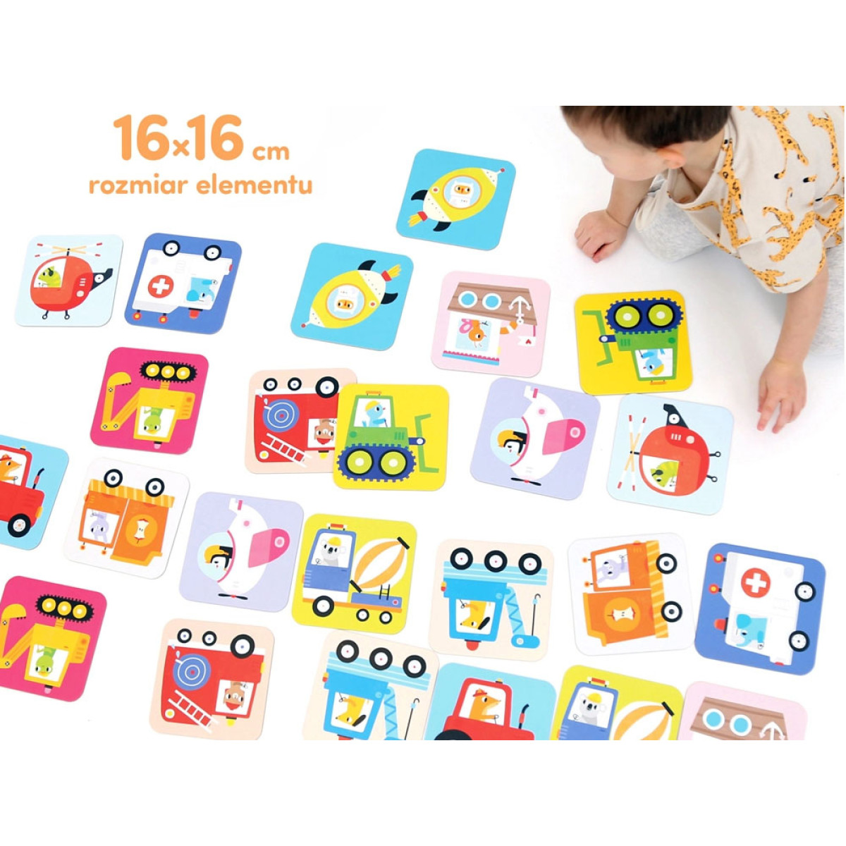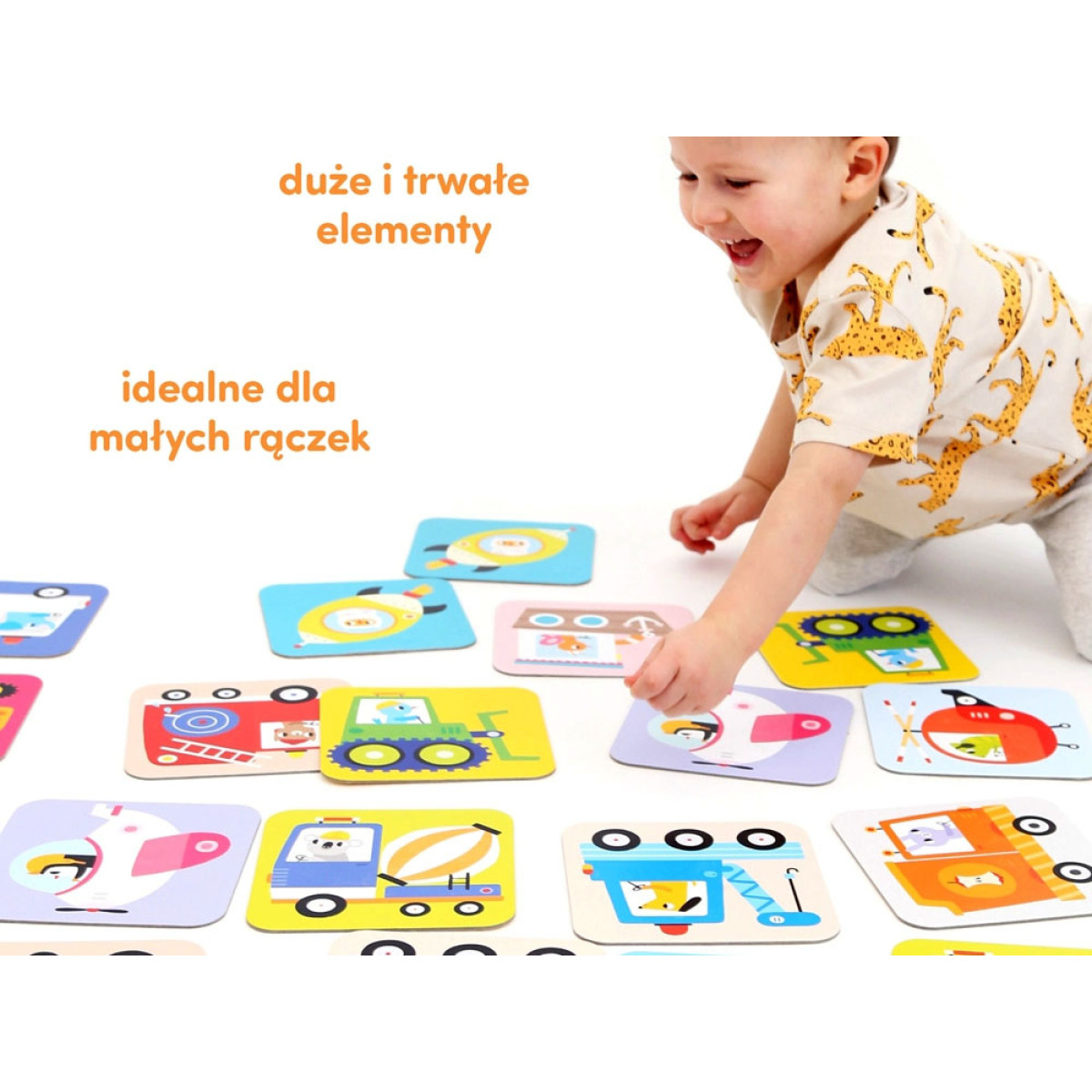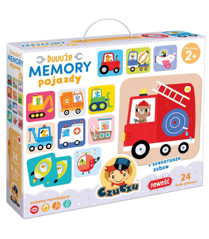 CzuCzu Duuuži Atmiņas Spēle Transportlīdzekļi ir izglītojoša spēle, kas palīdz bērniem trenēt atmiņu, koncentrēšanos un vērību. Šis izglītojošais komplekts sastāv no tiešām lieliem, skaisti ilustrētiem elementiem. Grūtības līmeni var pielāgot bērna iespējām, sākot ar divu vai trīs pāru spēlēšanu, un pakāpeniski pievienojot vairāk transportlīdzekļu. Ar plāksnēm var spēlēties dažādos veidos - komplektā iekļauta rokasgrāmata ar 28 scenārijiem izglītojošām spēlēm.