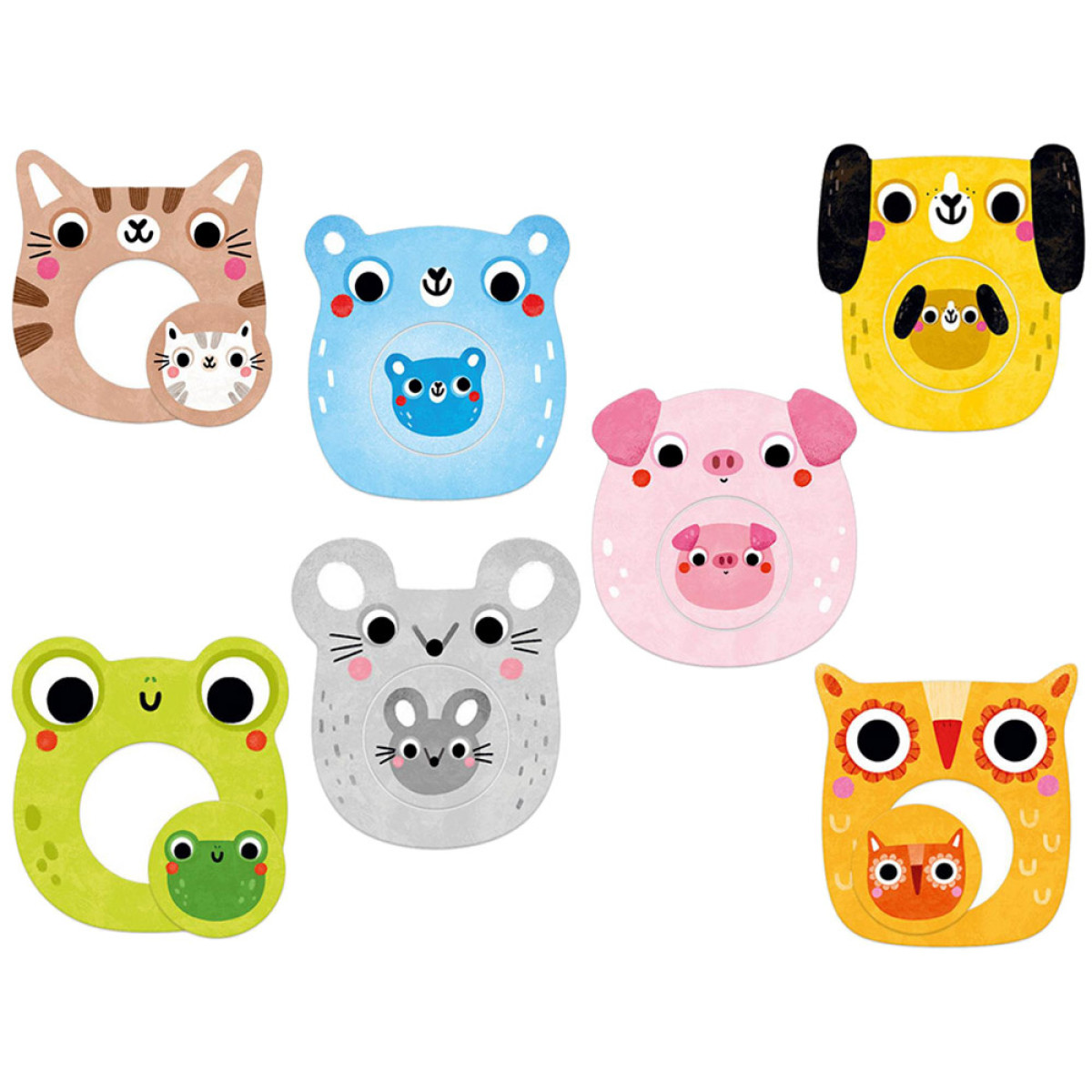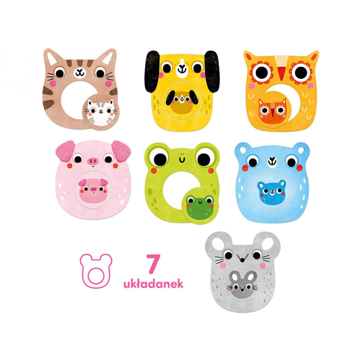 Komplekts sastāv no 14 elementiem - tajā ir pat 7 puzles! Turklāt tās ir tematiski veidotas, attēlojot 7 dažādus dzīvniekus, kuriem "vēderā" ir caurums, un bērna uzdevums ir atbilstoši caurumam pievienot mazāku dzīvnieciņa attēlu. Atvieglojums ir tas, ka mazā versija ir tāda paša krāsa kā lielais dzīvnieks.