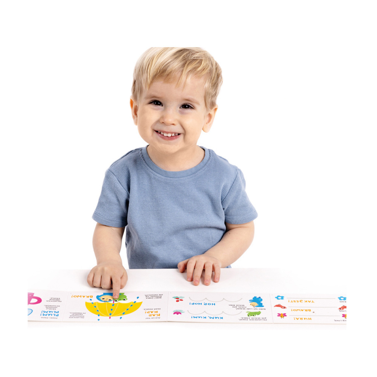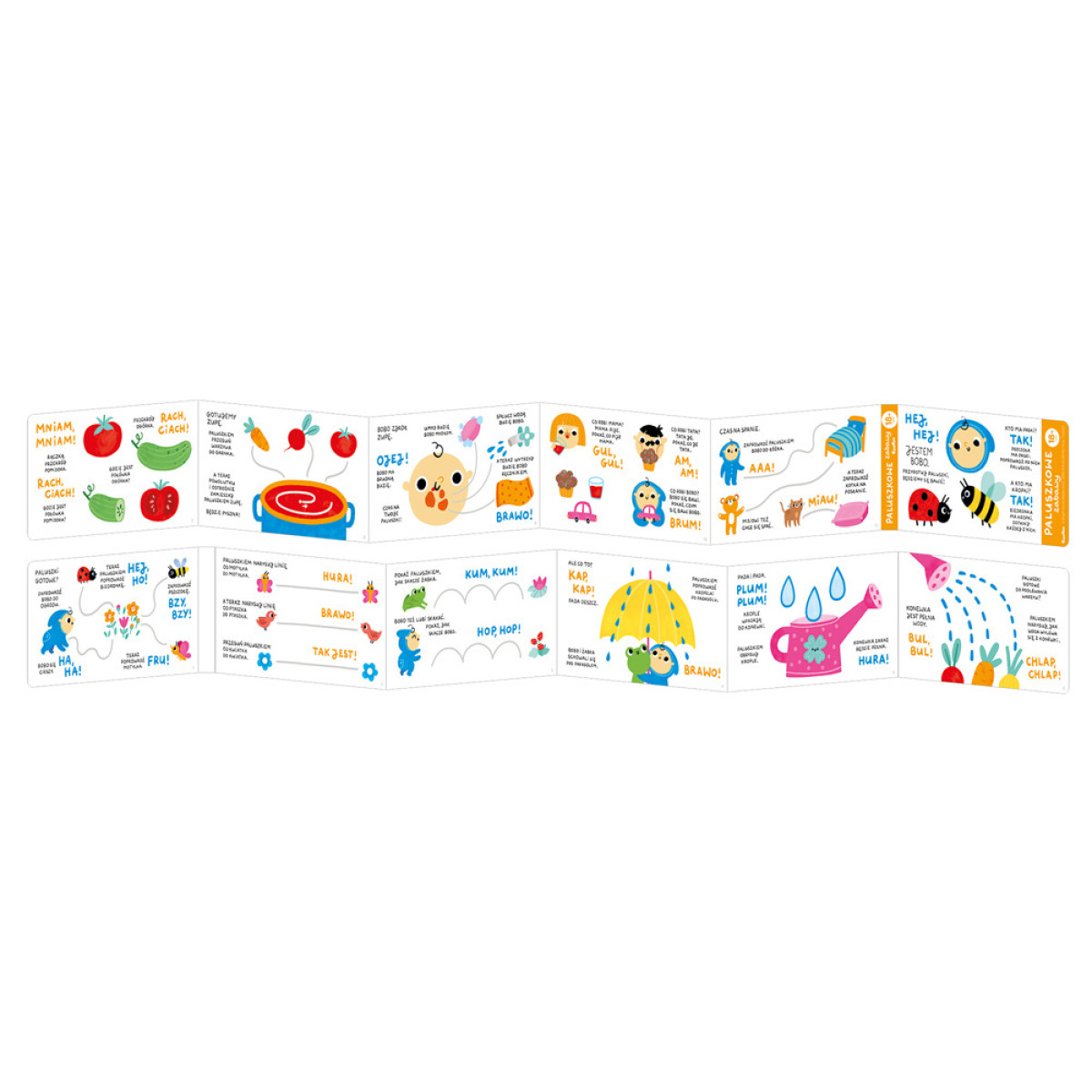 Garā harmonikas veida grāmata ietver uzdevumus, kas iesaista bērnu spēlē un prasmju attīstīšanā. Pirkstiņu spēles ir pilnas ar interesantām, krāsainām ilustrācijām un idejām jautrām spēlēm, kas pielāgotas bērna prasmēm un interesēm.