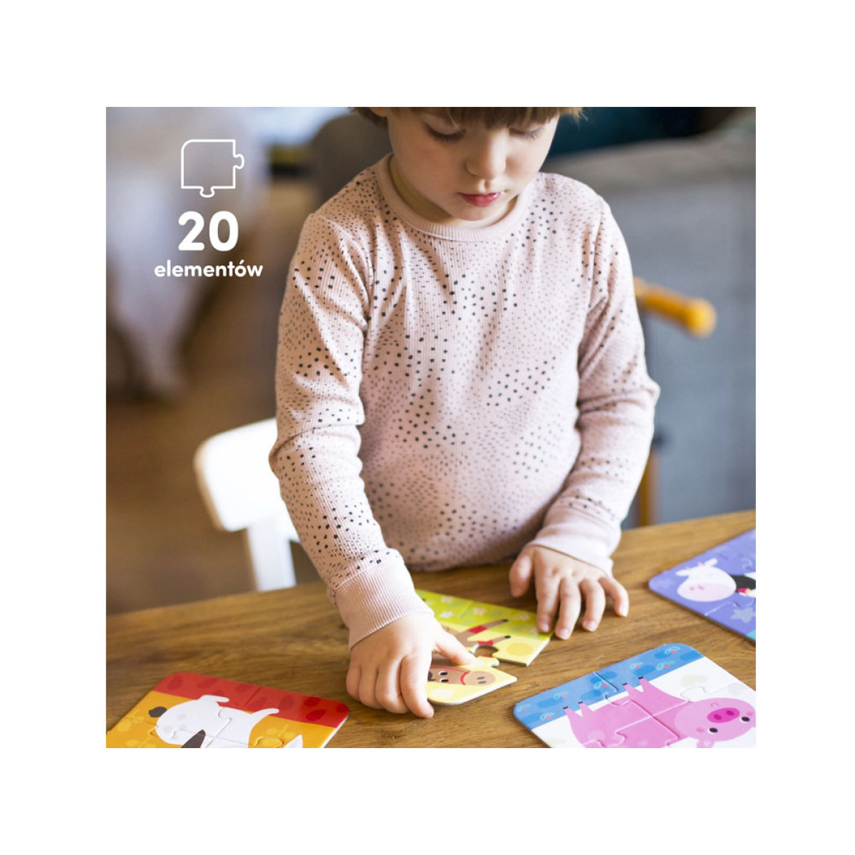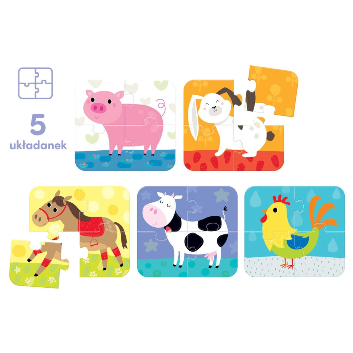 Komplektā atradīsiet mīklas ar bērnu iecienītajiem dzīvniekiem: zirgu, govi, vistu, cūku un trušu.
