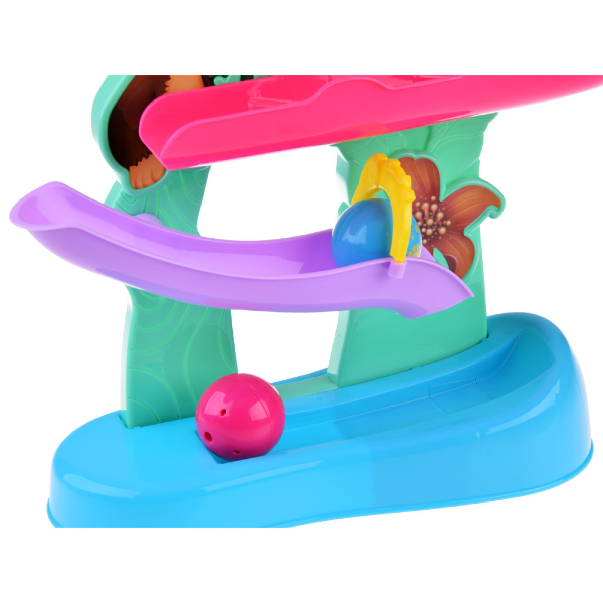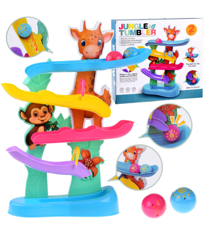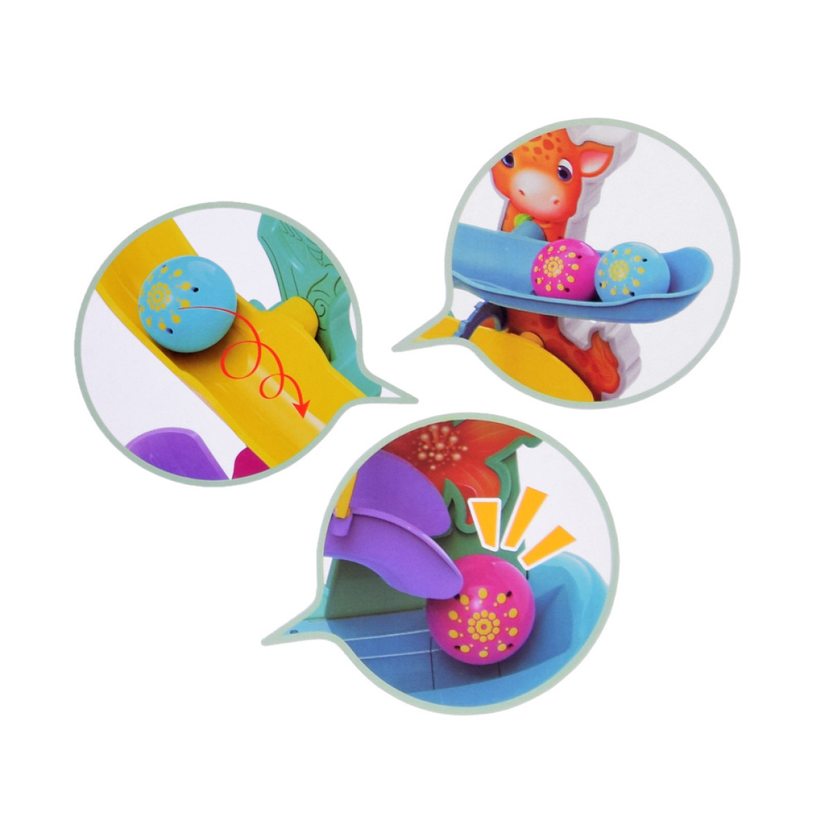 Rotaļlieta satur četras krāsainas rampas, pa kurām ripo rozā un zila bumbiņa. Kad bumbiņa nonāk līdz apakšai, bērns dzirdēs priecīgu džungļu dzīvnieku balsi kopā ar jautru bungas skaņu. Interaktīvā rotaļlieta mudina mazuļus attīstīt koordināciju starp roku un aci, kā arī motoriku, spēlējot! Bērns var ilgu laiku vērot, kā bumbiņas ripo. Pateicoties krāsainajiem akcentiem un skaņas efektiem, bumbiņu trase izklaidēs jūsu bērnu jebkurā brīdī.