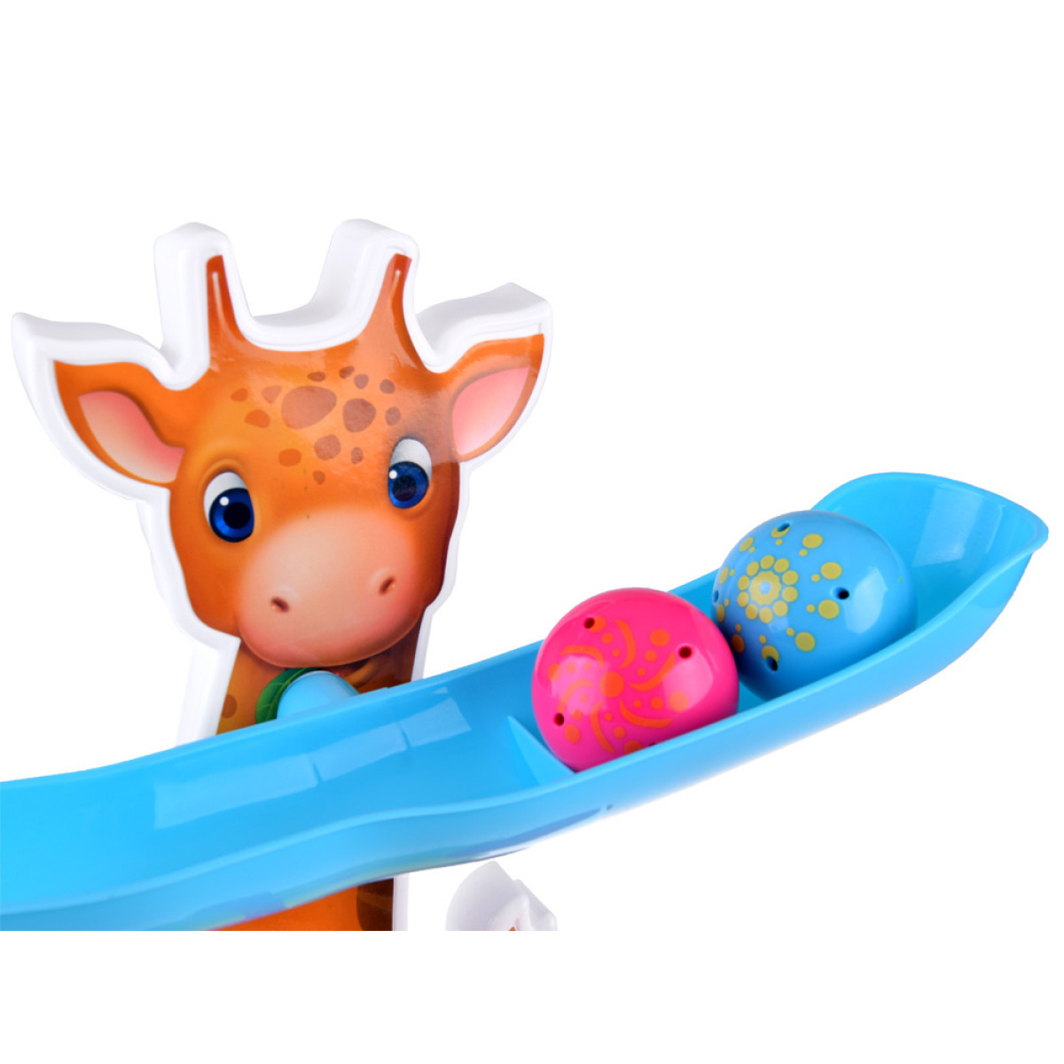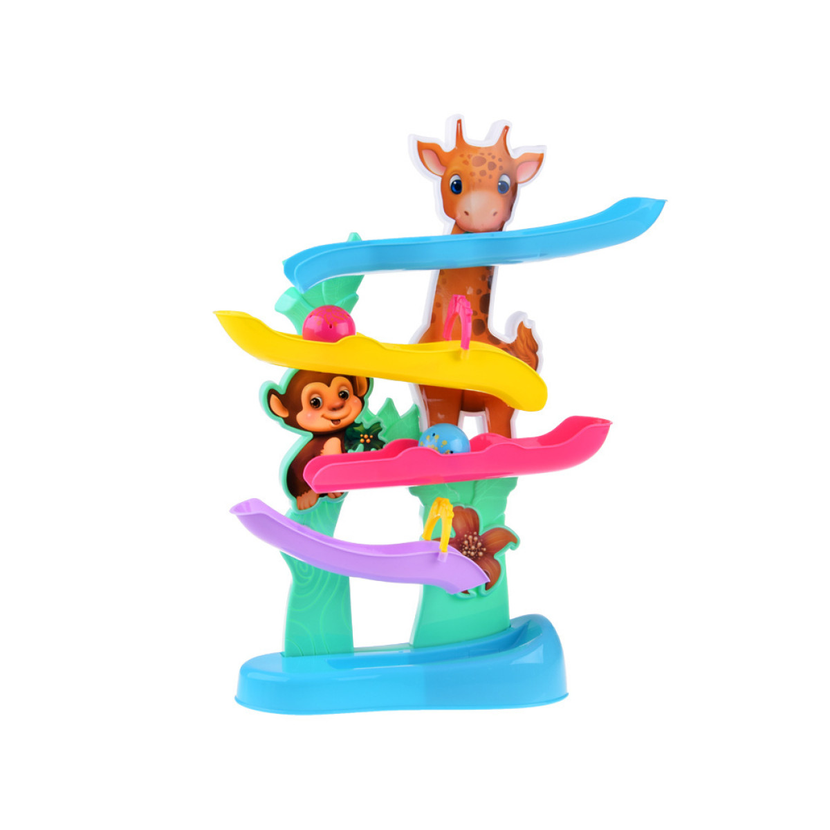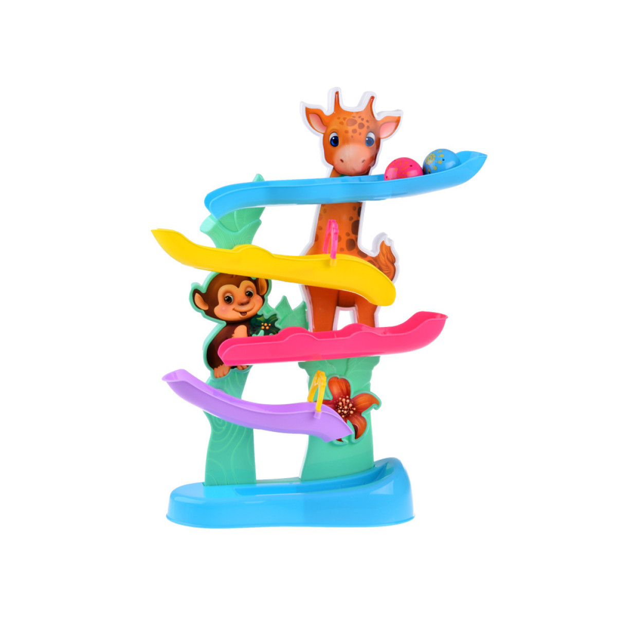 Rotaļlieta satur četras krāsainas rampas, pa kurām ripo rozā un zila bumbiņa. Kad bumbiņa nonāk līdz apakšai, bērns dzirdēs priecīgu džungļu dzīvnieku balsi kopā ar jautru bungas skaņu. Interaktīvā rotaļlieta mudina mazuļus attīstīt koordināciju starp roku un aci, kā arī motoriku, spēlējot! Bērns var ilgu laiku vērot, kā bumbiņas ripo. Pateicoties krāsainajiem akcentiem un skaņas efektiem, bumbiņu trase izklaidēs jūsu bērnu jebkurā brīdī.