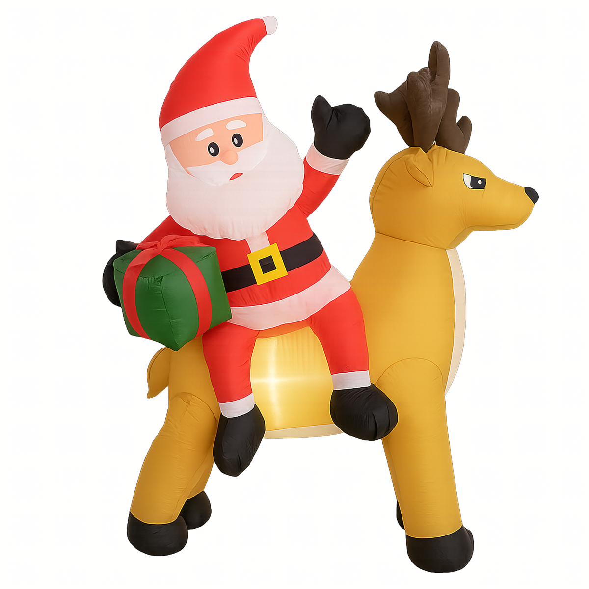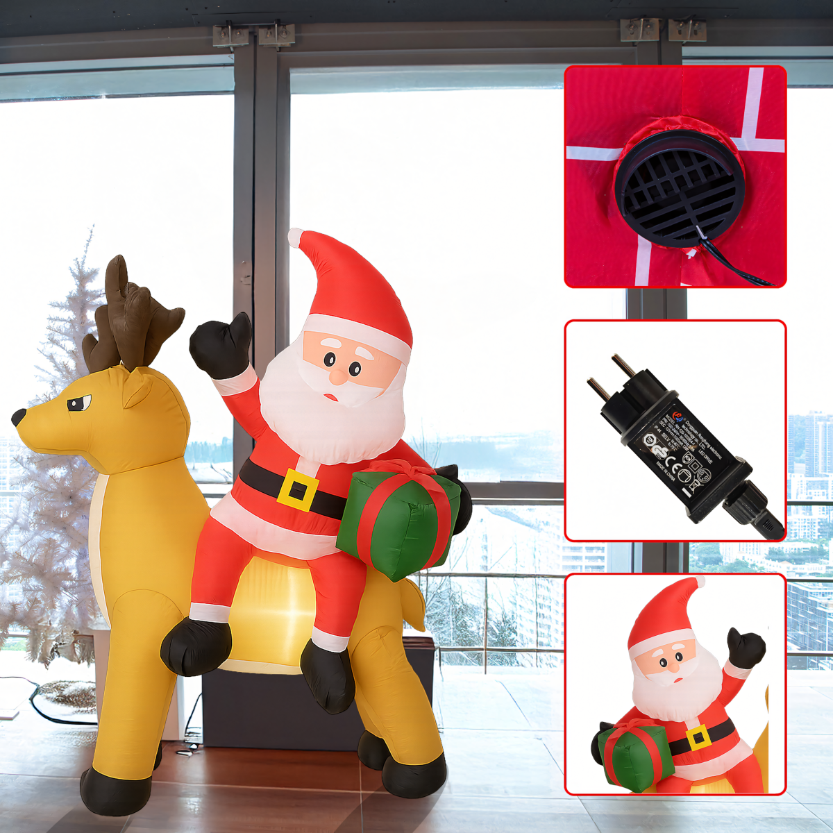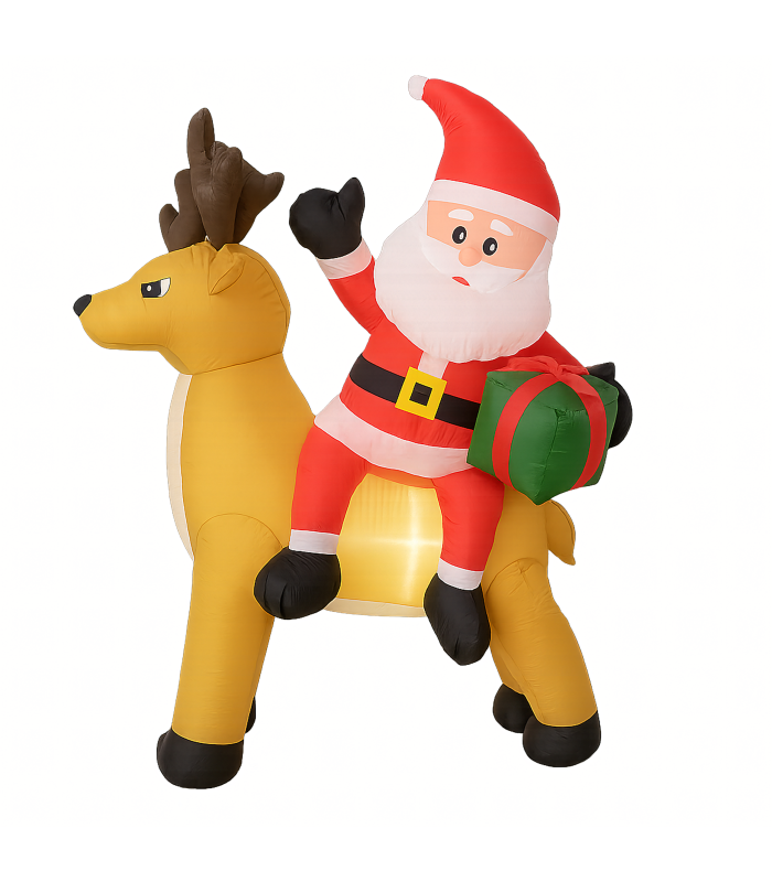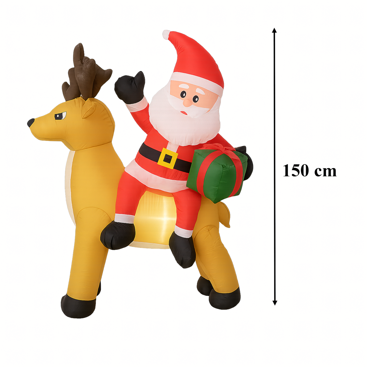 Piepūšams Ziemassvētku vecītis ar ziemeļbriedi 1,5 m ir efektīva svētku dekorācija, kas apgaismos jūsu māju un dārzu.