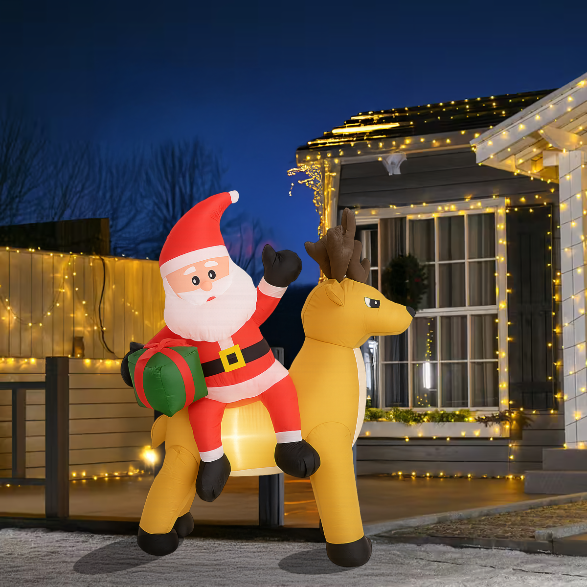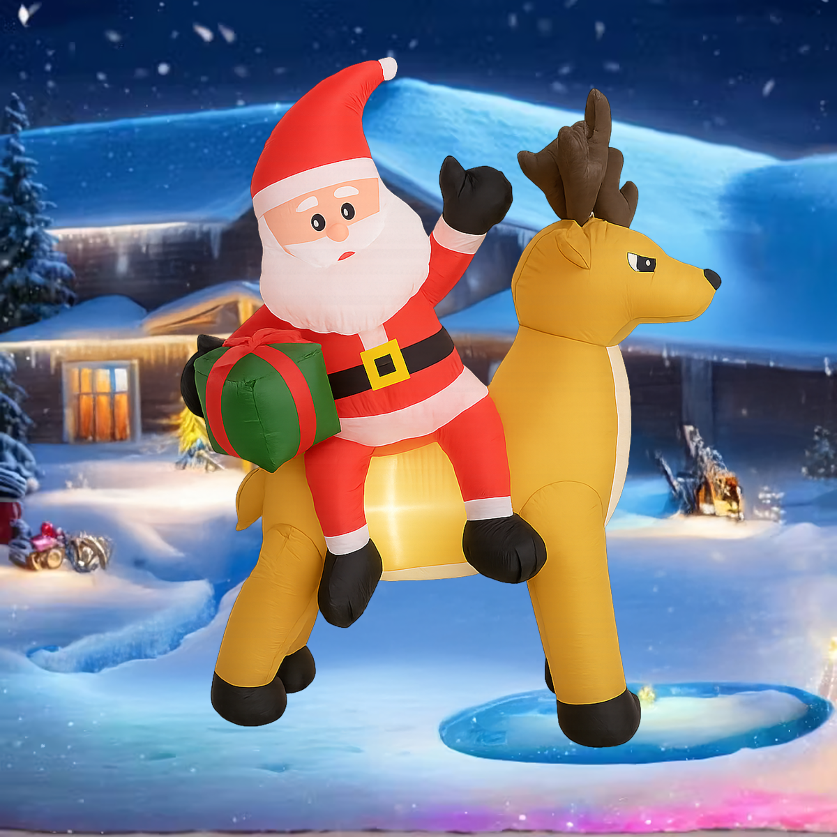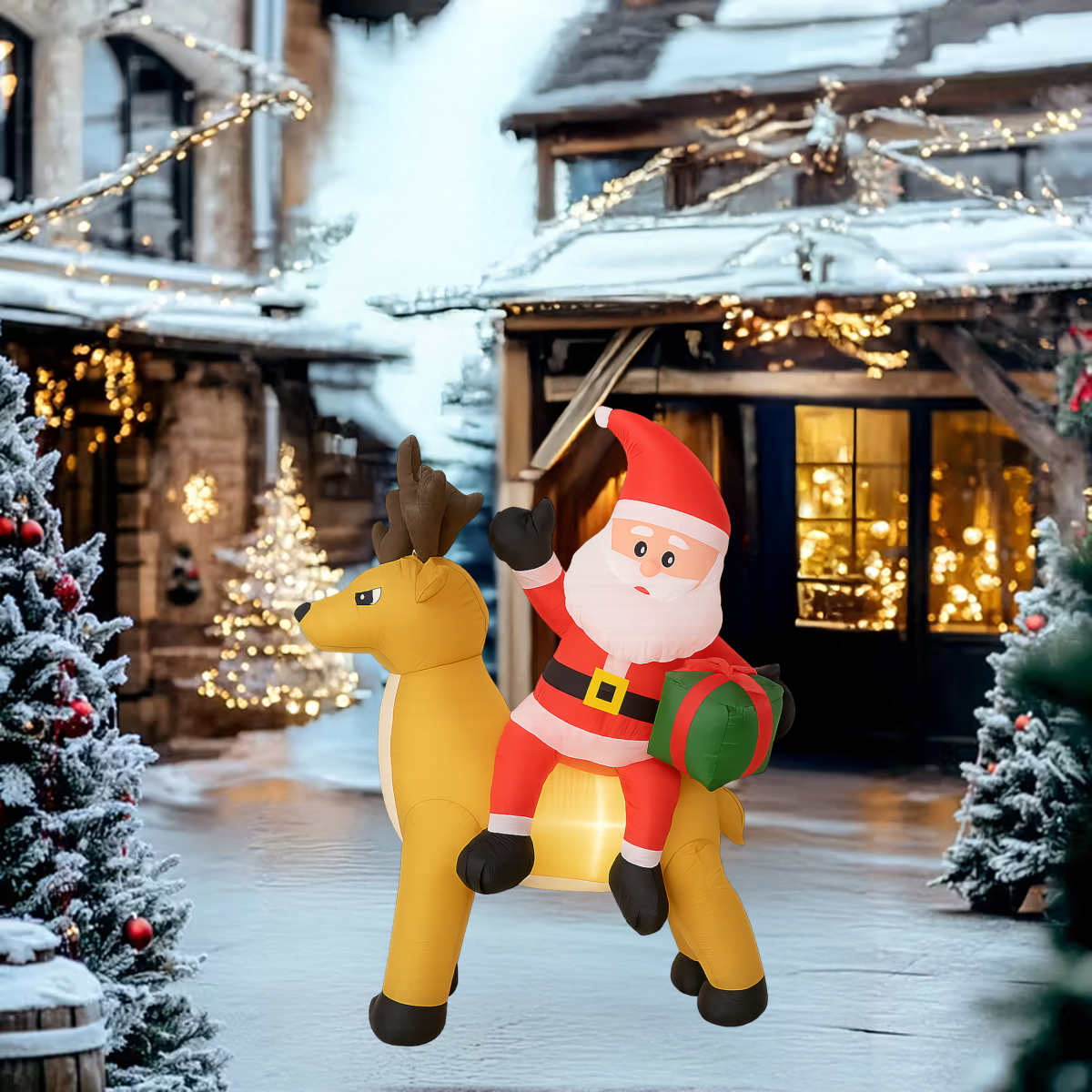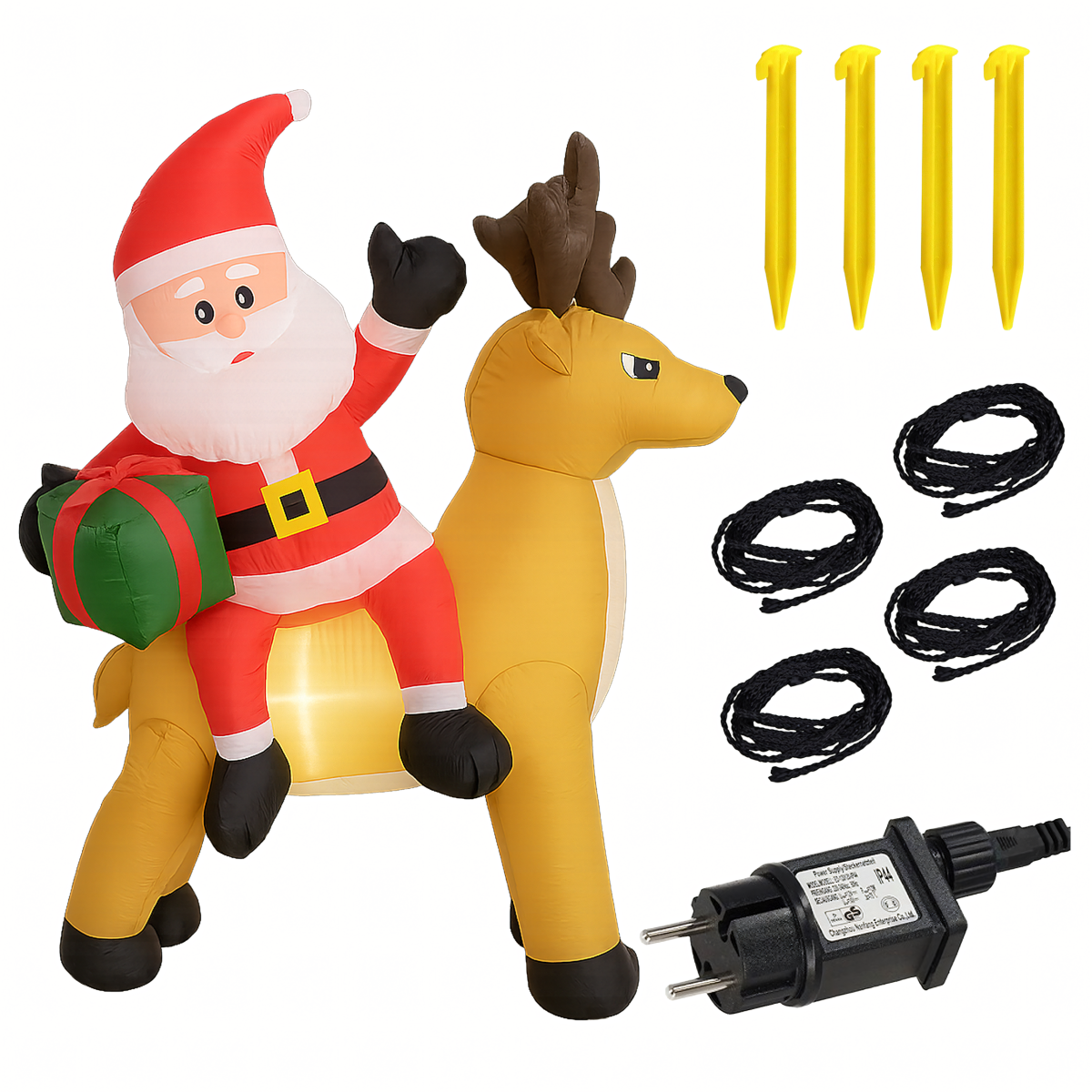 Piepūšams Ziemassvētku vecītis ar ziemeļbriedi 1,5 m ir efektīva svētku dekorācija, kas apgaismos jūsu māju un dārzu.