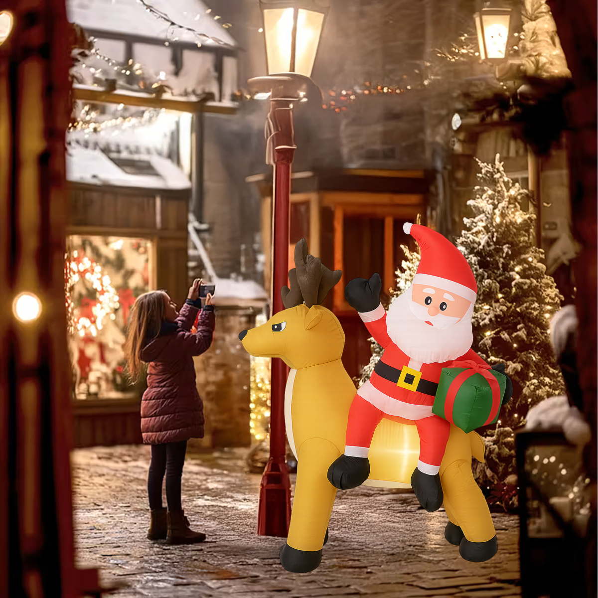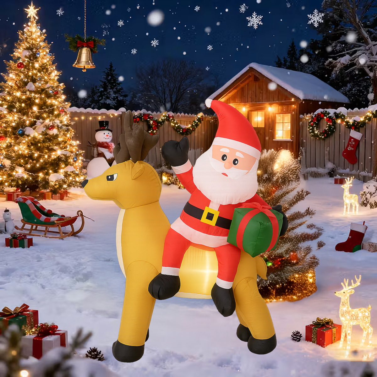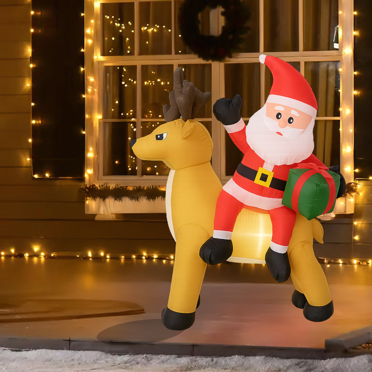 Piepūšams Ziemassvētku vecītis ar ziemeļbriedi 1,5 m ir efektīva svētku dekorācija, kas apgaismos jūsu māju un dārzu.