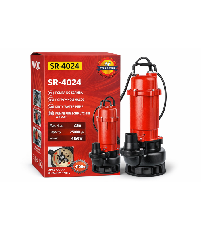 STAR ROXER SR-4024 WQD ir profesionāls, augstas jaudas iegremdējamais sūknis, kas paredzēts netīra ūdens, notekūdeņu un fekāliju sūknēšanai. Iekārta ir pielāgota intensīvai lietošanai mājsaimniecībās, saimniecībās, fermās un būvniecības objektos, kur nepieciešama augsta veiktspēja un uzticamība.