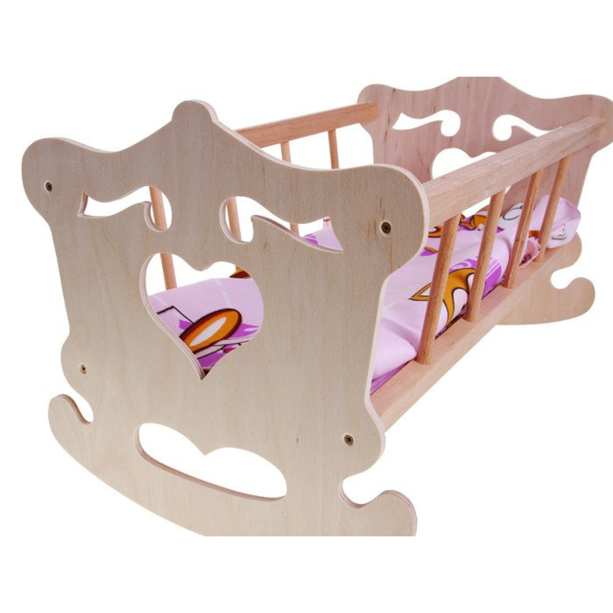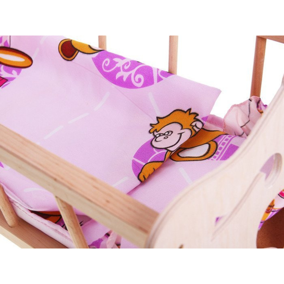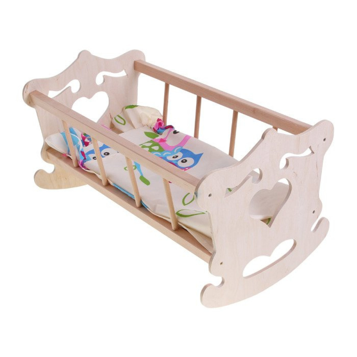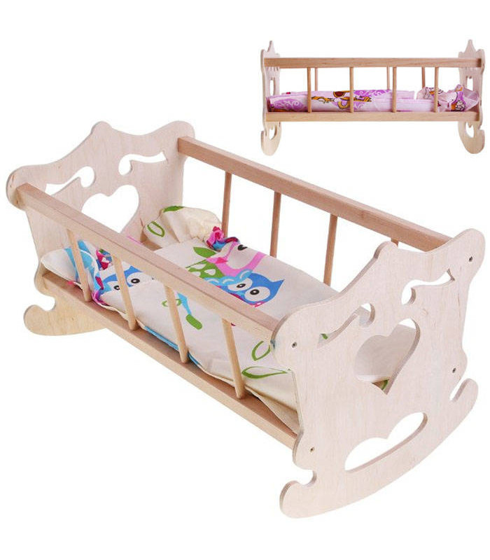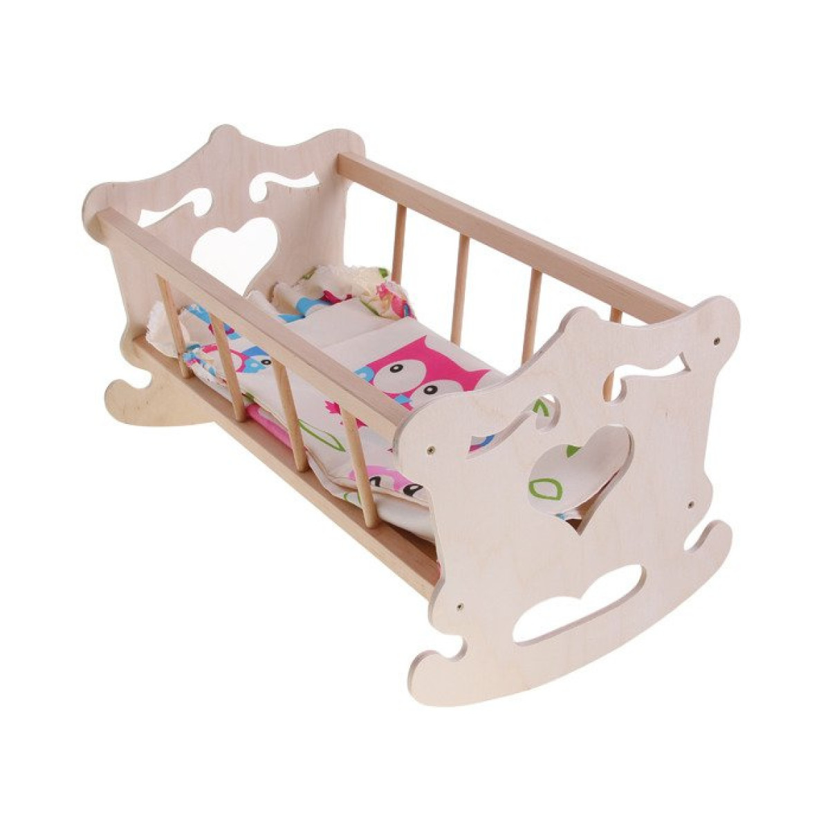 Šūpulis ir pilnībā izgatavots no dabīga, nekrāsota koka, un tam ir auduma gultas veļa lellēm vai rotaļu lācīšiem.