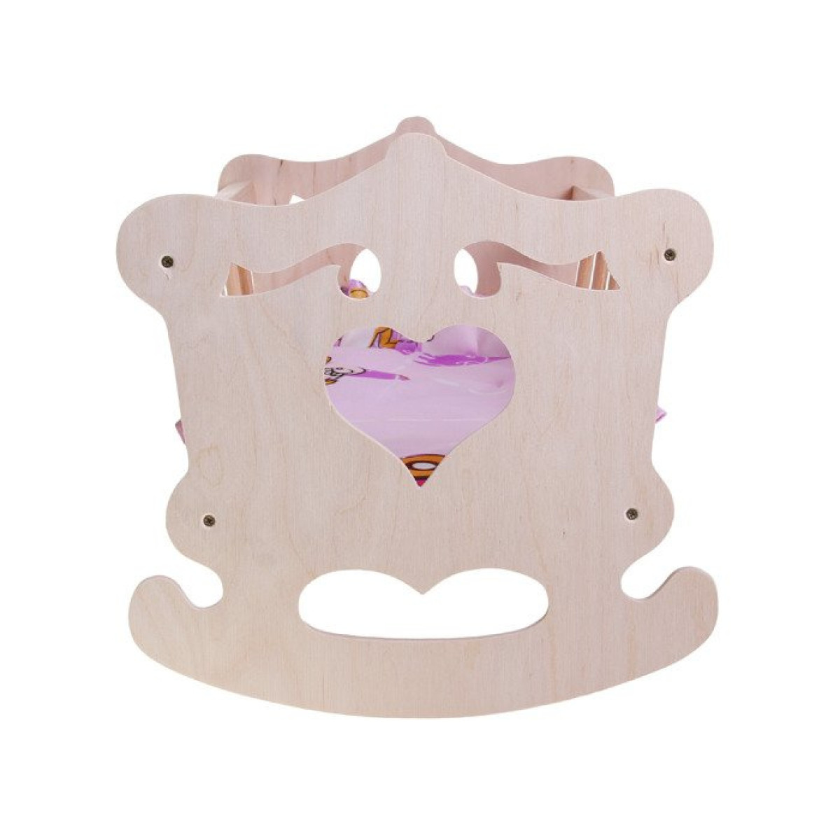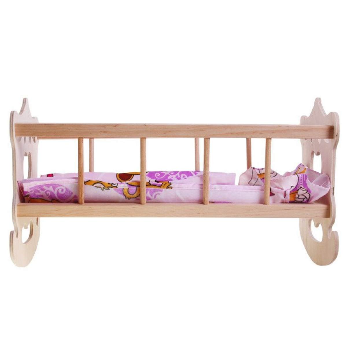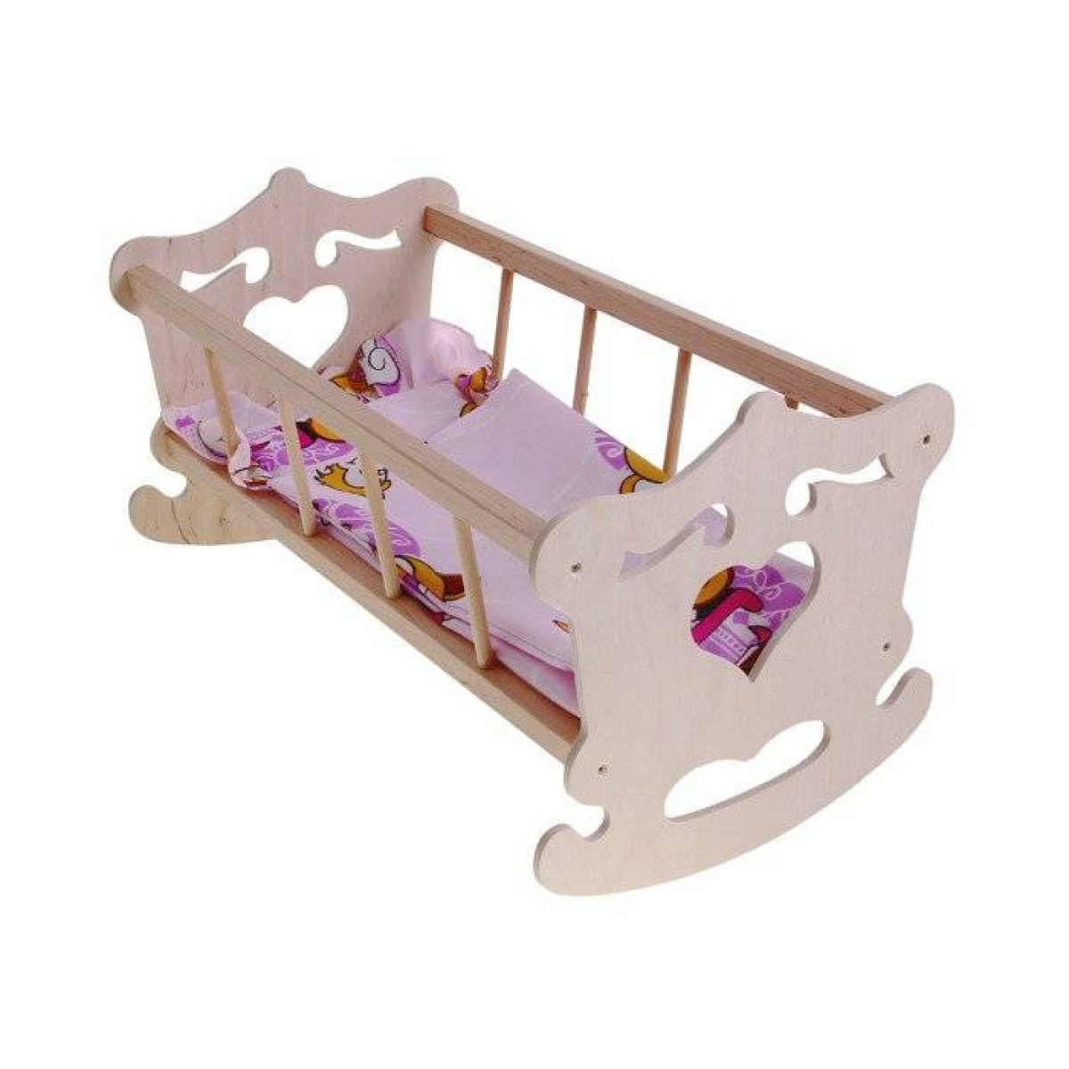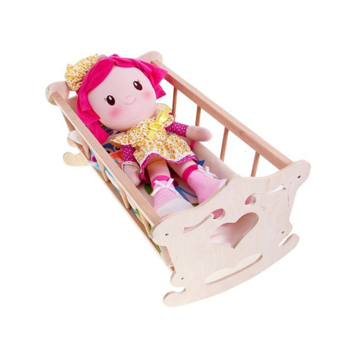 Šūpulis ir pilnībā izgatavots no dabīga, nekrāsota koka, un tam ir auduma gultas veļa lellēm vai rotaļu lācīšiem.