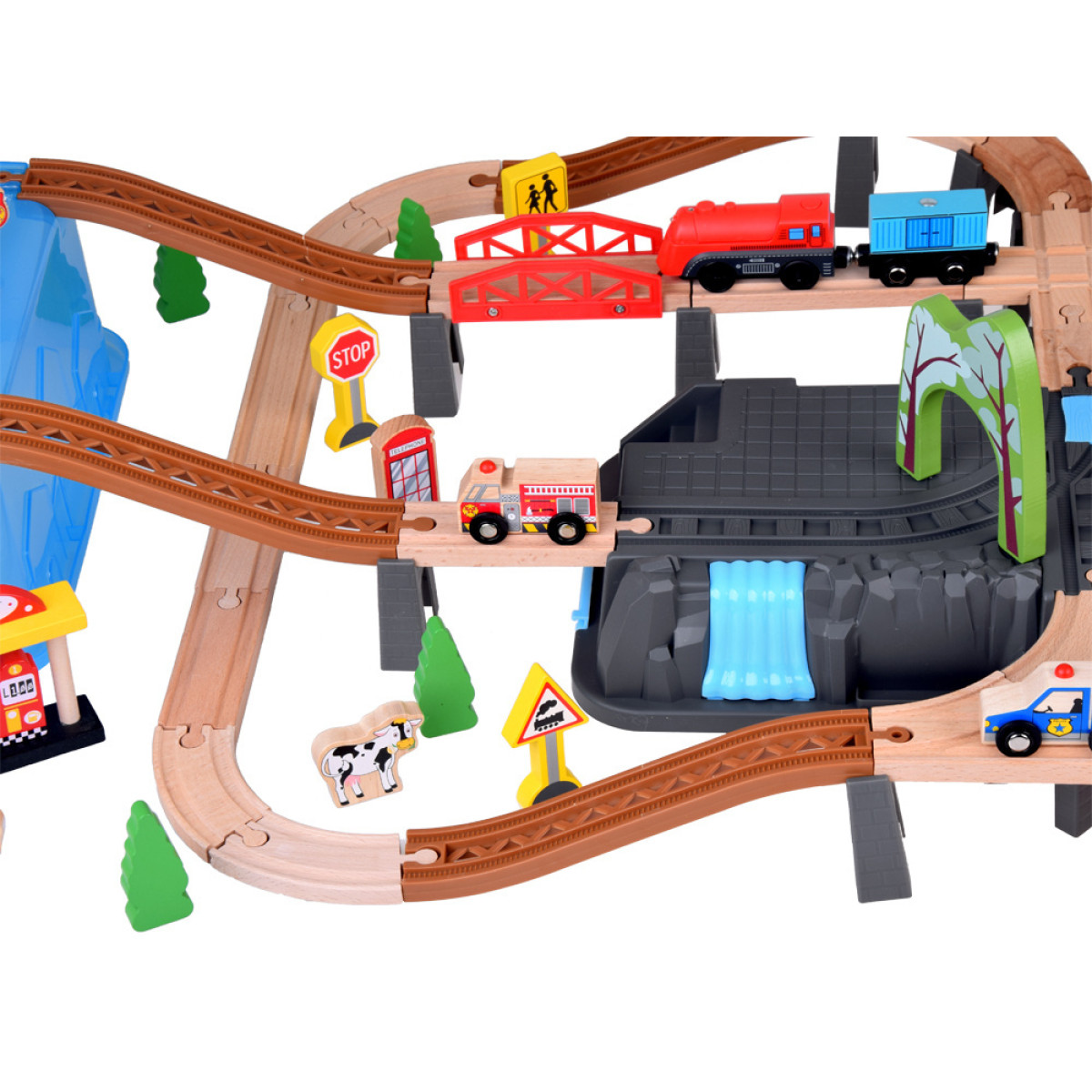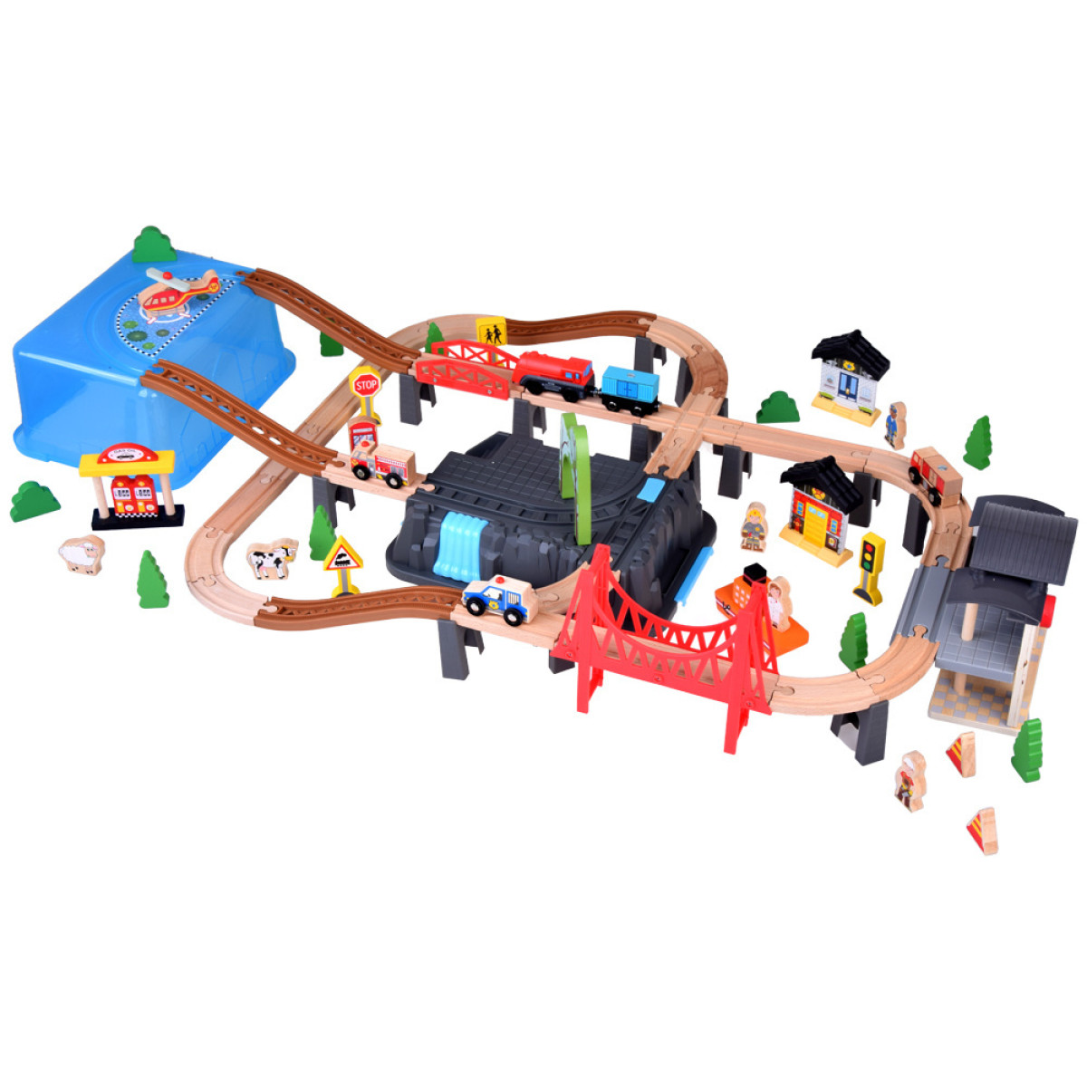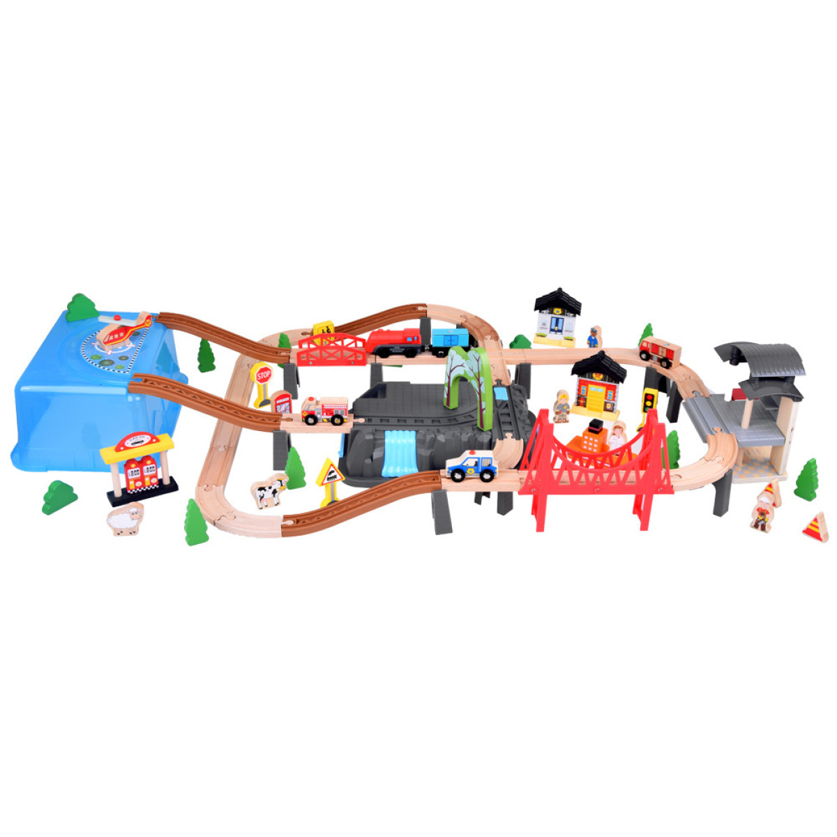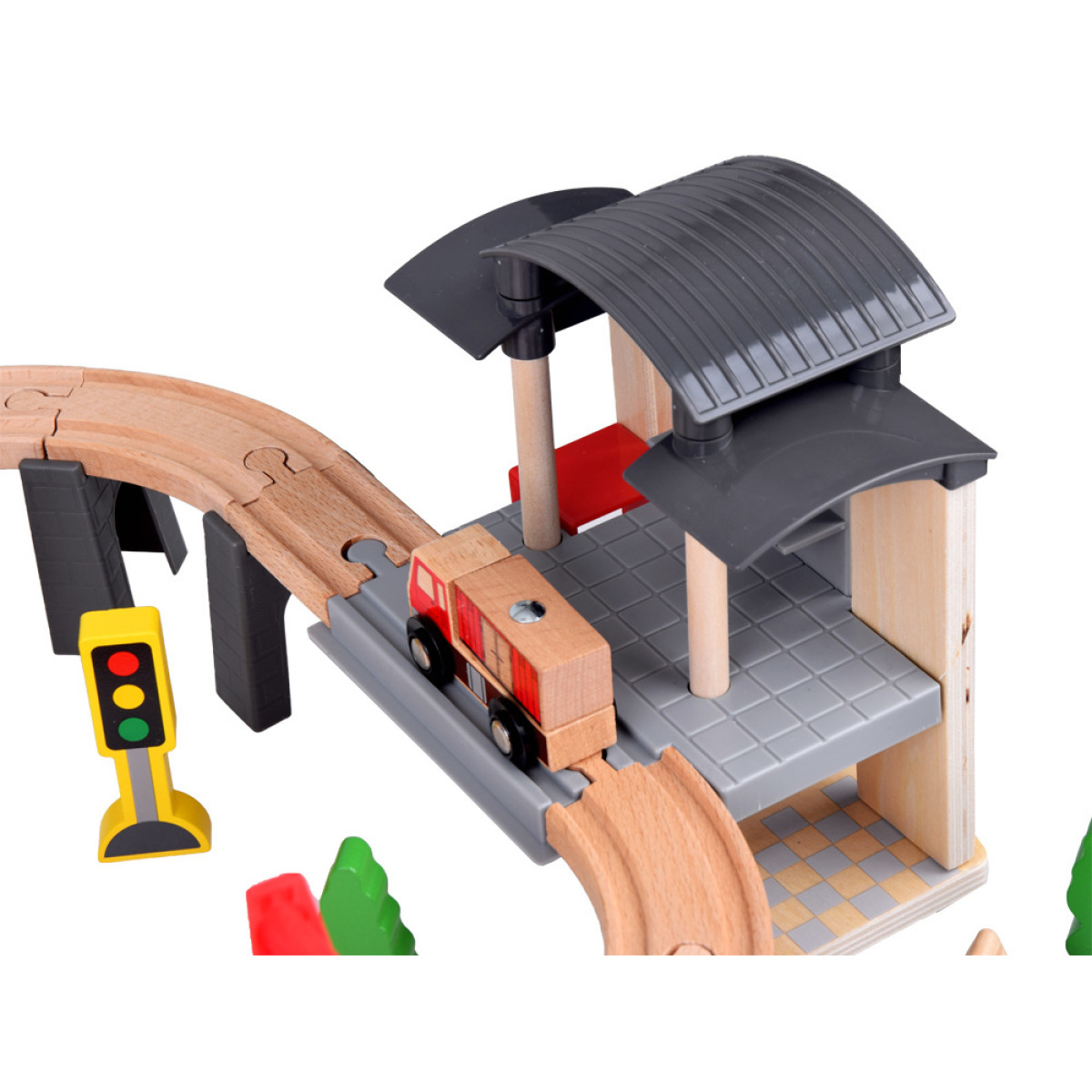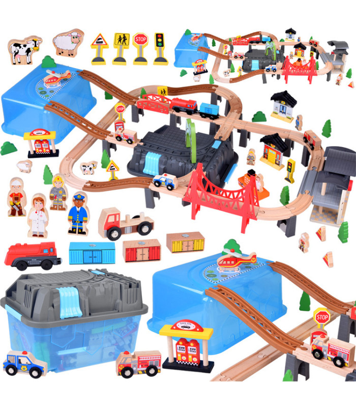 Koka vilciena komplekts ar blokiem ir pilnīga pasaule, kas pilna ar izklaidi un radošumu! Komplektā ir 100 elementi, kas ietver tiltus, tuneļus, dzelzceļa stacijas, transportlīdzekļus, kā arī cilvēku un dzīvnieku figūras. Visa komplekta mērķis ir izveidot savu pilsētu ar dzelzceļu, kas ir bagātināts ar iespaidīgiem elementiem, piemēram, lidostu ar helikopteru. Visi elementi ir izgatavoti no koka, padarot komplektu izturīgu un drošu bērniem.