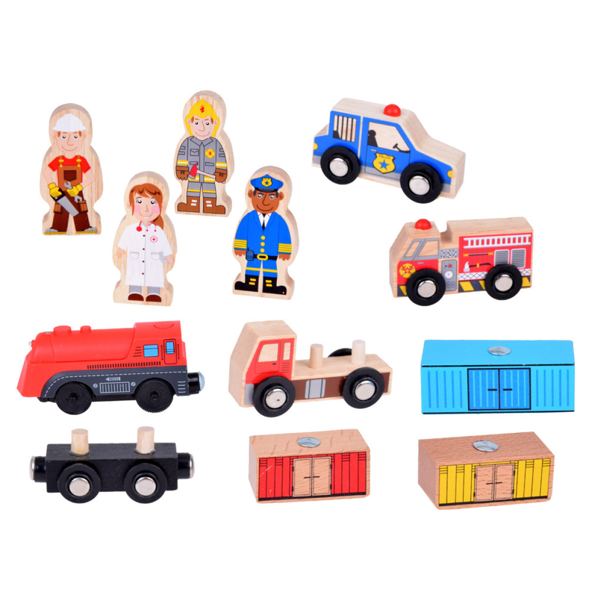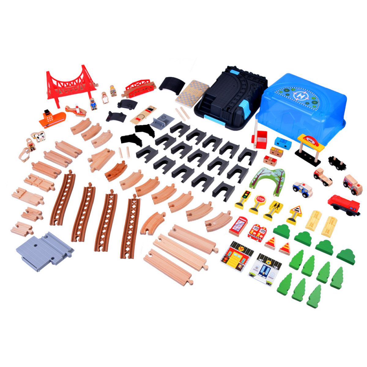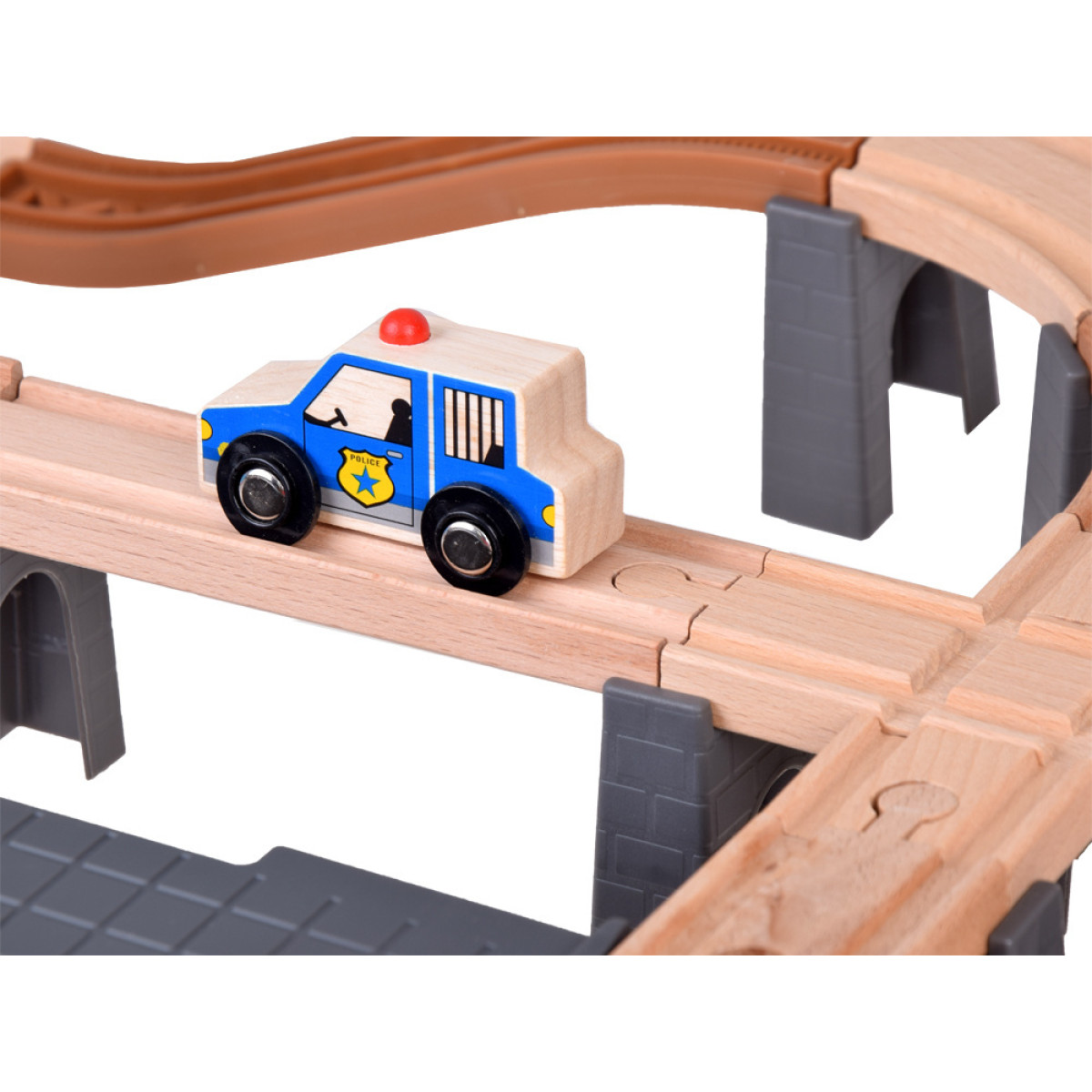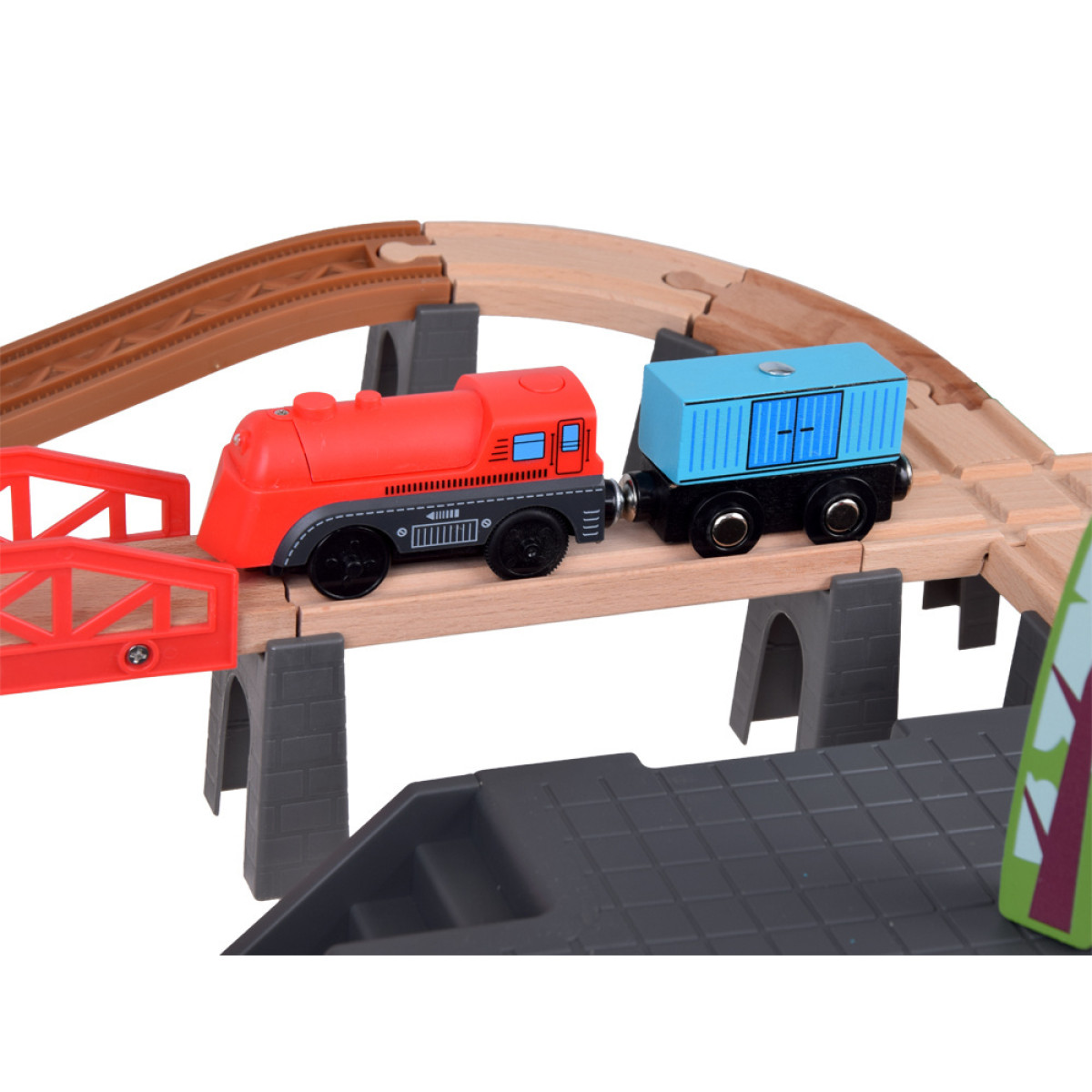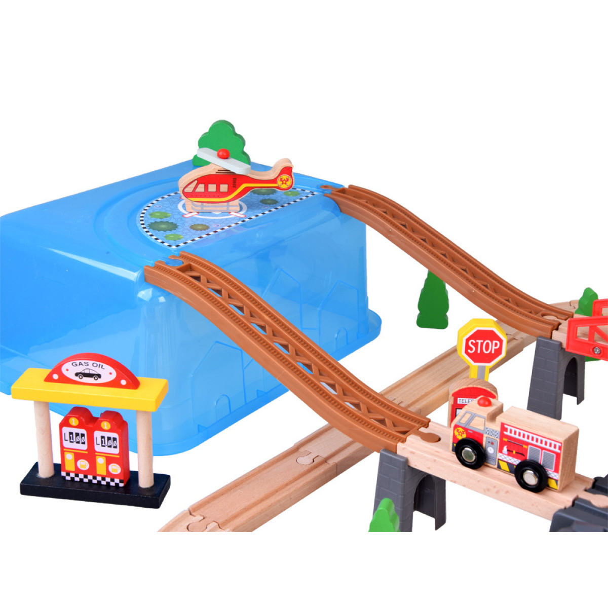 Koka vilciena komplekts ar blokiem ir pilnīga pasaule, kas pilna ar izklaidi un radošumu! Komplektā ir 100 elementi, kas ietver tiltus, tuneļus, dzelzceļa stacijas, transportlīdzekļus, kā arī cilvēku un dzīvnieku figūras. Visa komplekta mērķis ir izveidot savu pilsētu ar dzelzceļu, kas ir bagātināts ar iespaidīgiem elementiem, piemēram, lidostu ar helikopteru. Visi elementi ir izgatavoti no koka, padarot komplektu izturīgu un drošu bērniem.