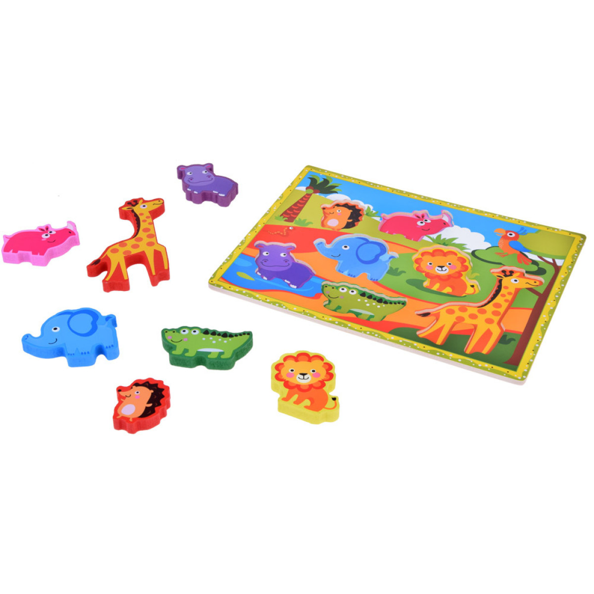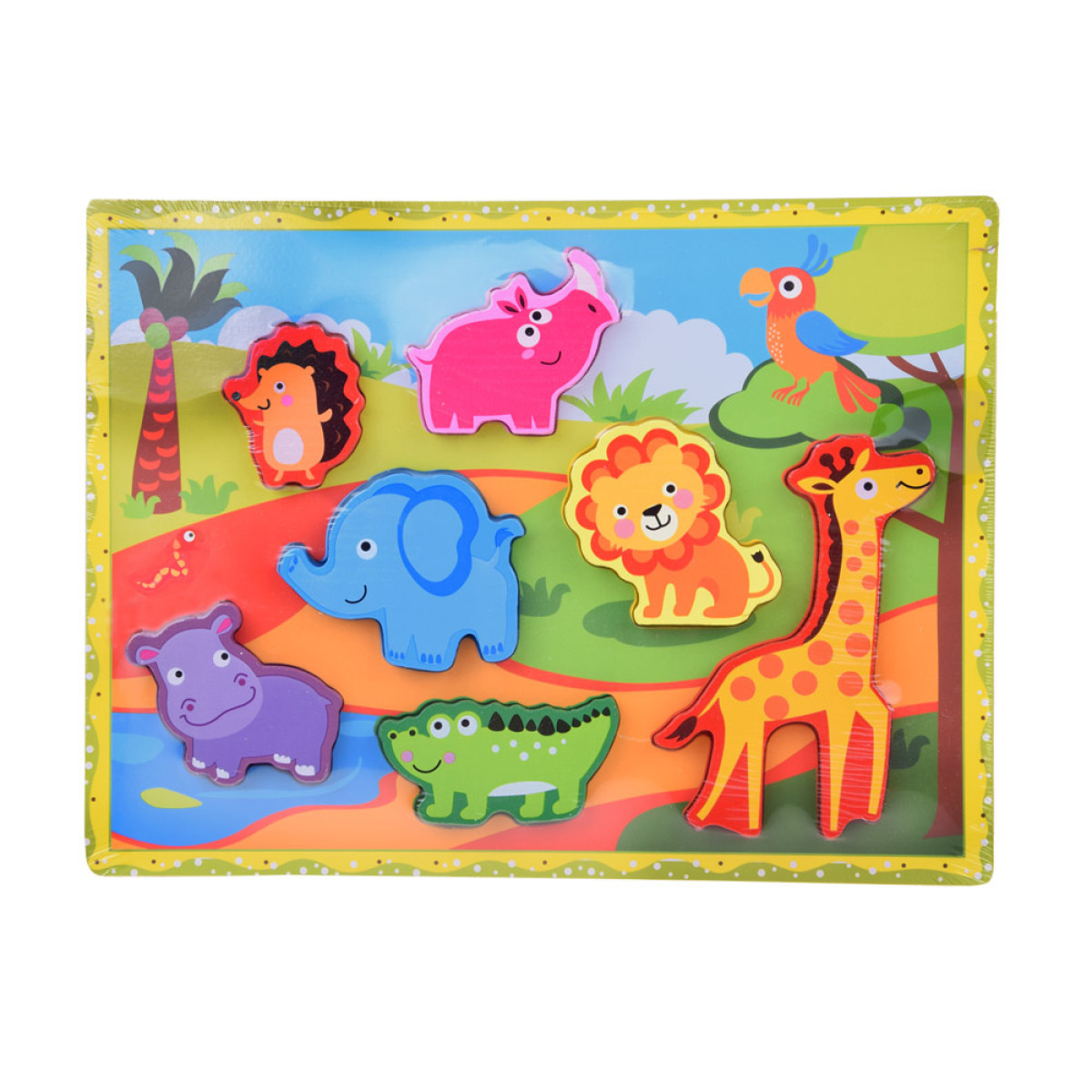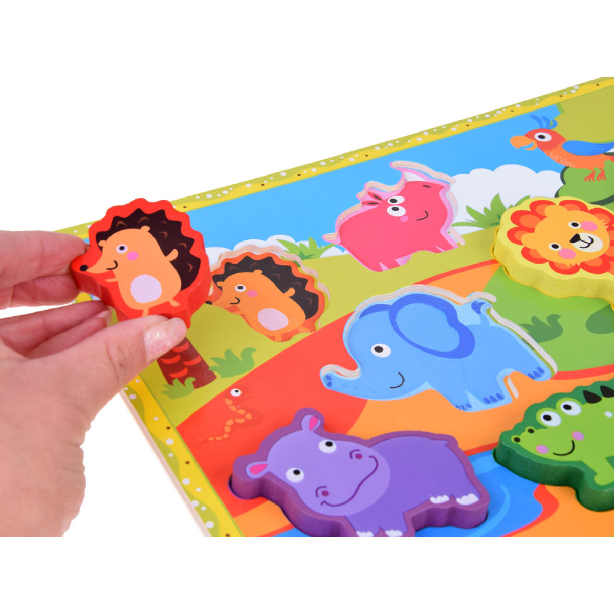 Koka puzle apvieno spēli un izglītību. Krāsainie attēli un jautri, smaidīgi dzīvnieki mudina bērnu spēlēties.