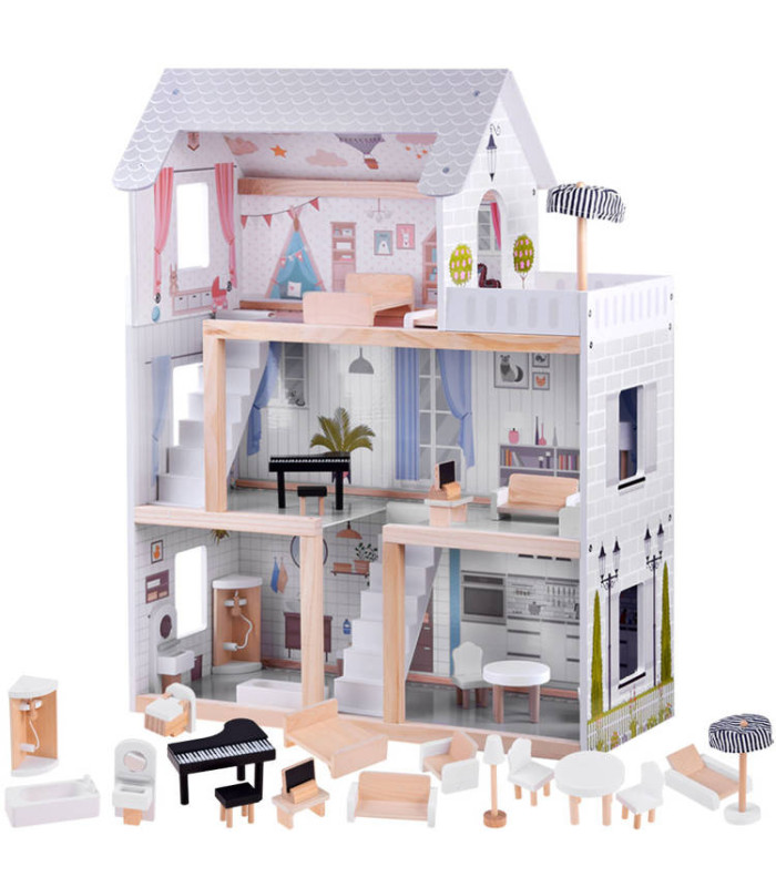 Koka leļļu māja ar mēbelēm ir ļoti stilīga villa boho stilā. Trīs stāvu villa sastāv no četriem plašiem numuriem, terases un kāpnēm. Mājas krāsu gamma ir ļoti mierīga, stilīga, aicinoša dzīvot. Mēbeles telpās ir saglabātas baltā un koka krāsu gammā, kas vēl vairāk izceļ telpu stilīgumu. Plašas telpas ir apgaismotas ar mierīgu LED gaismu. Šādā villā katrs jutīsies komfortabli.