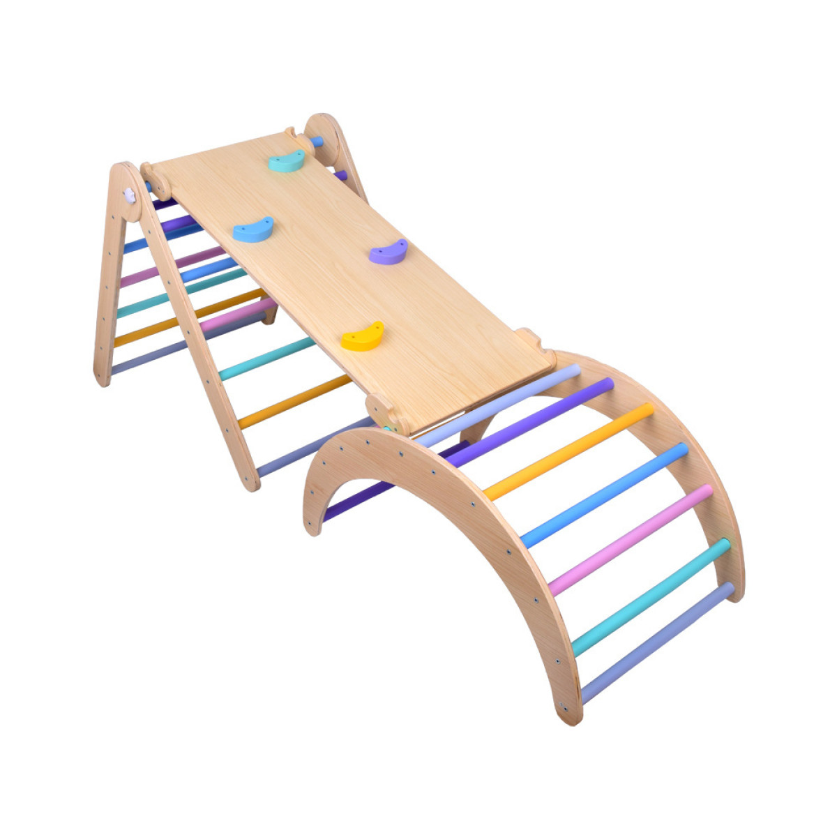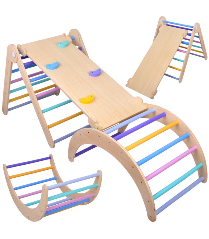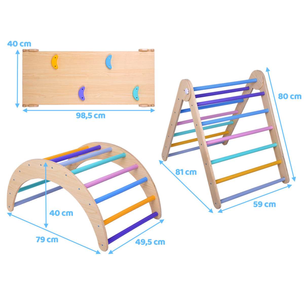 Prieks, kustība, izaugsme! Šis Montessori kāpšanas komplekts sastāv no kāpšanas trijstūra, kāpšanas loka un rampas. Katru elementu var izmantot atsevišķi vai kombinācijā, piedāvājot bērniem neierobežotas radošās spēles iespējas.