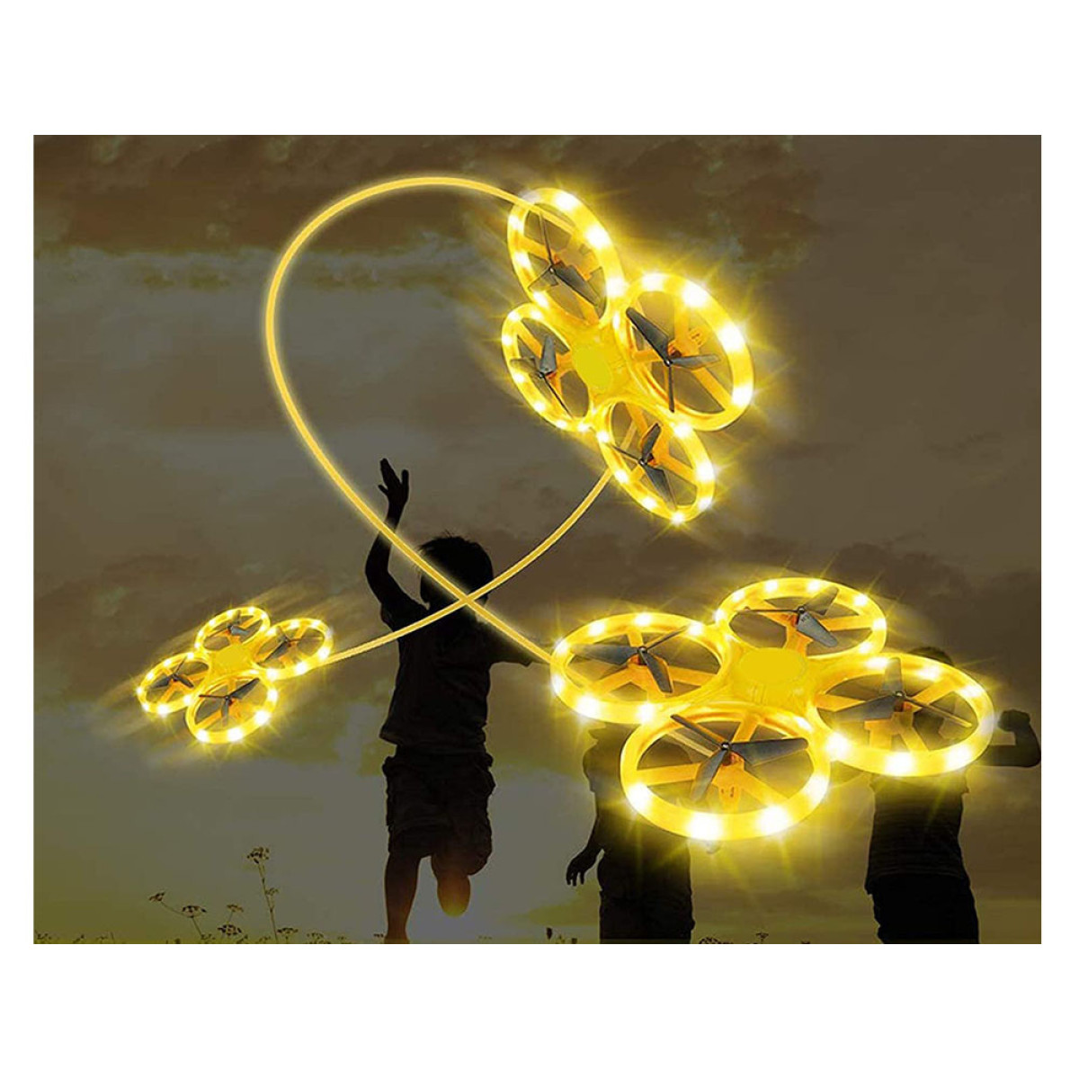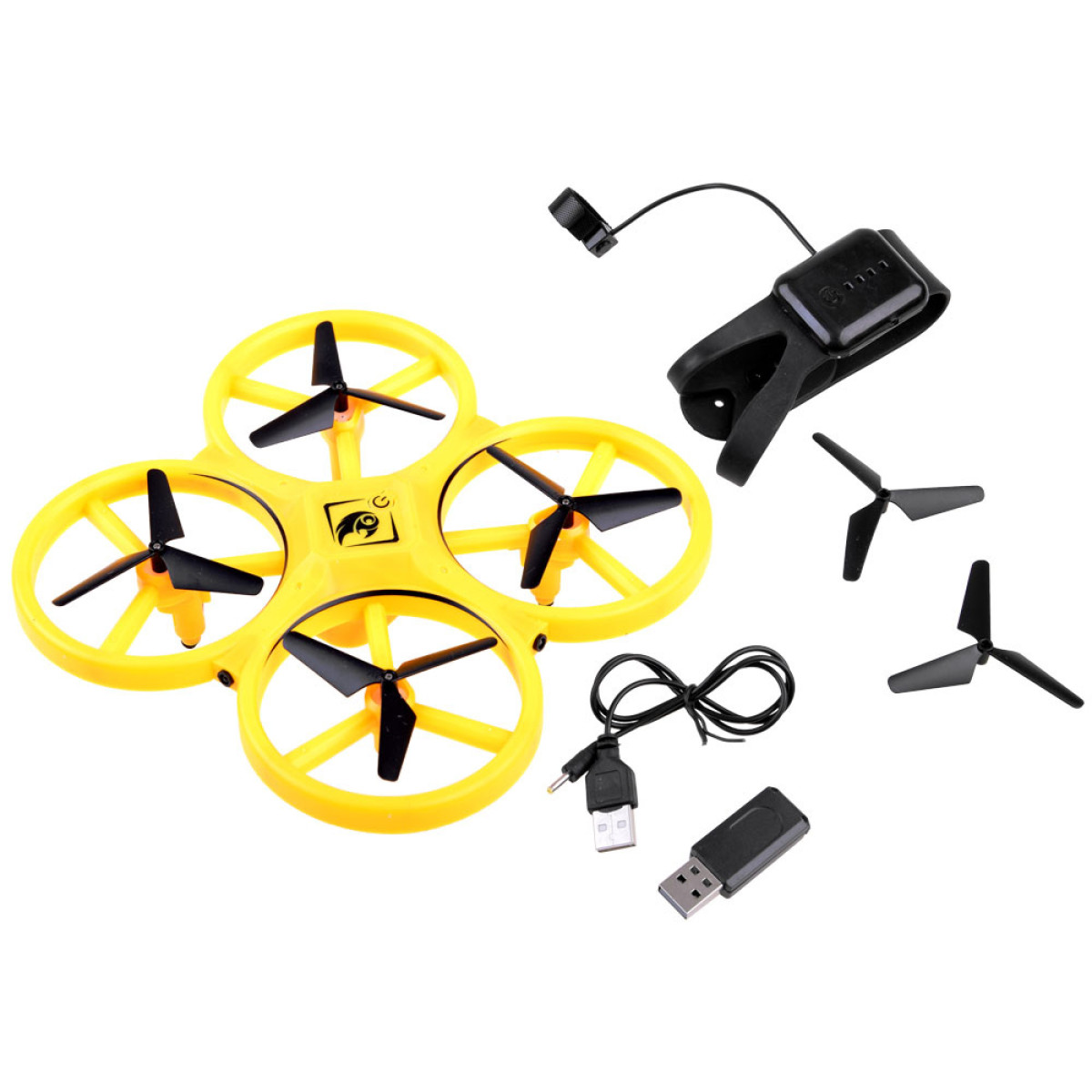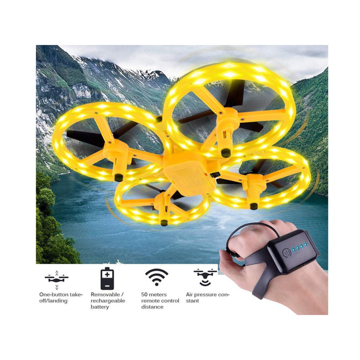 Pakilęs dronas išlieka ore ir sukasi aplink savo ašį 360 laipsnių. Apyrankė dedama ant rankos, perstumus ją tarp nykščio ir uždedant dirželį su mygtuku ant rodomojo piršto. Silikoninėje apyrankėje yra 12 lygių pločio reguliavimas, tinkantis visiems. Žaislas yra lengvas, todėl greitai pakyla į orą, o keturi priešpriešiniai sraigtai padidina jo stabilumą.