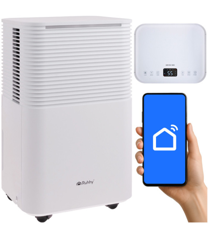 Oro sausintuvas RUHHY Tai tikras galingas oro sausintuvas, idealiai tinkantis didelėms, maždaug 30 m² patalpoms. Dėl automatinio režimo, laikmačio ir „Wi-Fi“ valdymo galite lengvai palaikyti optimalų drėgmės lygį . Tylus veikimas (38 dB), kompaktiškas dydis ir tokios funkcijos kaip automatinis atitirpinimas leidžia šį įrenginį naudoti miegamuosiuose, rūsiuose ir pagalbinėse patalpose.