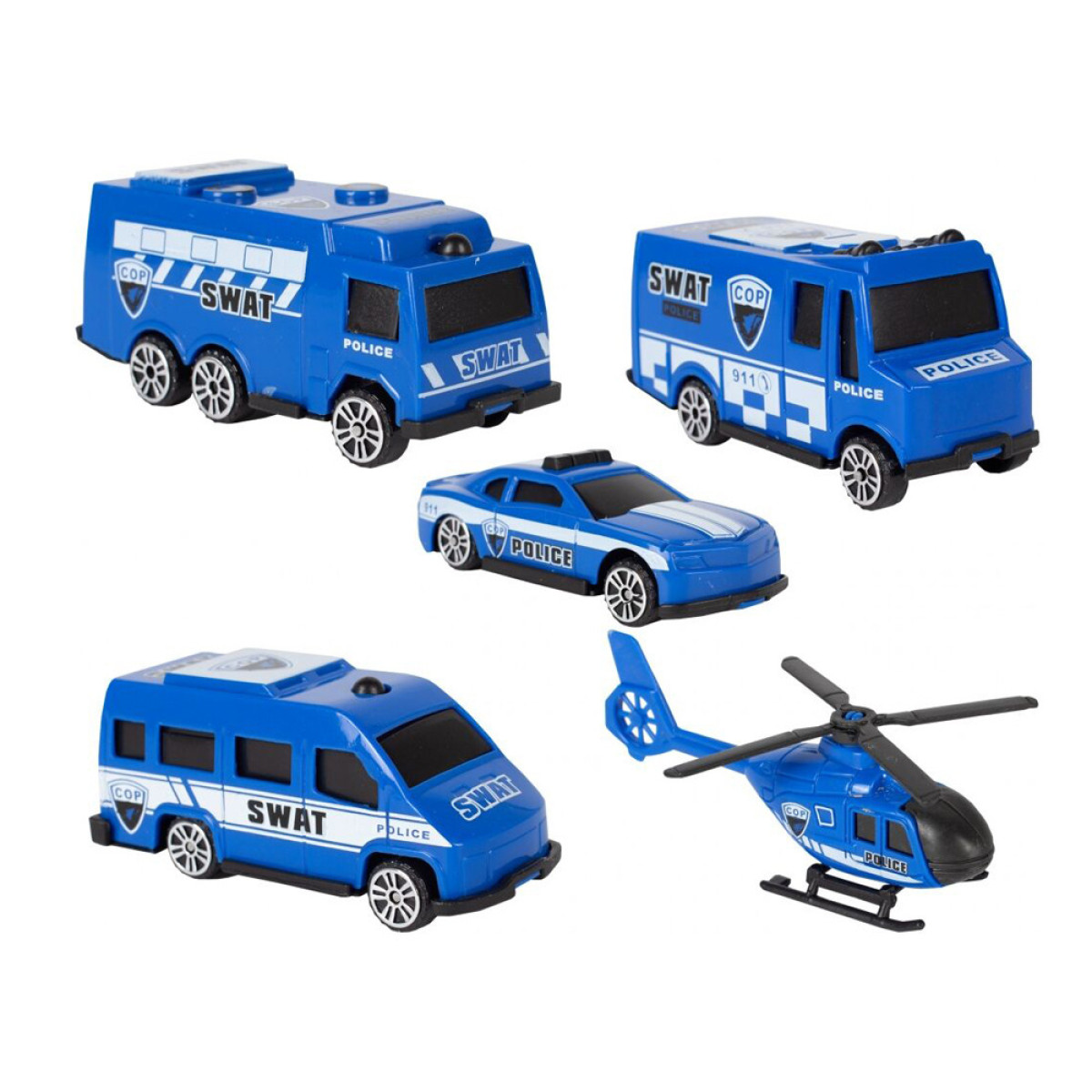 - Policijas automašīnas: aptuveni 7 x 3 x 3 cm