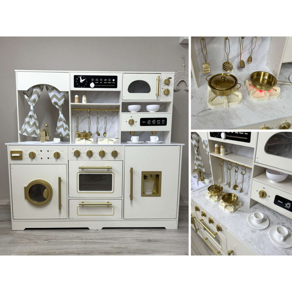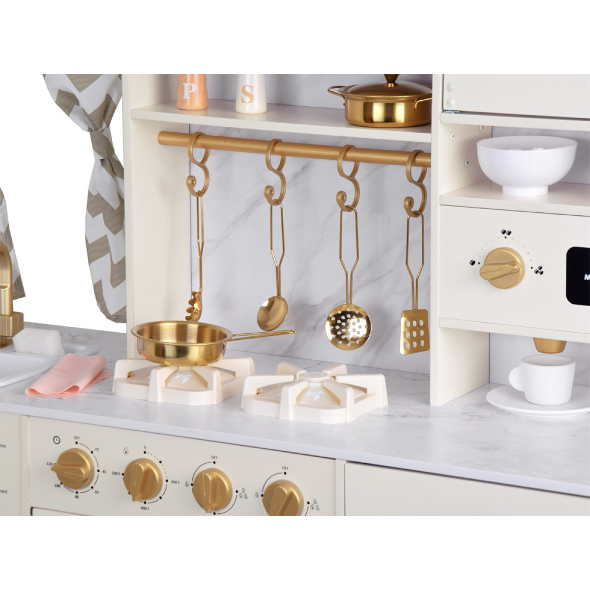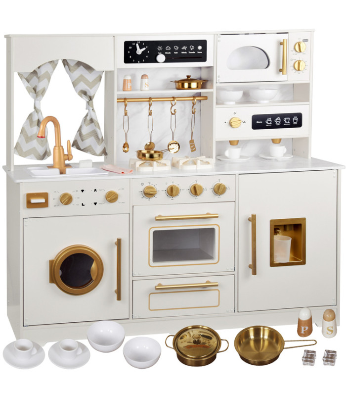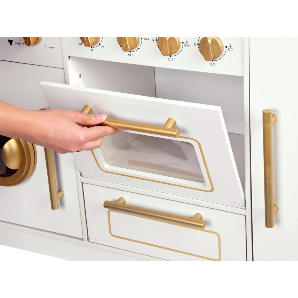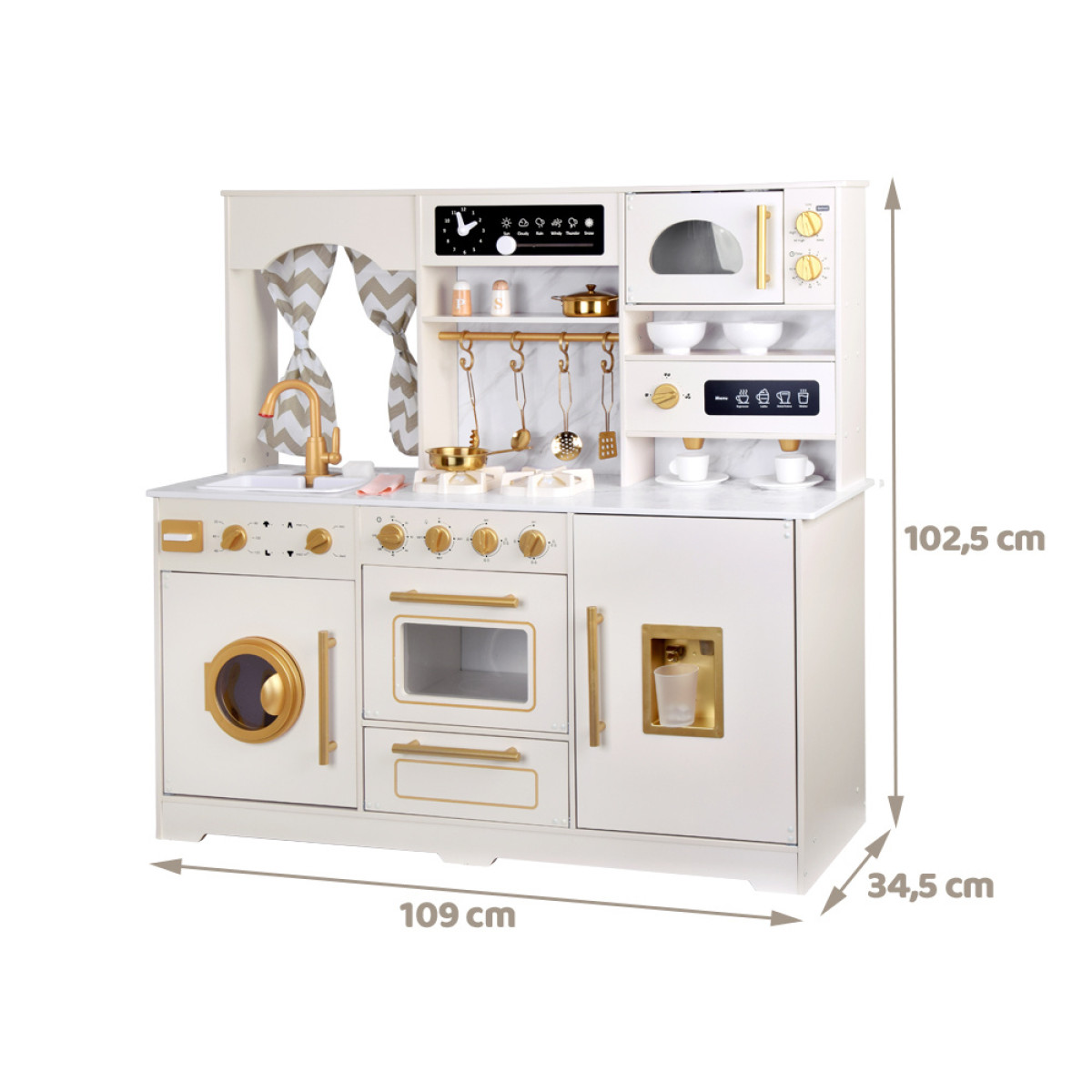 Stilīgā koka virtuve ar elegantu glamour stilu un dekoratīviem zelta akcentiem ir izcils risinājums ikvienam mazajam pavāram – un arī vecākiem, kas novērtē estētiku un augstu kvalitāti! Tā lieliski iekļaujas gaišos interjeros, kā arī patiks koka, marmora un elegantu detaļu cienītājiem. Moderns dizains un reālistiskas funkcijas padara šo rotaļlietu ne tikai par prieka avotu, bet arī par skaistu bērnistabas dekoru.