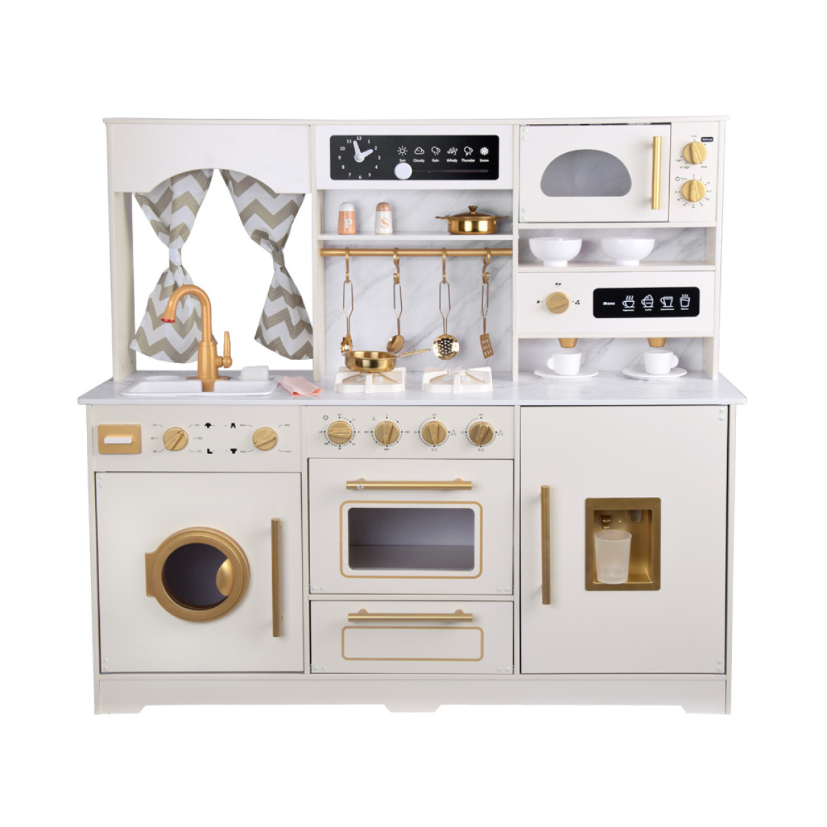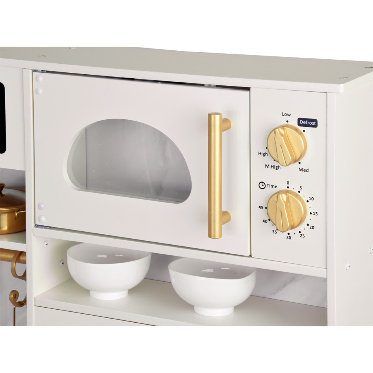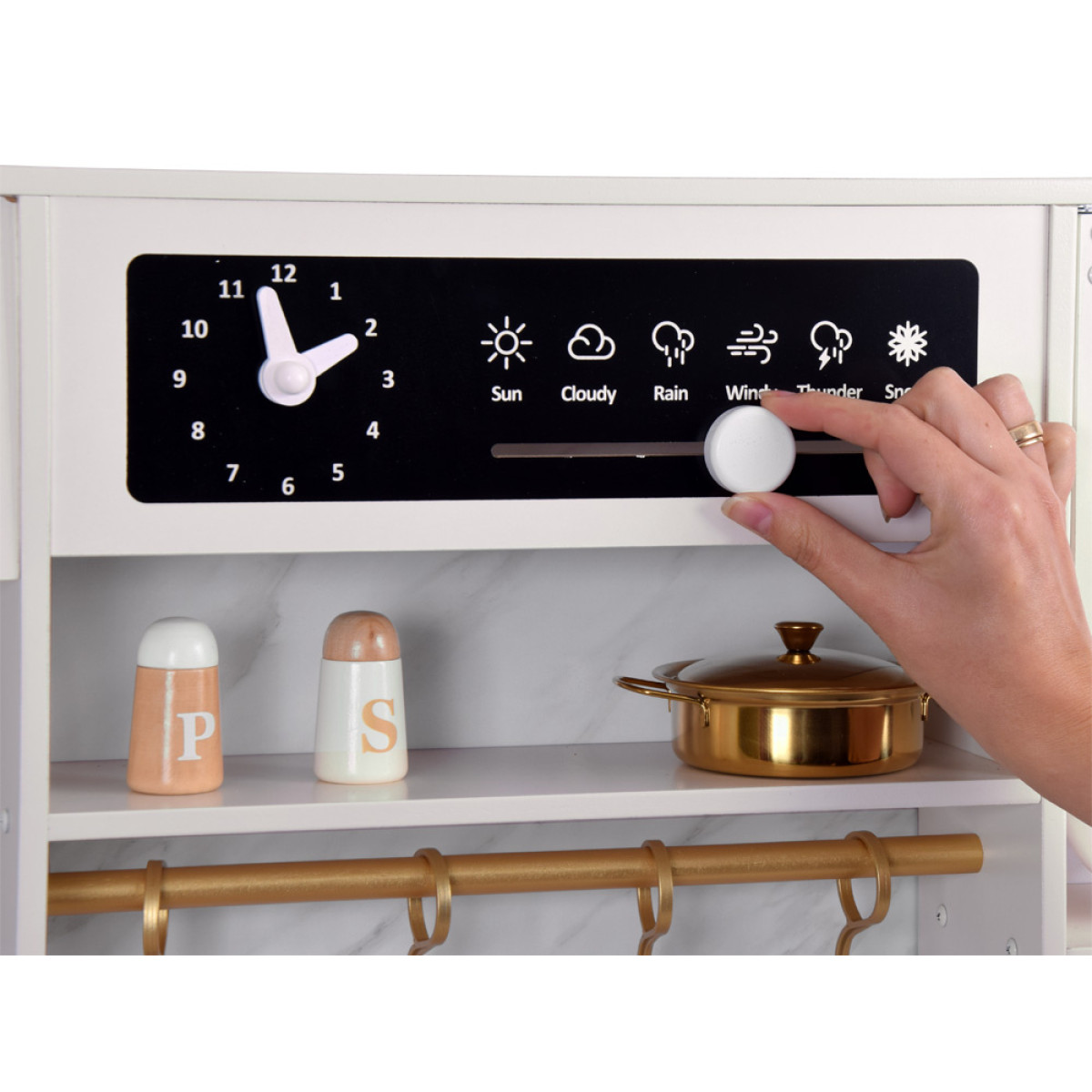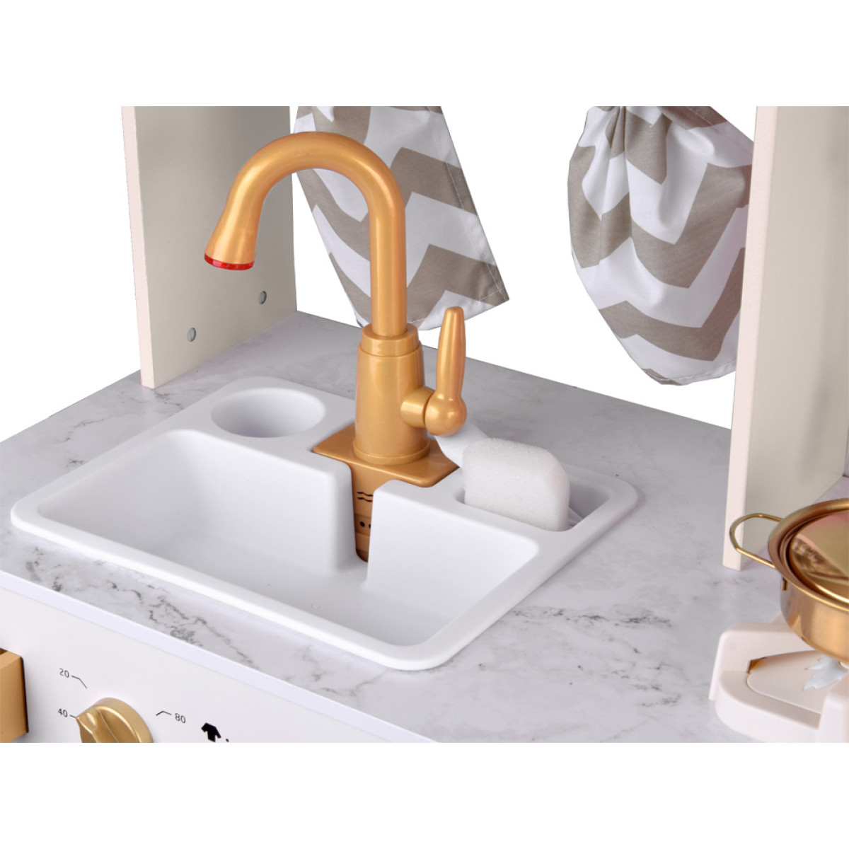 Stilīgā koka virtuve ar elegantu glamour stilu un dekoratīviem zelta akcentiem ir izcils risinājums ikvienam mazajam pavāram – un arī vecākiem, kas novērtē estētiku un augstu kvalitāti! Tā lieliski iekļaujas gaišos interjeros, kā arī patiks koka, marmora un elegantu detaļu cienītājiem. Moderns dizains un reālistiskas funkcijas padara šo rotaļlietu ne tikai par prieka avotu, bet arī par skaistu bērnistabas dekoru.