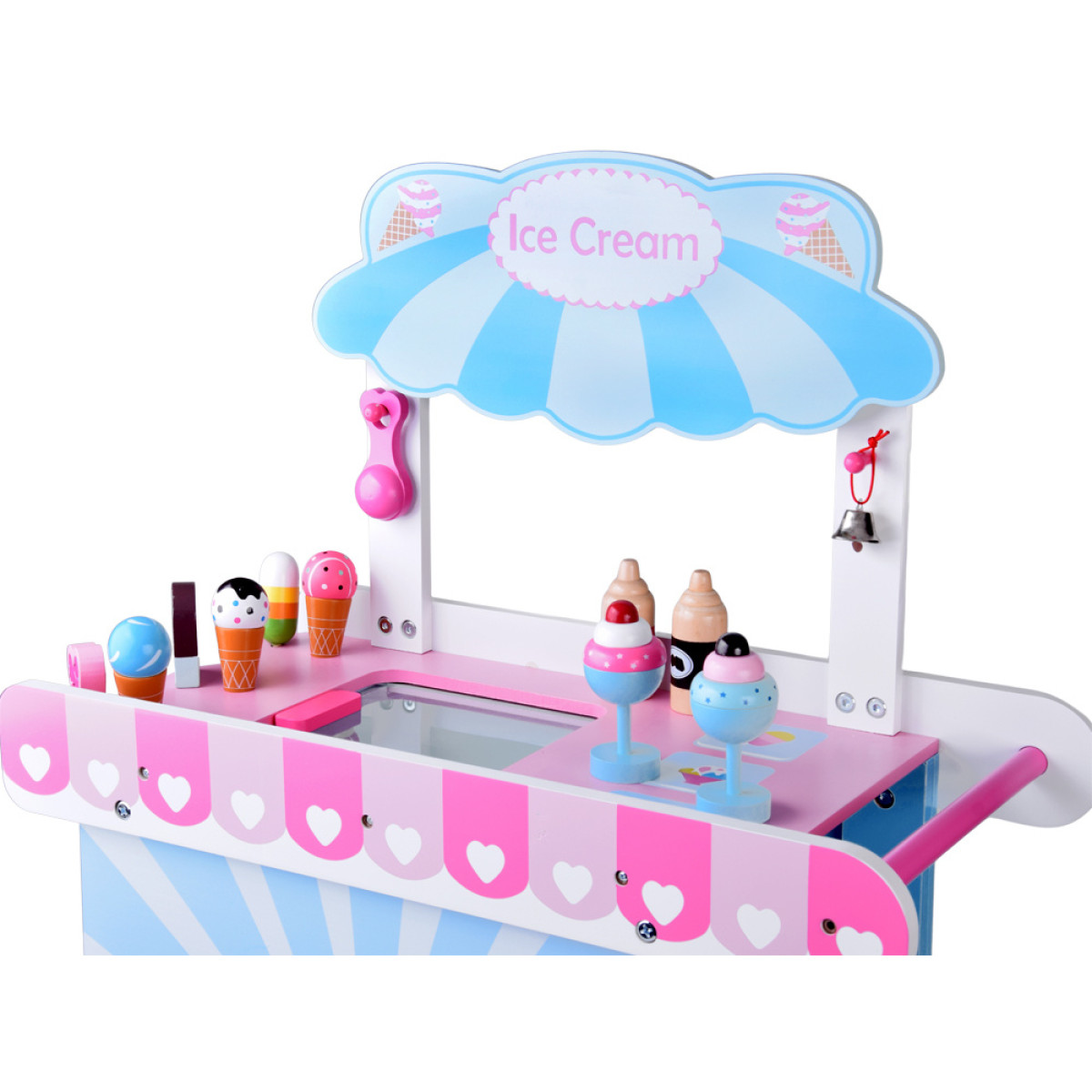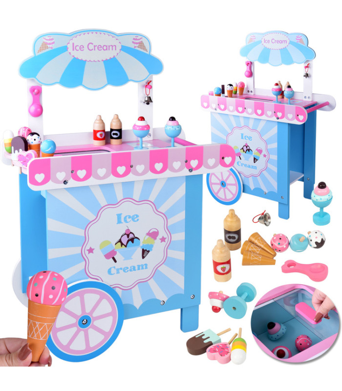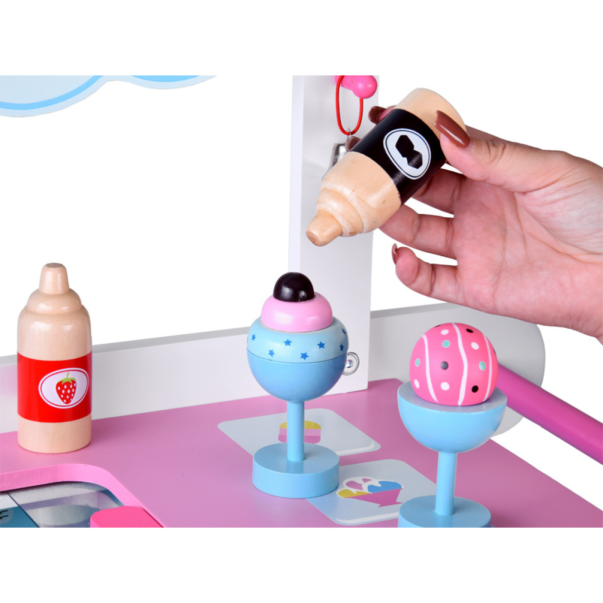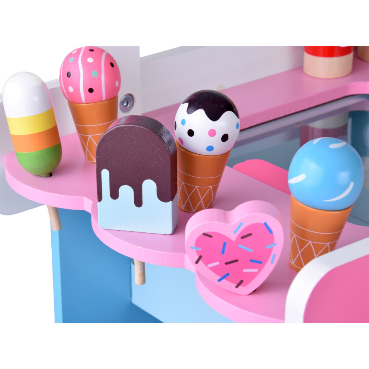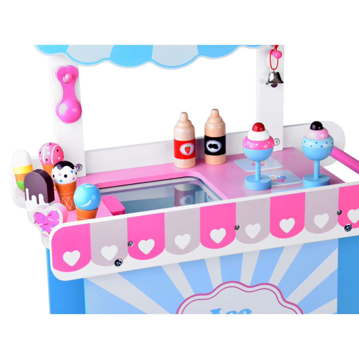 Šis burvīgais, pilnībā no koka veidotais saldējuma kiosks ir īsts prieks maziem veikalu un konditorejas spēļu cienītājiem. Ar lielu rūpību izstrādāts, tas piesaista uzmanību ar skaistu pasteļkrāsu gammu rozā un zilā toņos, kas lieliski iederas jebkurā bērnu istabā.