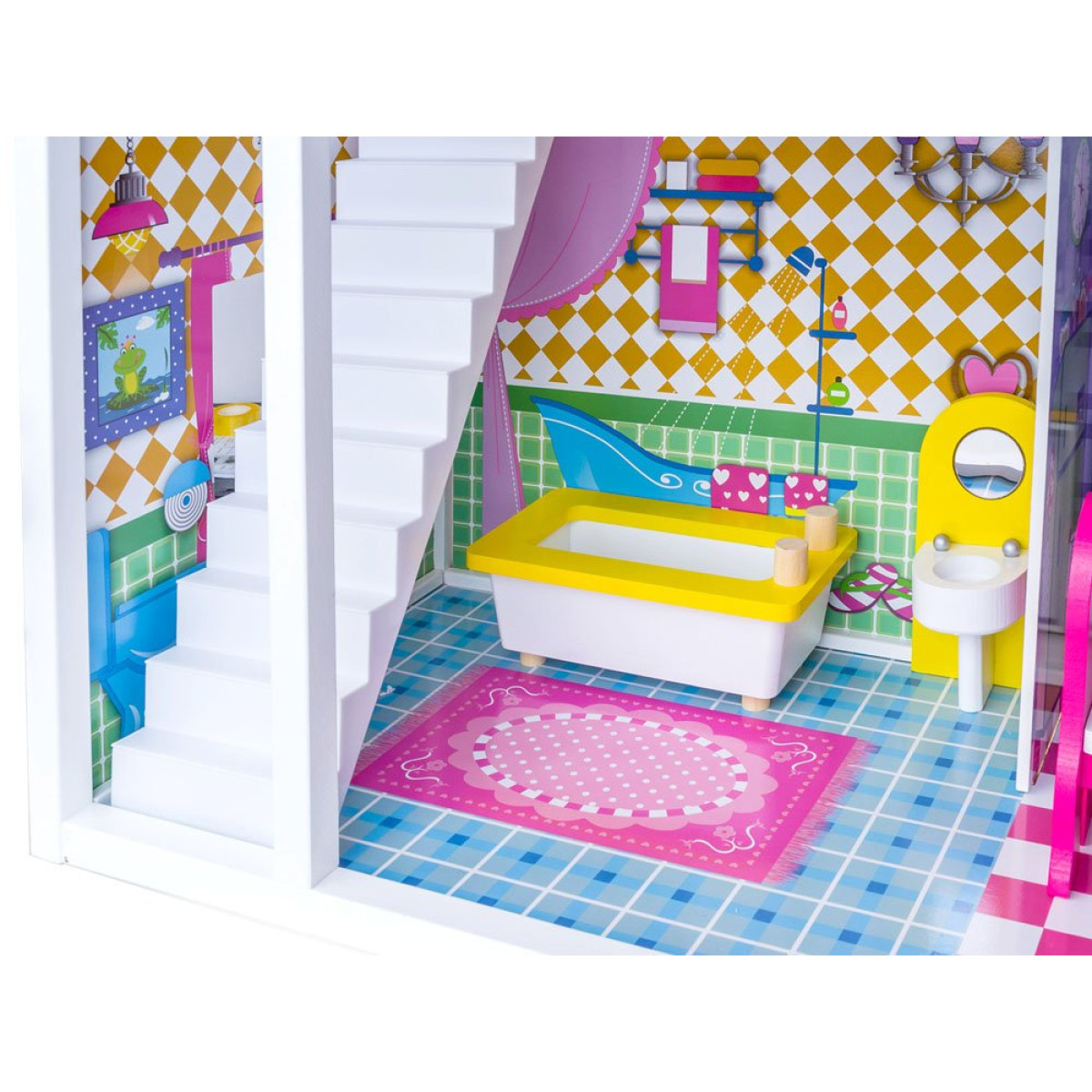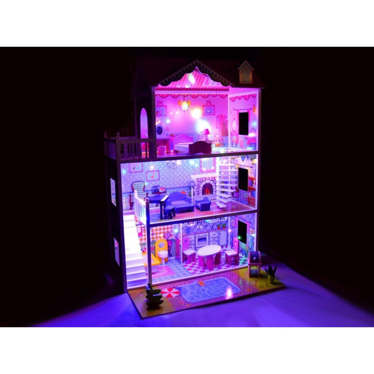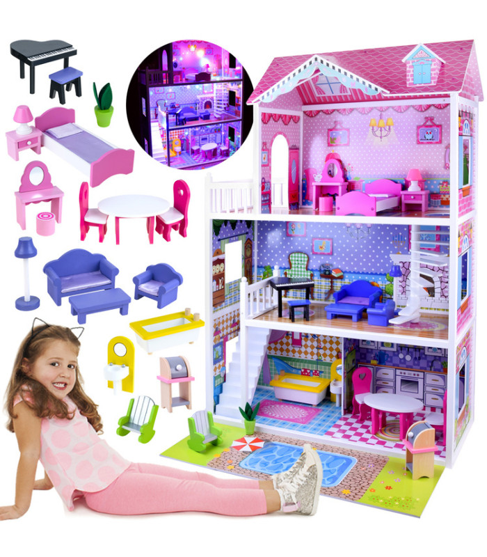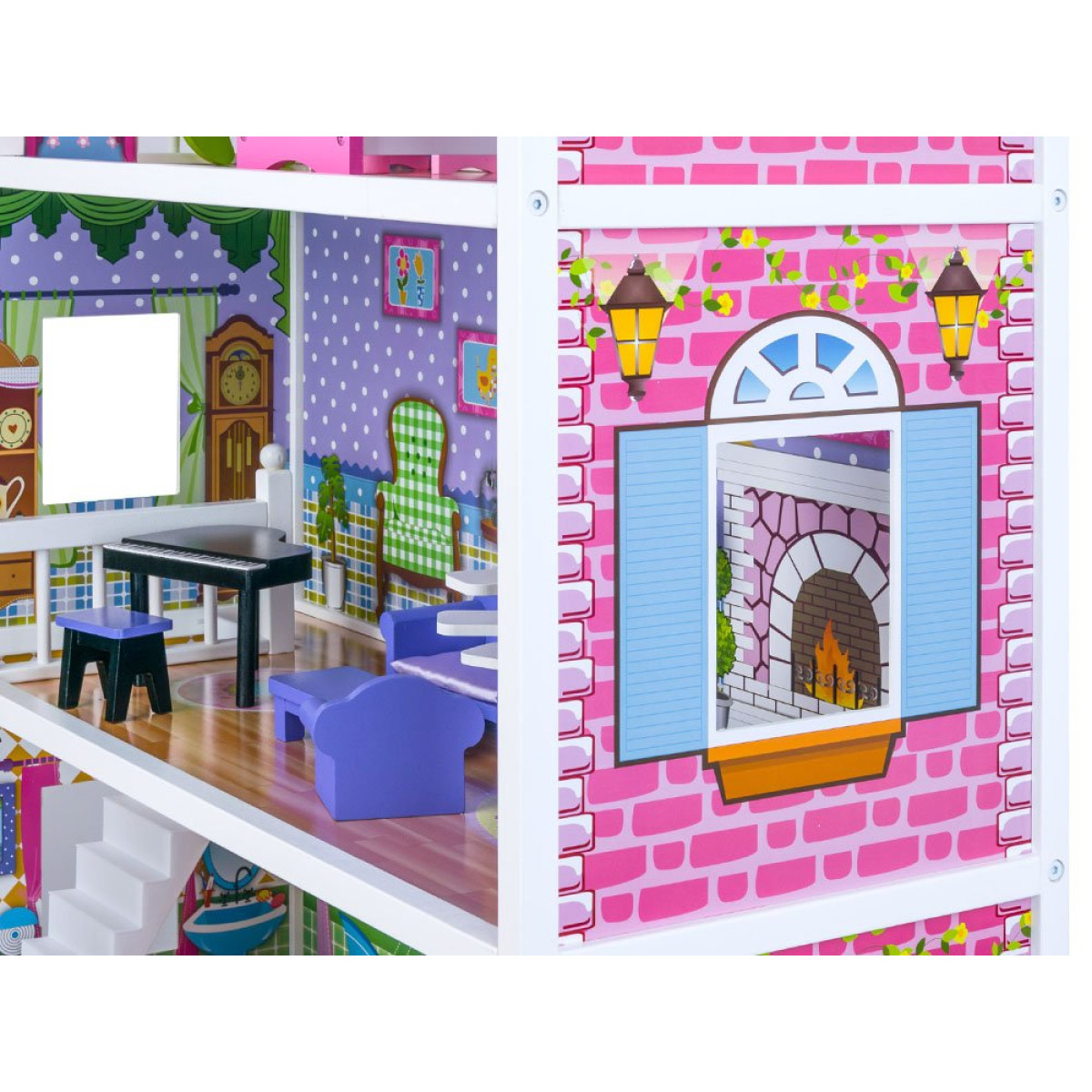 Burvīgs un krāsains leļļu mājas komplekts, kas ir katras meitenes sapnis. Trīsstāvu koka leļļu namiņš ir pilnībā aprīkots ar plašiem numuriem, kur var nepārtraukti pārkārtot skaistas koka mēbeles un aksesuārus. LED apgaismojums piešķir neatkārtojamu efektu, radot maģisku atmosfēru.