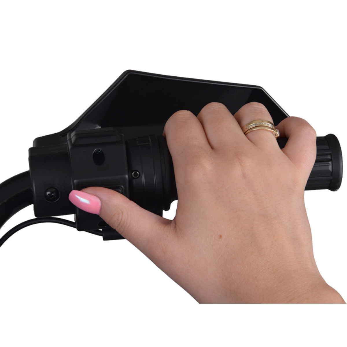Blakus ir braukšanas virziena maiņas pārslēgs (priekša-pārtraukt-aizmugure). Lai sāktu braukšanu, jāpagriež rokturis uz stūres, lai bremzētu, jānomet rokturis vai jānospiež kājas bremžu pedālis.