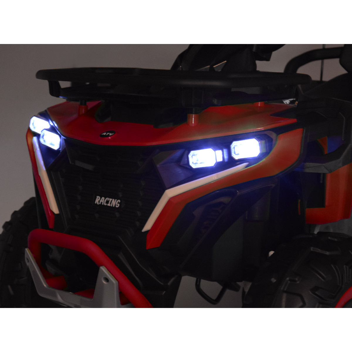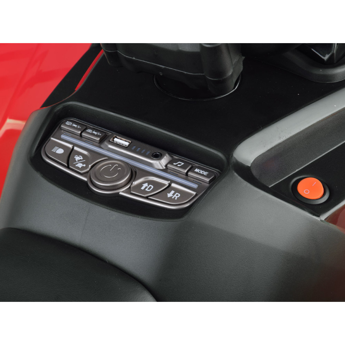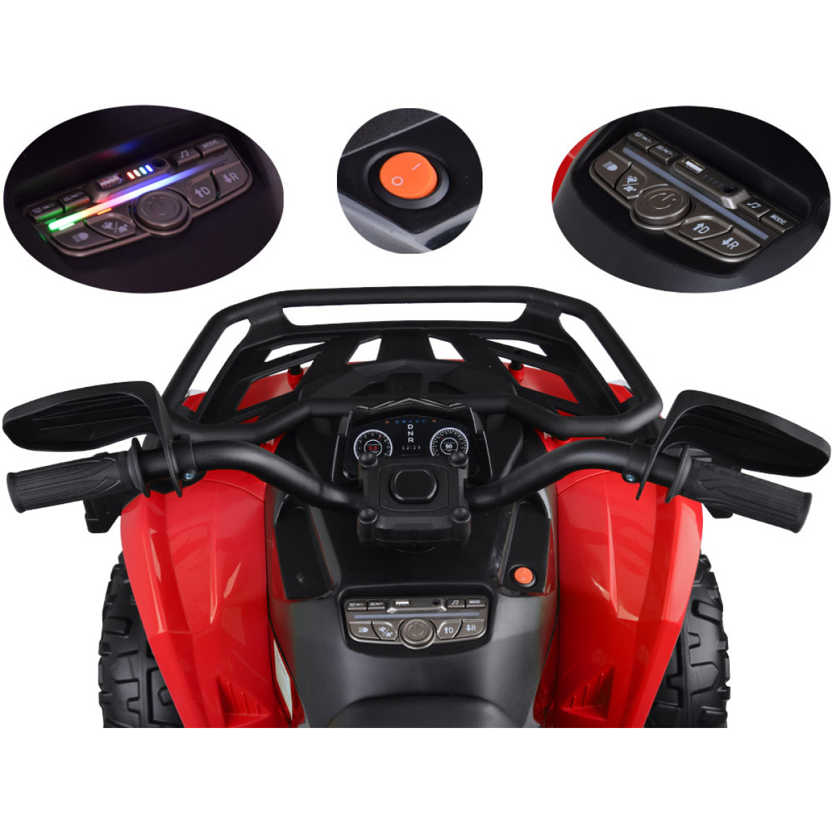 Blakus atrodas braukšanas virziena slēdzis uz priekšu – stop – atpakaļ. Modelim ir arī manuālais rc slēdzis, kas ļauj vadīt kvadraciklu gan manuāli, gan ar tālvadības pulti. Tas ir īpaši noderīgi vecākiem, kuri vēlas uzraudzīt bērna braukšanu un saglabāt kontroli, vienlaikus ļaujot bērnam apgūt patstāvīgu transportlīdzekļa vadīšanu.