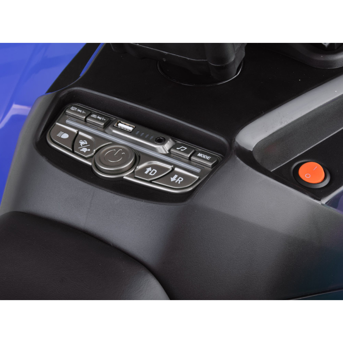 Kvadracikls tiek iedarbināts ar pogu, kam pievienota motora iedarbināšanas skaņa, un automātiski tiek ieslēgts apgaismojums (priekšā+aizmugurē). Blakus atrodas braukšanas virziena maiņas slēdzis (priekšā-stops-aizmugurē). Uz kvadracikla ir sarkans manuālais RC slēdzis, kas ļauj viegli kontrolēt transportlīdzekli – to var vadīt manuāli, kā arī izmantot tālvadības pulti. Tas ir ideāls risinājums vecākiem, kuri vēlas kontrolēt bērna braukšanu, vienlaikus ļaujot bērnam pašam izbaudīt spēli un iemācīties apgūt transportlīdzekli.