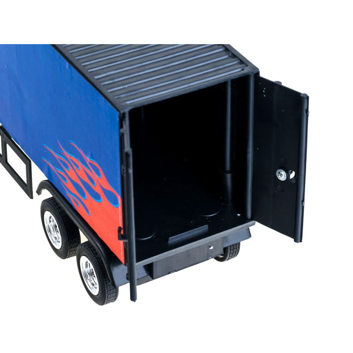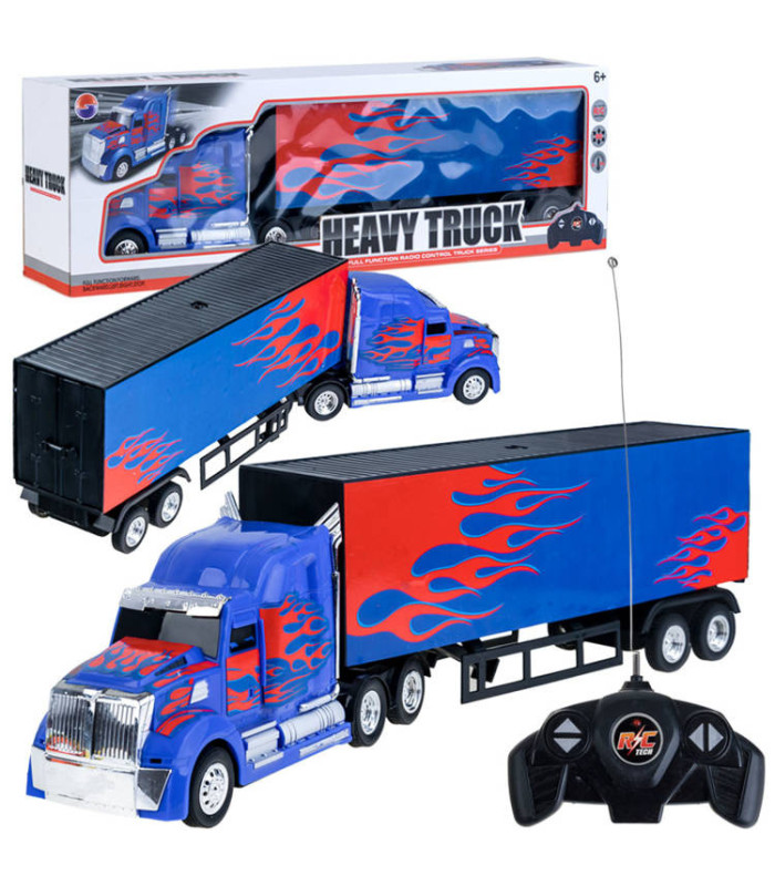 Liels TIR ar piekabi uz tālvadības pults ir lieliska rotaļlieta mazajam autovadītājam. Šī amerikāņu stila kravas automašīna piepildīs jebkura zēna sapņus, kurš ir ieinteresēts automobiļu pasaulē. Lieliska dizaina rotaļlieta ir pieejama tumši zilā un sarkanā krāsā ar liesmu motīvu.