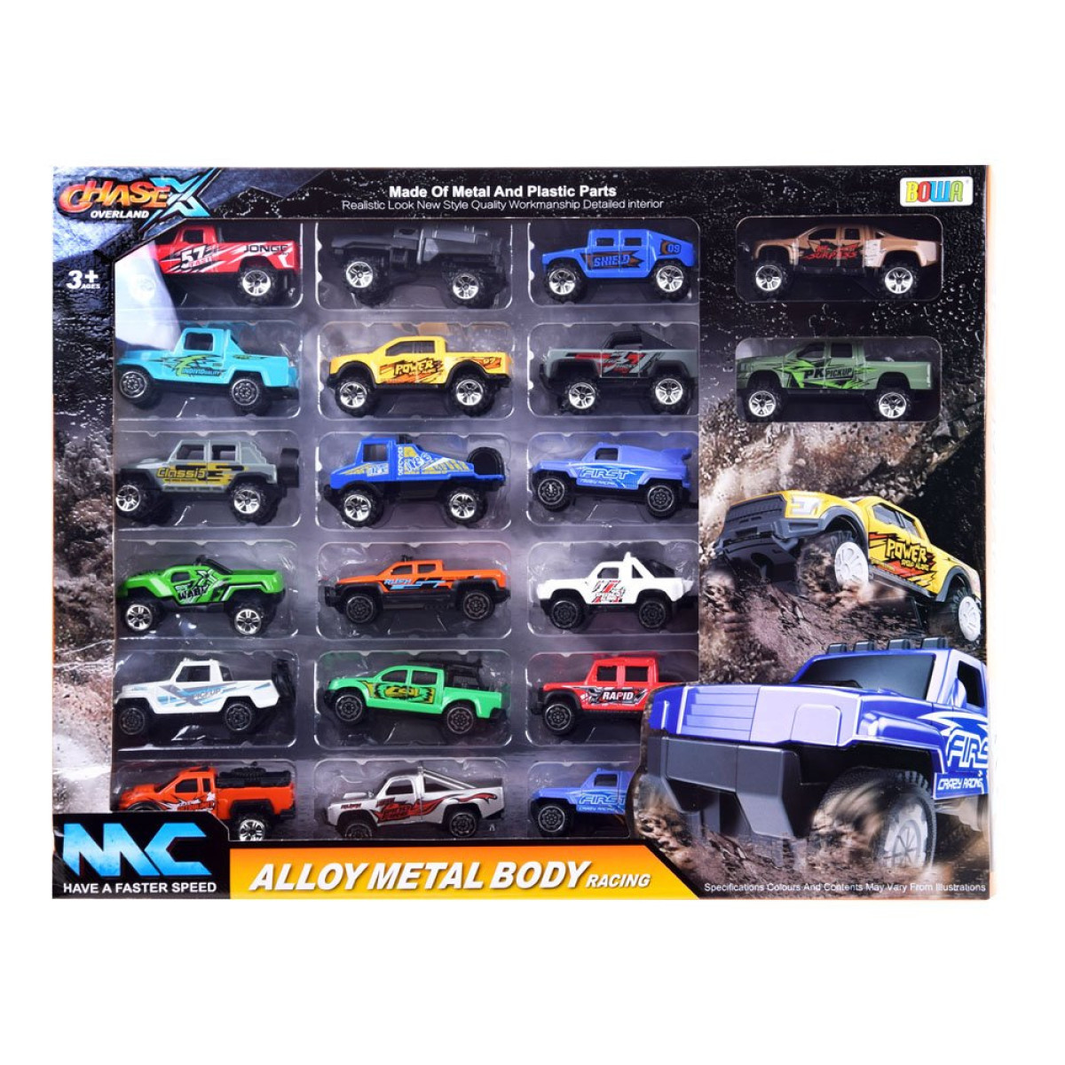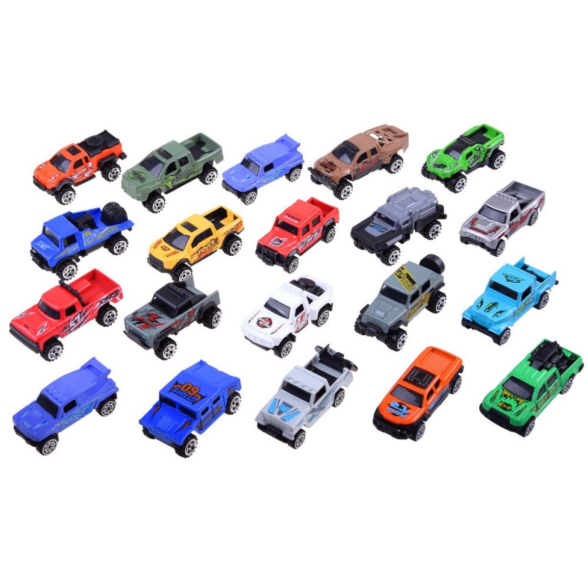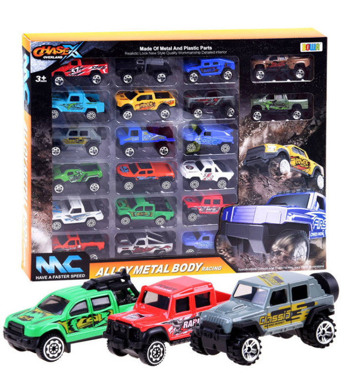 Šis metāla automašīnu komplekts ar plastmasas šasiju noteikti noderēs maza auto kolekcionāra garāžā. Automobiļi ir rūpīgi un efektīvi izgatavoti, piesaistot uzmanību jebkurā sacensībā. Komplektā ir iekļauti apvidus automobiļi, pikapi, un vēl daudz citu. Katram kaut kas piemērots.