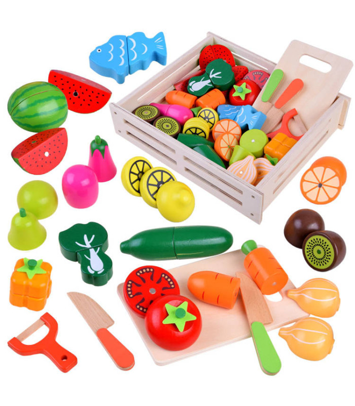 Iedvesmojiet savu bērnu kulinārijas revolūcijām ar koka dārzeņu un augļu griešanas komplektu! Šis burvīgais komplekts ar dabīgu koka kasti, griešanas dēli un drošiem nažiem ir ideāls veids, kā bērns var atdarināt pieaugušo ikdienas aktivitātes, attīstot savas roku prasmes, iztēli un radošumu. Tas ir lielisks veids, kā spēlēt mājas virtuvē, restorānā vai pat dārzeņu tirgū.