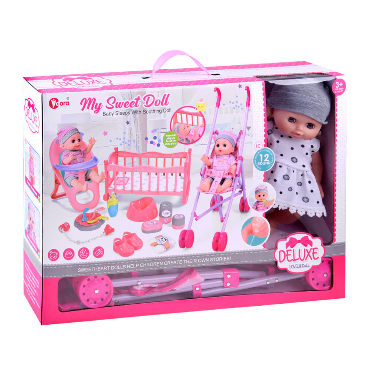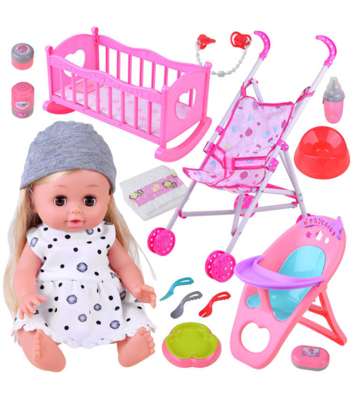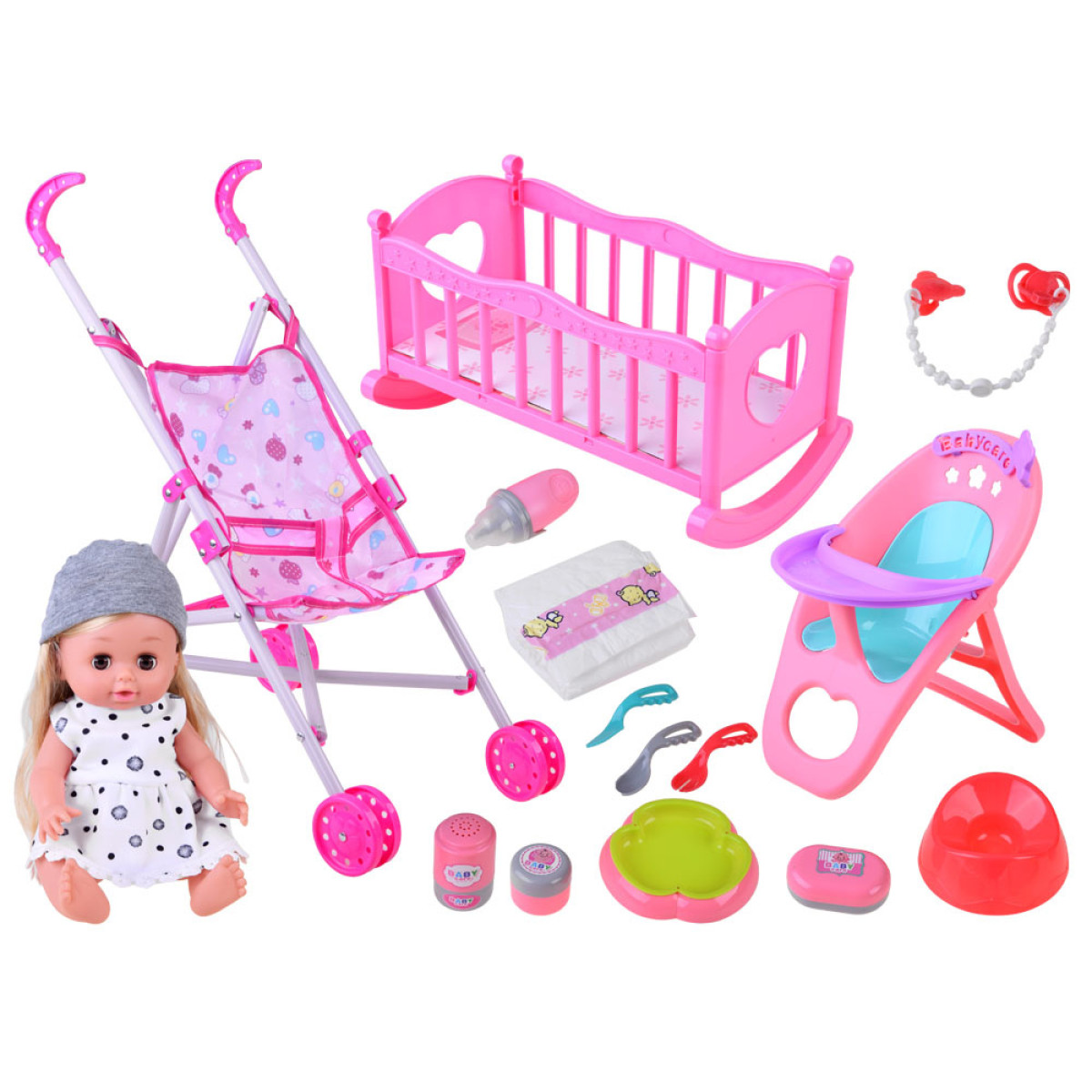 Lielais interaktīvās lelles komplekts ar ratiņiem, krēsliņu un gultiņu