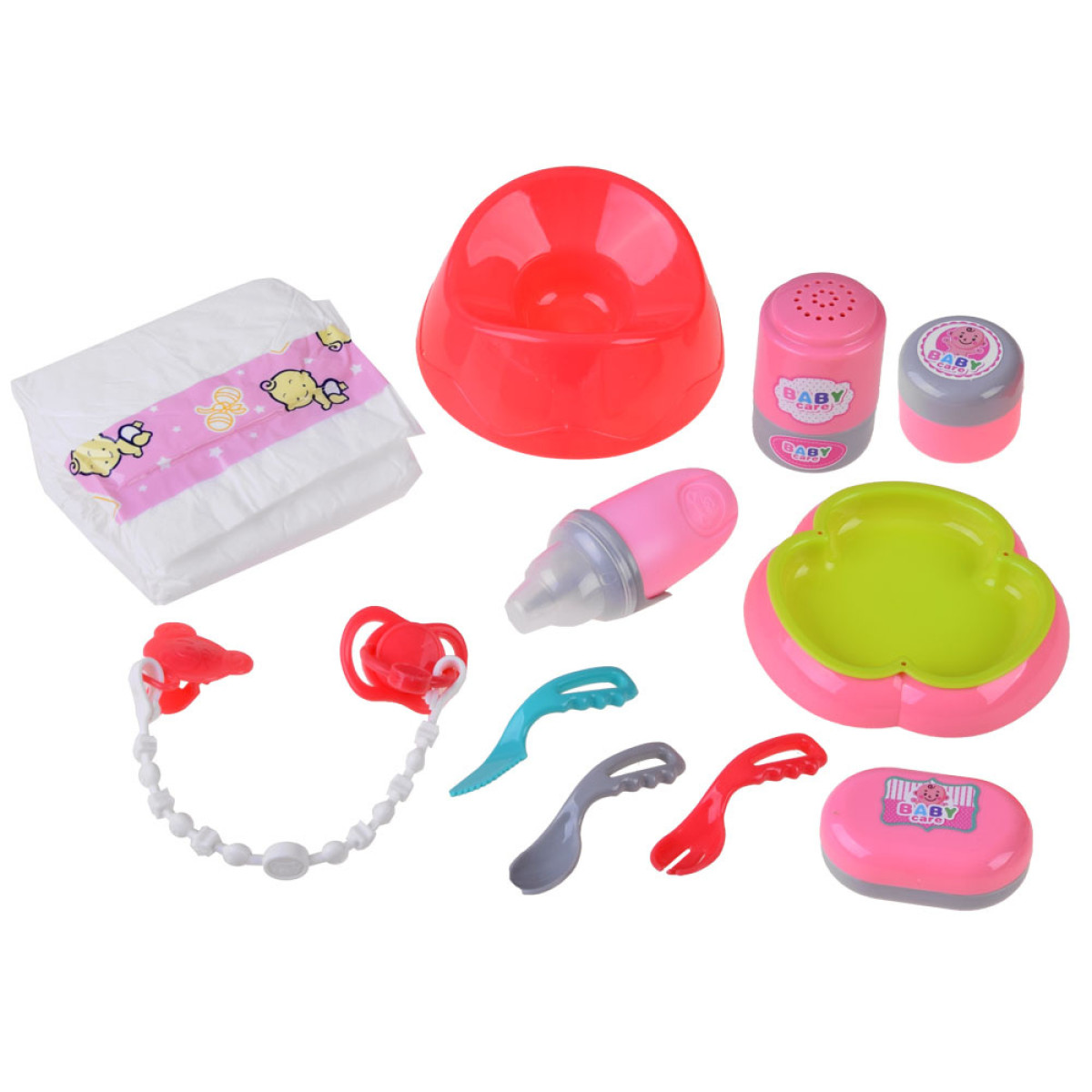 Šis lielais komplekts piedāvā visu nepieciešamo, lai pilnībā rūpētos par savu lelli ikdienā. Komplektā ietilpst: