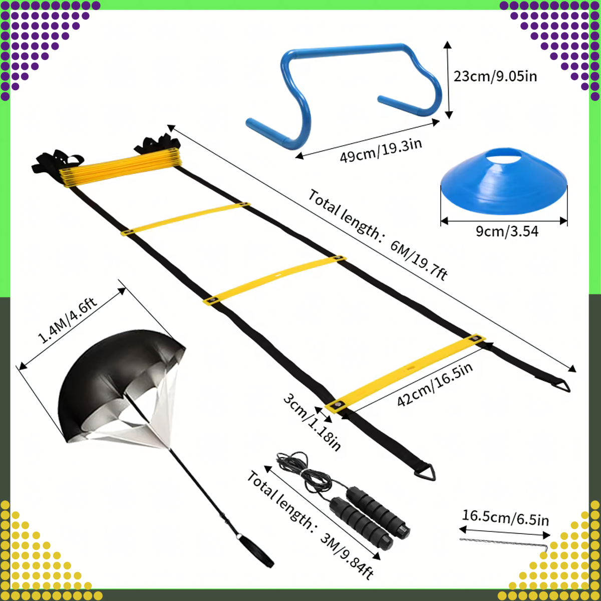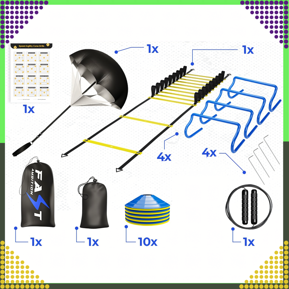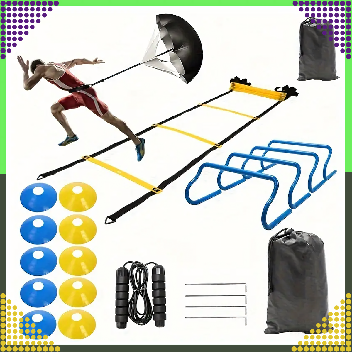 Vai vēlaties uzlabot savas futbola prasmes un pacelt treniņu uz augstāku līmeni? Mūsu treniņu komplekts ir izstrādāts, lai attīstītu katra futbolista būtiskās prasmes: ātrumu, veiklību, koordināciju un izturību.