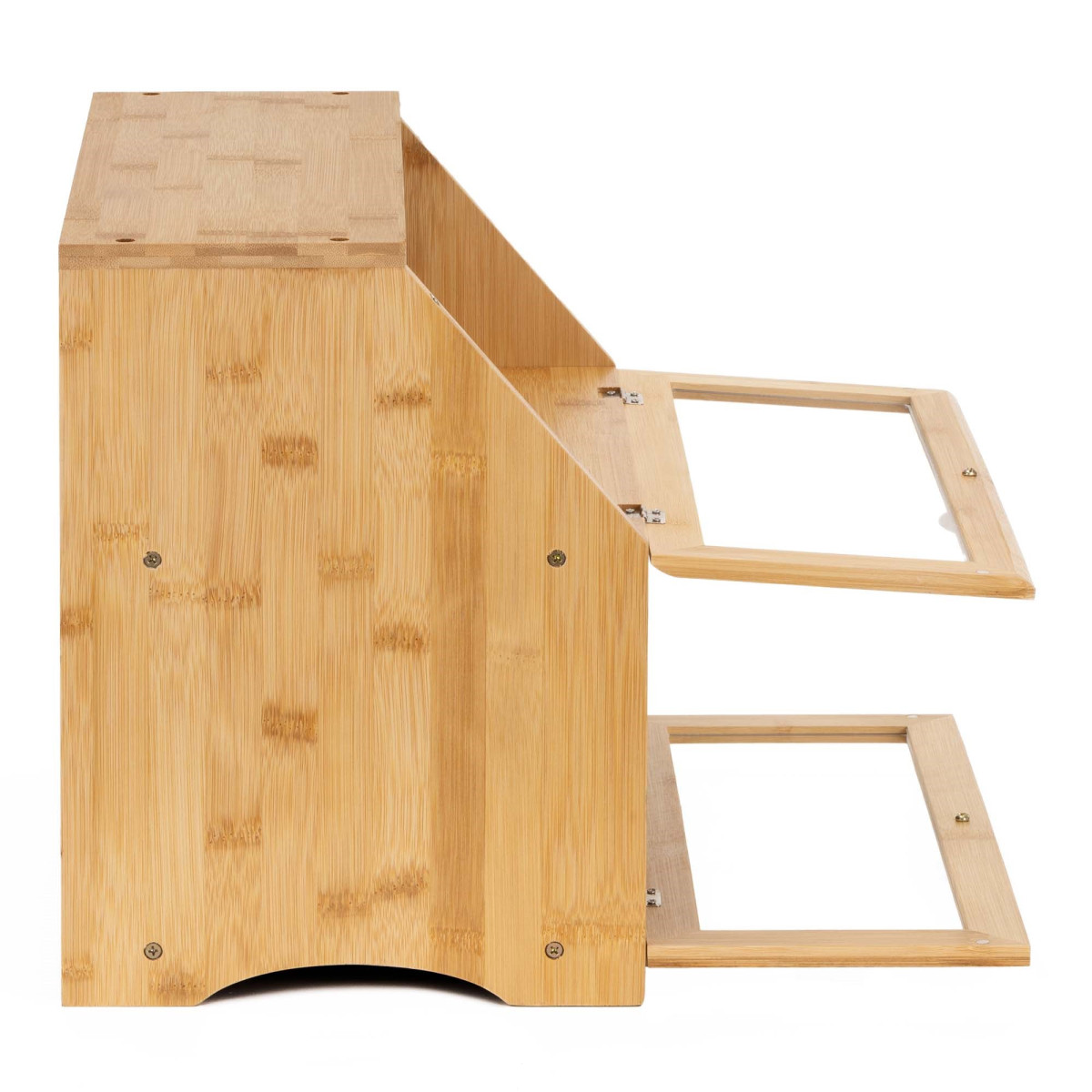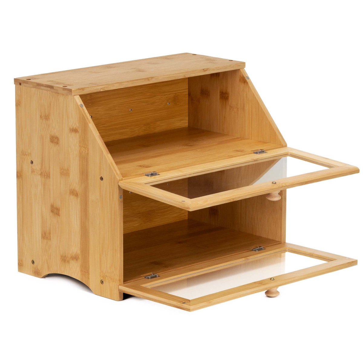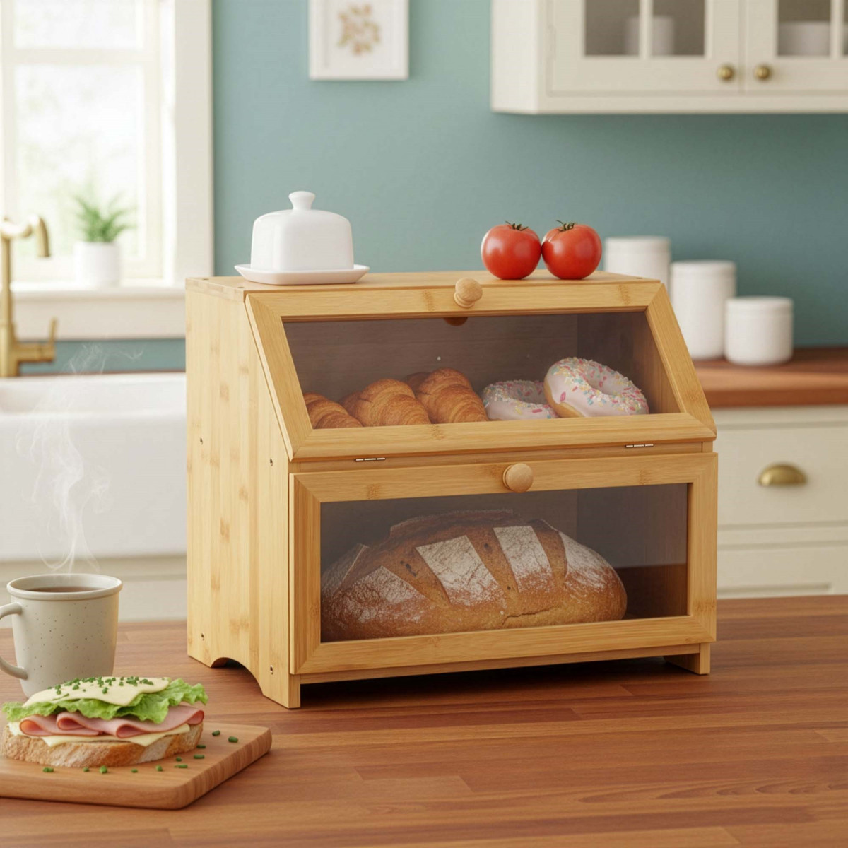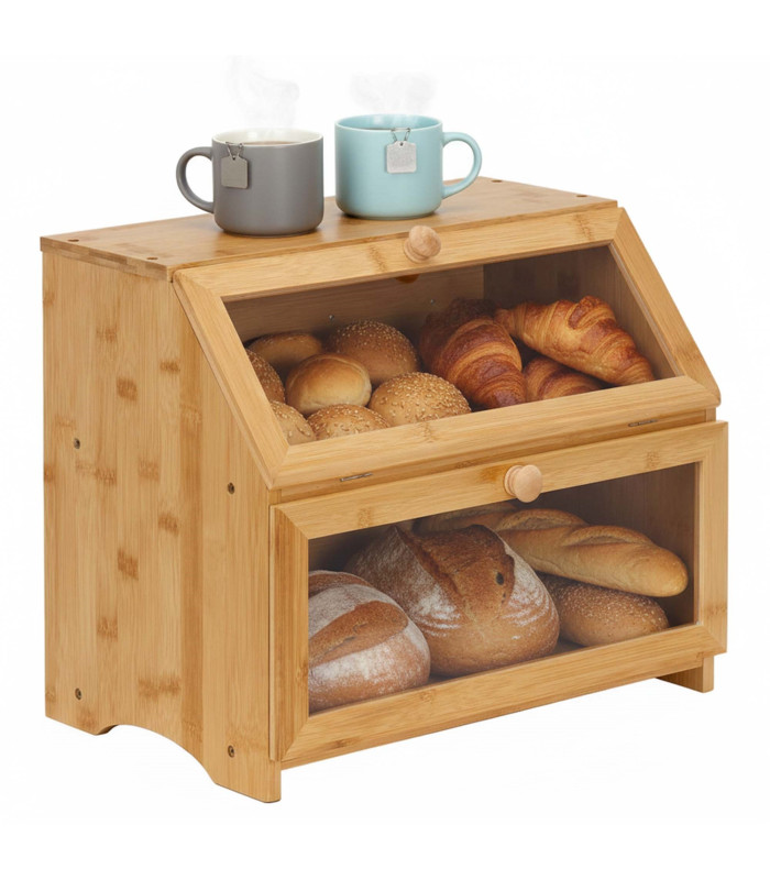 Šī bambusa maizes kaste apvieno dabīgā koka estētiku ar maizes uzglabāšanas ērtībām divos līmeņos. Tā dizains ļauj atsevišķi uzglabāt dažādus cepumus, atvieglojot kārtības uzturēšanu un ātru nepieciešamā produkta atrašanu. Bambusa materiāls piešķir kastei vizuālu vieglumu un harmonisku raksturu, kas papildina gan modernu, gan klasisku virtuves dizainu. Slēgtā priekšpuse pasargā maizi no svaiguma zaudēšanas un samazina gaisa iekļūšanu, nodrošinot ilgāku uzglabāšanas laiku.