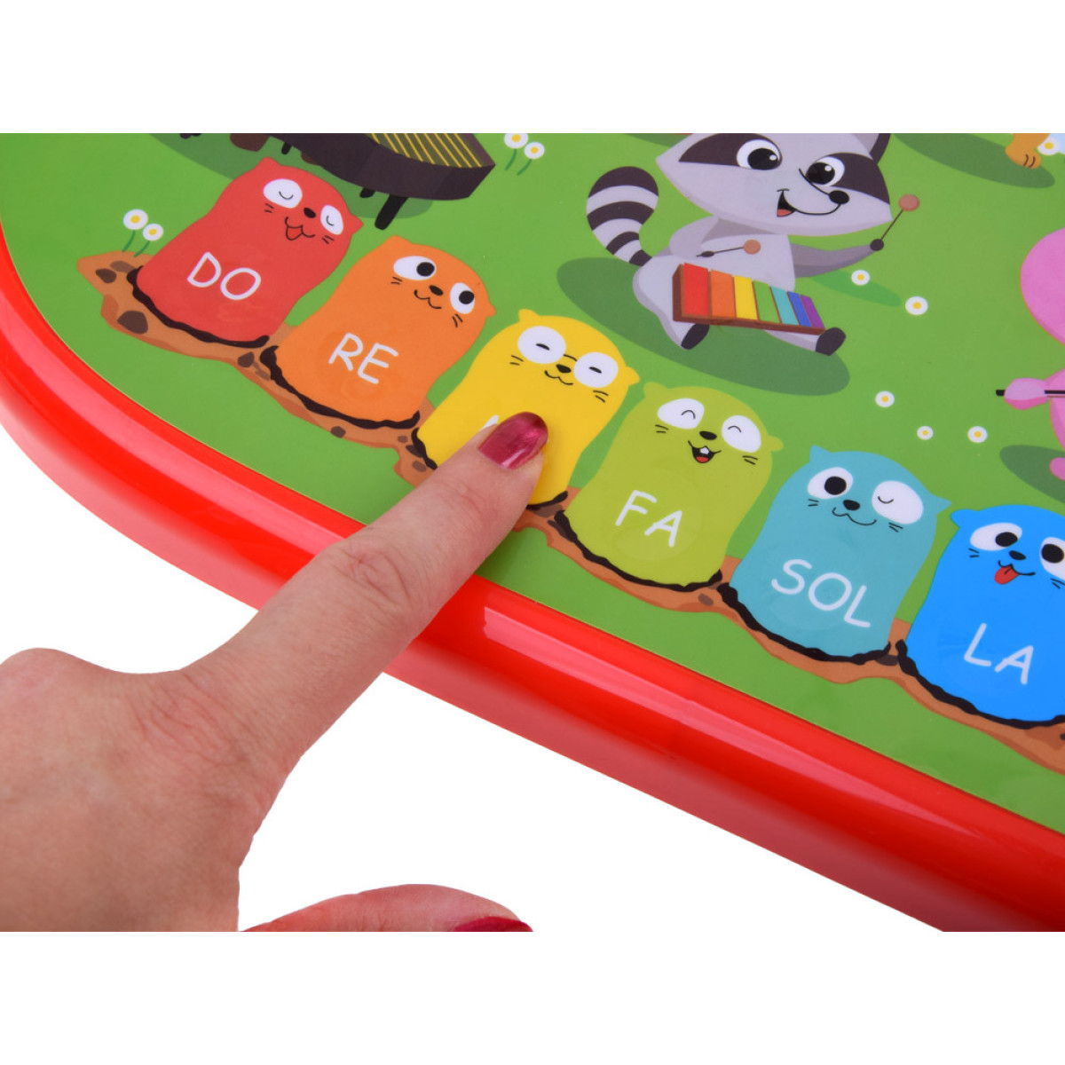 - melodiju atskaņošana - neatkarīgi no tā, kuru taustiņu nospiež bērns, tiks "atskaņotas" nākamās izvēlētās melodijas notis. Ir pieejamas vairākas pazīstamas dziesmas, piemēram, "Stary Donald farmę miał", "Twinkle Little Star" vai "If you're happy and you know it, clap your hands". Melodijas var mainīt ar sarkano pogu ar bultiņām.