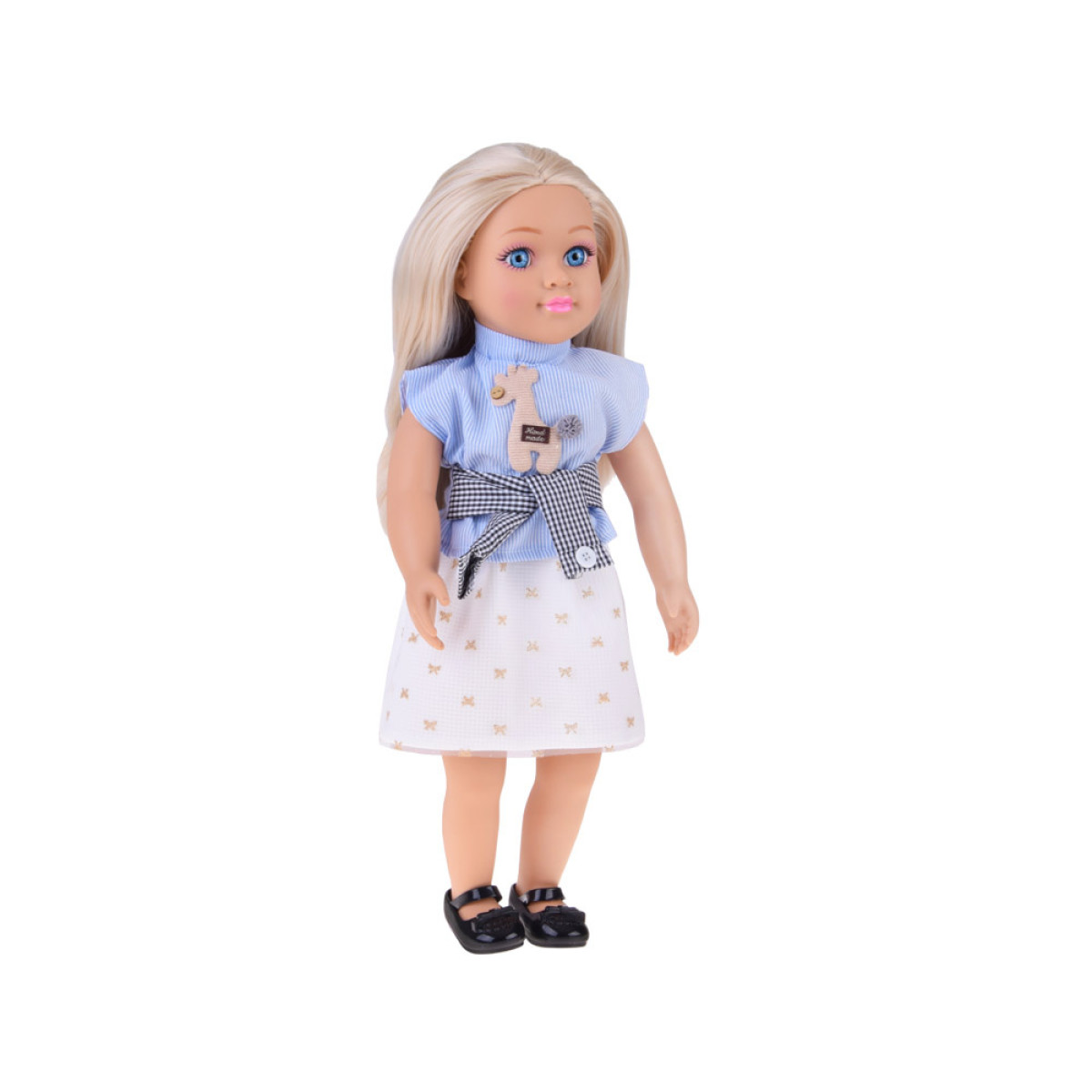 Lelle no May May sērijas ir lieliska izvēle katrai meitenei, kas mīl modi, stilizācijas un radošu spēli. Šī lelle ir 48 cm augsta un aizrauj ar gariem blondiem matiem, kurus var ķemmēt un veidot dažādas frizūras. Viņas lielās, zilās acis ir izrotātas ar biezām, melnām skropstām, un rozā cukura lūpas piešķir viņai burvīgu, meitenīgu šarmu. Lelle izceļas ar modernu apģērbu - zilā blūzīte ar baltām strīpām, stilīgu jostu un burvīgu brošu. Apģērbu papildina kokteiļkleitiņa krēmkrāsas tonī, dekorēta ar caurspīdīgu materiālu zelta bantēm, kas piešķir īpašu šarmu. Stila papildinājums ir melnas, elegantas balerīnas, kas izceļ lelles šiku raksturu. Lellei ir kustīgas rokas, kājas, galva, un viņas mīkstais ķermenis padara spēli vēl patīkamāku un reālāku. Pateicoties mīkstajam vēderiņam, lelle ir ne tikai skaista un eleganta, bet arī ideāli piemērota apskāvieniem. Cieta plastmasa nodrošina izturību un stabilitāti – lelle var stabilitāti sēdēt. Lelle ir aprīkota ar skaņas efektu – jautru melodiju, kas padara spēli vēl priecīgāku un unikālāku.