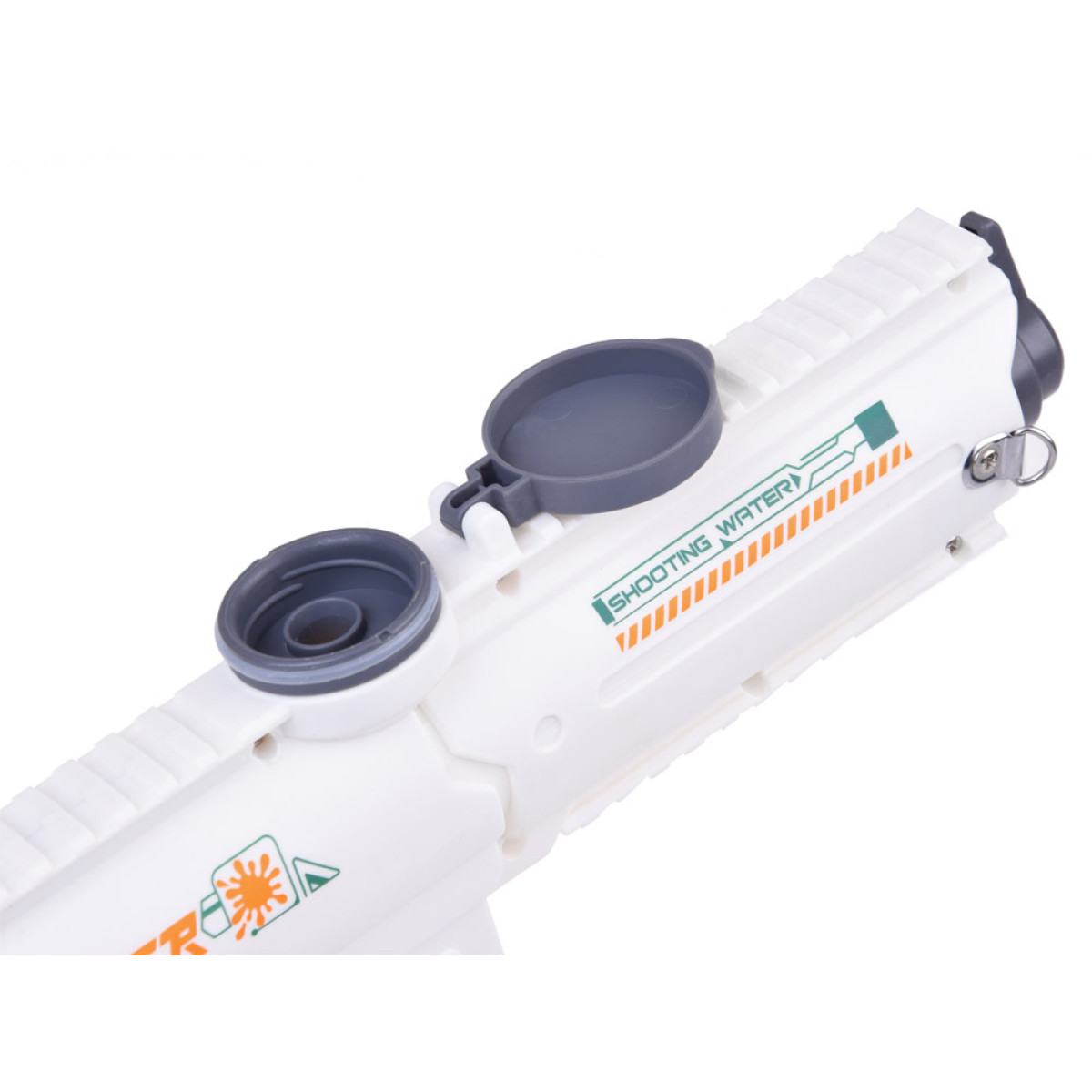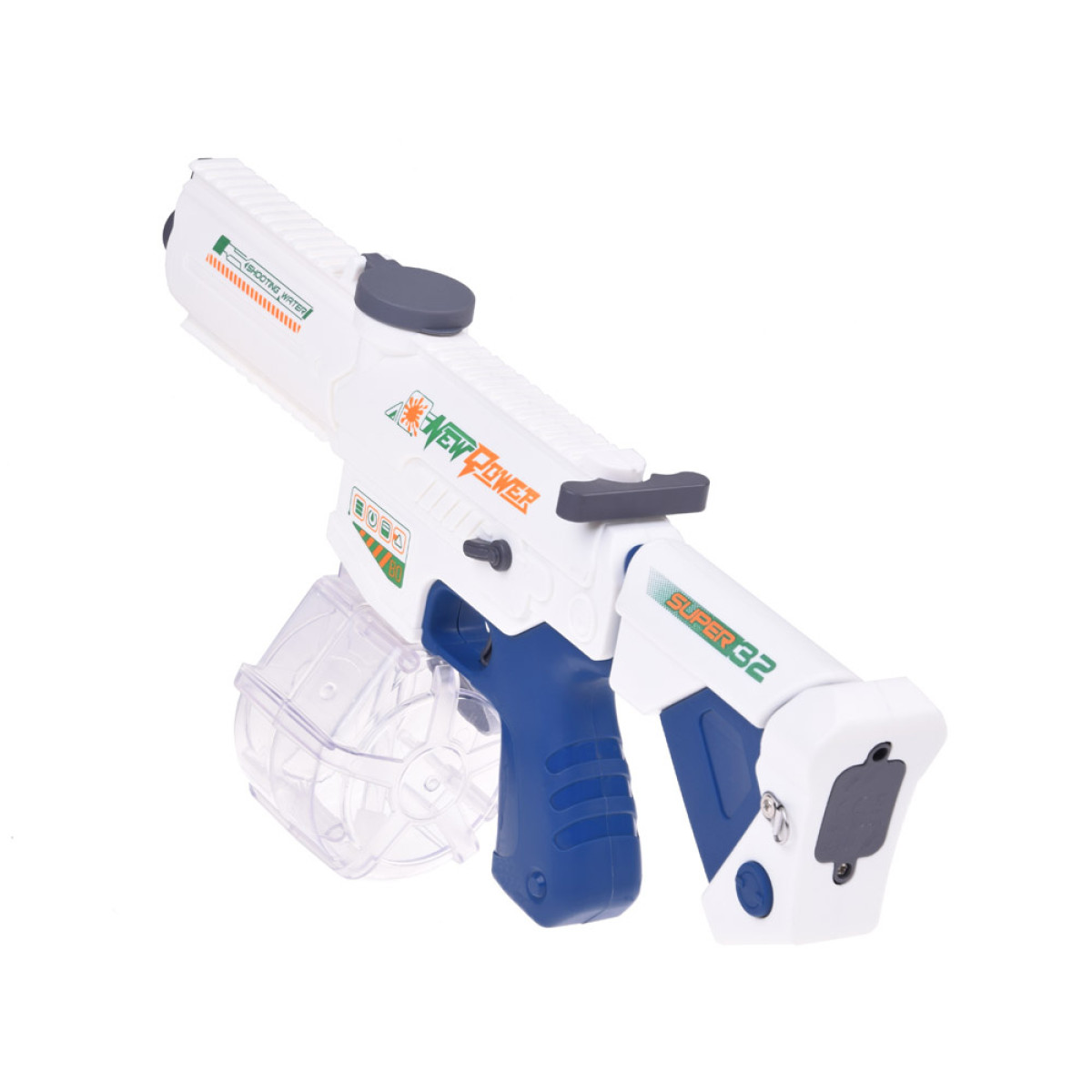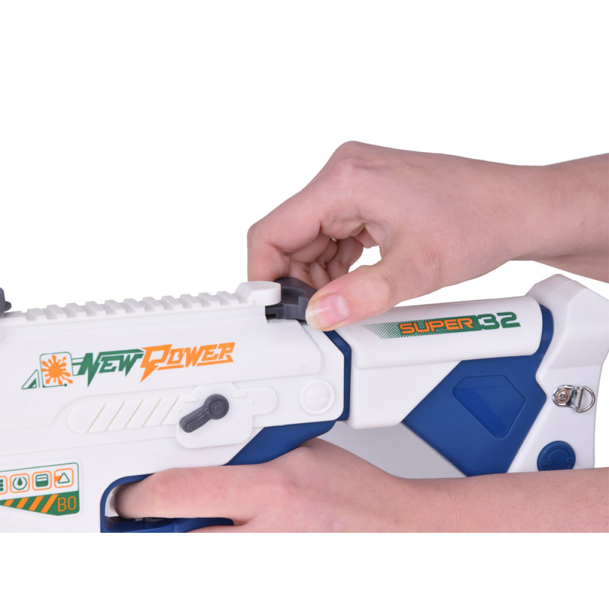 - vienkārši pabīdiet pogu virs sprūda atpakaļ, lai baudītu pilnībā elektrisku pistoli, kas izšauj ūdens strūklu, bez nepieciešamības sūknēt vai pārlādēt - vienkārši nospiediet sprūdu!