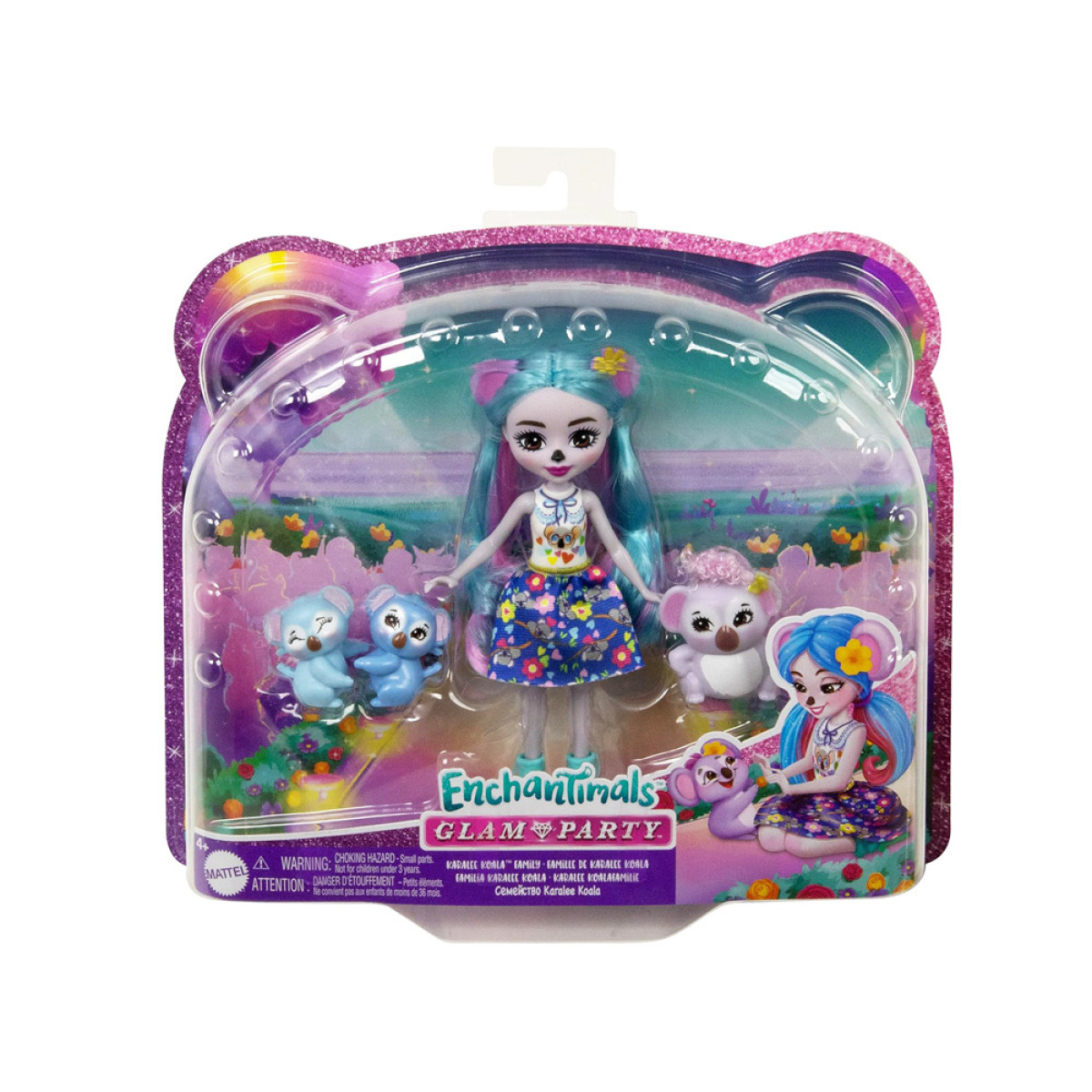 Enchantimals lelle Kwala Koala ar draudzeni Joette™ un viņas ģimeni ir ideāls komplekts katrai šo mazo burvīgo leļļu un viņu mājdzīvnieku fanei. Komplektā iekļauts sērijas Glam Party notikums, kurā uzaicināti visi meža draugi, kuri vienmēr lieliski pavada laiku ar saviem mīļajiem dzīvniekiem, piedzīvojot kopā dažādus brīnišķīgus piedzīvojumus un stāstus. 15 cm augsta lelle ir ar gariem zilajiem matiem un rozā šķipsnām, galvā izceļas ausis un dzeltena puķe, tai ir oriģināls tops (iestrādāts), zila svārki un zilas kurpes ar pandu attēliem. Lellei ir kustīgas ekstremitātes. Viņas draudzene Joette ir kopā ar savu burvīgo ģimeni Rangu un Blokeru.