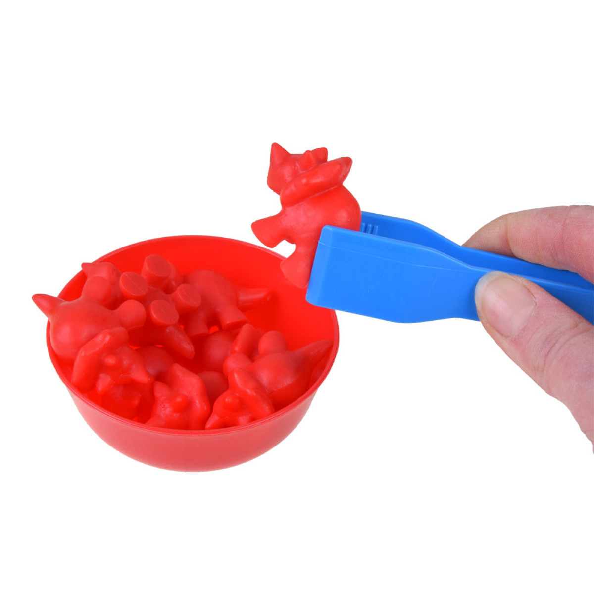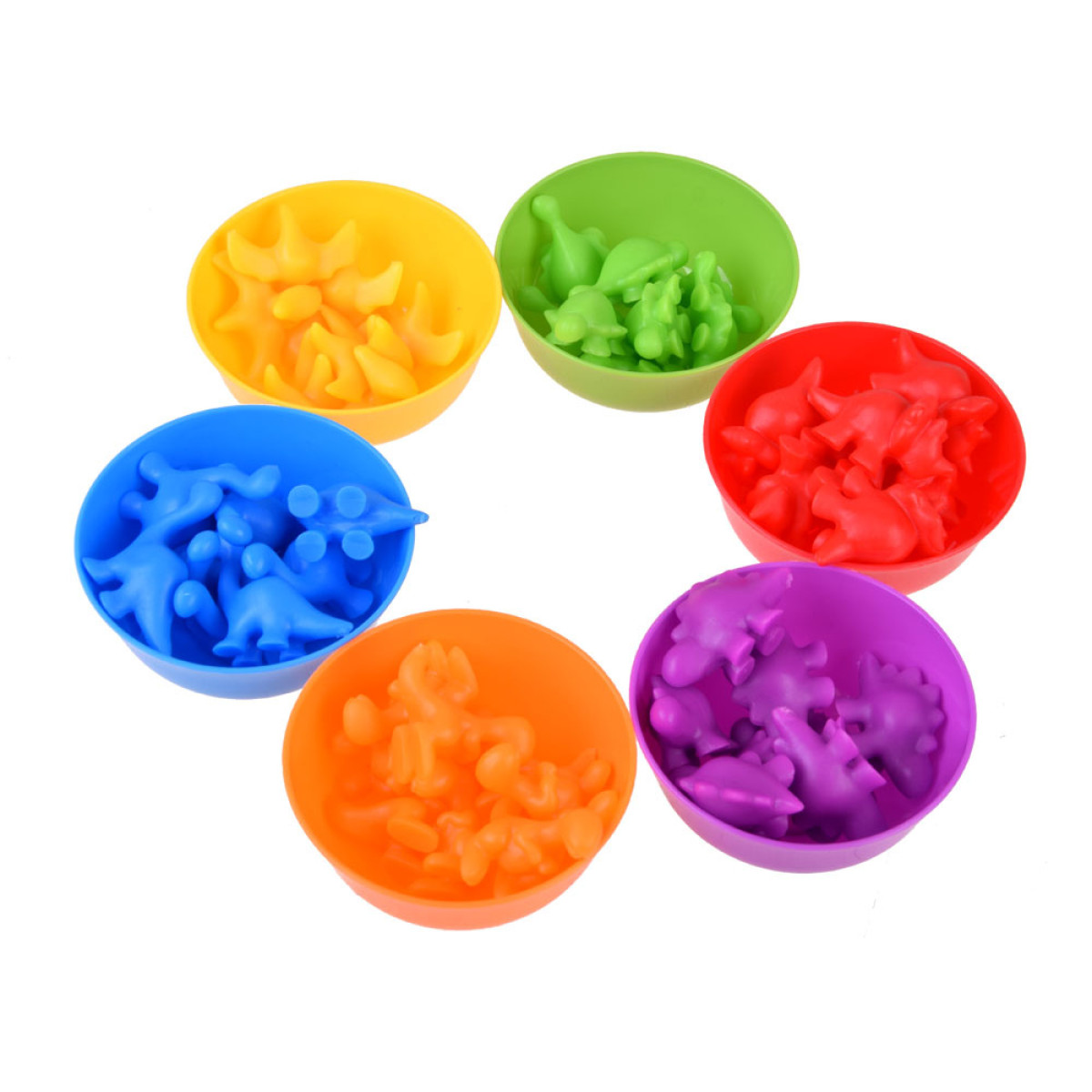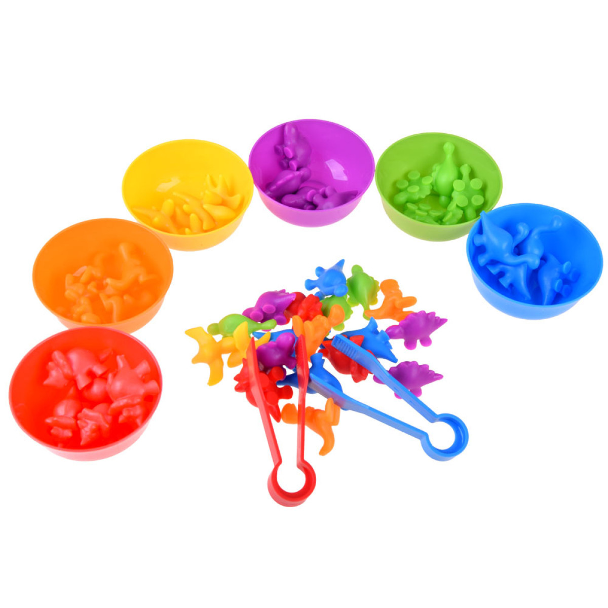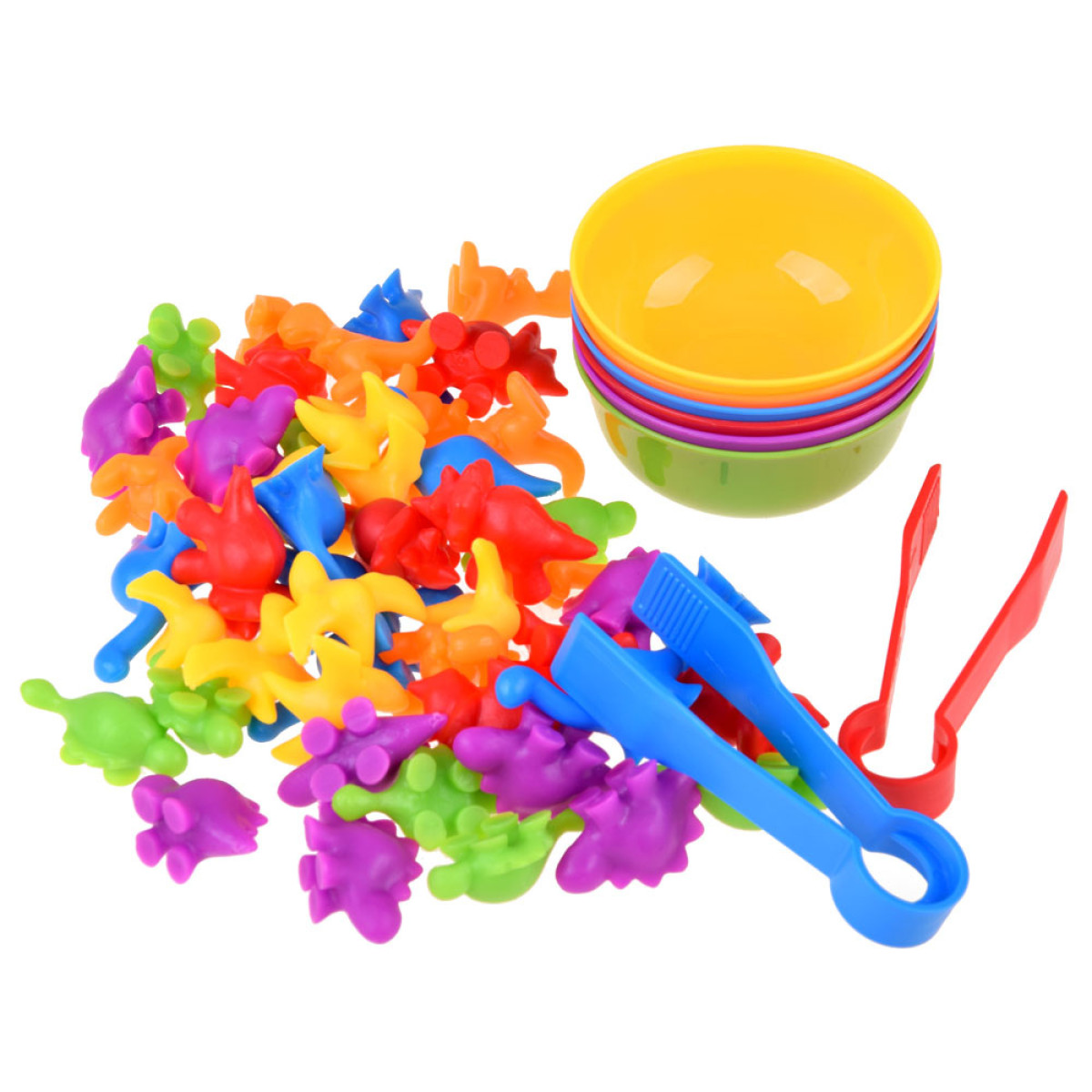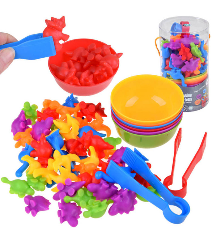Visus dinozaurus izberiet un sajauciet kopā, izklājiet bļodiņas. Bērna uzdevums ir, izmantojot pinceti, sakārtot dinozaurus un ievietot atbilstošās krāsas atbilstošajā bļodiņā. Tie var tikt sadalīti arī pēc formām un izmantoti dažādām matemātiskām darbībām. Tas ir lielisks veids, kā apgūt skaitīšanu, un saskaitīšana un atņemšana kļūs vienkārša un patīkama.