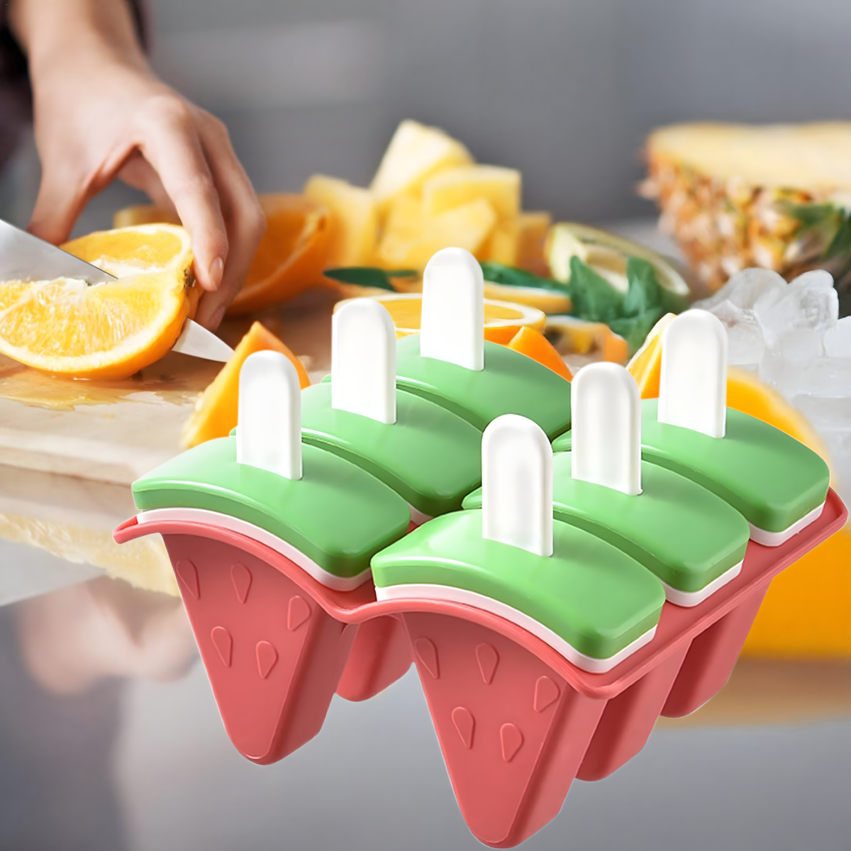 Veidojiet mājās gatavotus, veselīgus un krāsainus saldējumus bez konservantiem un liekā cukura! Komplektā ietilpst sešas formas arbūza formā, kas ir ideāls risinājums karstām dienām gan bērniem, gan pieaugušajiem.