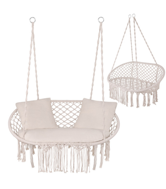 - 4 izturīgas virves ar metāla turētājiem - stabila šūpoļu piekare.