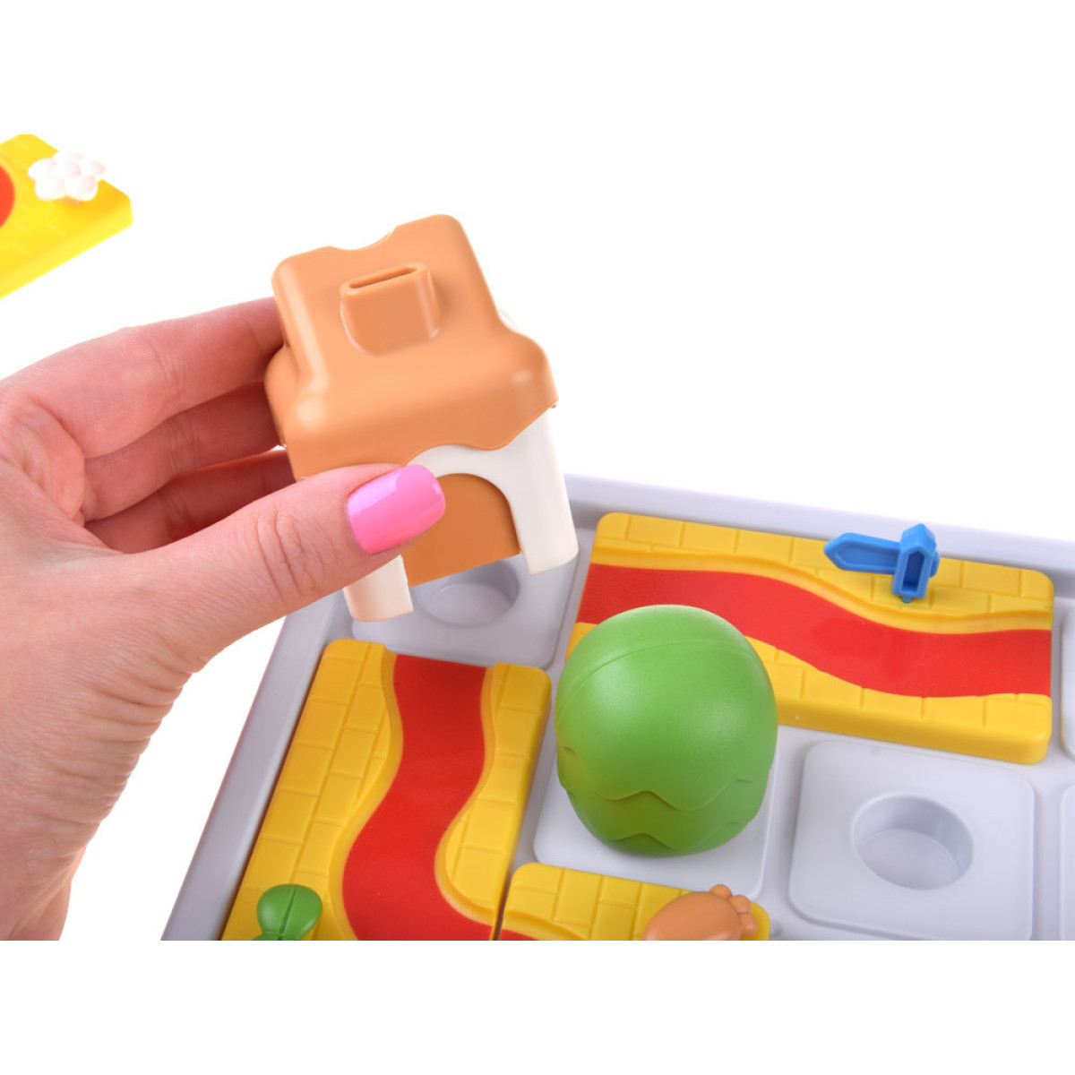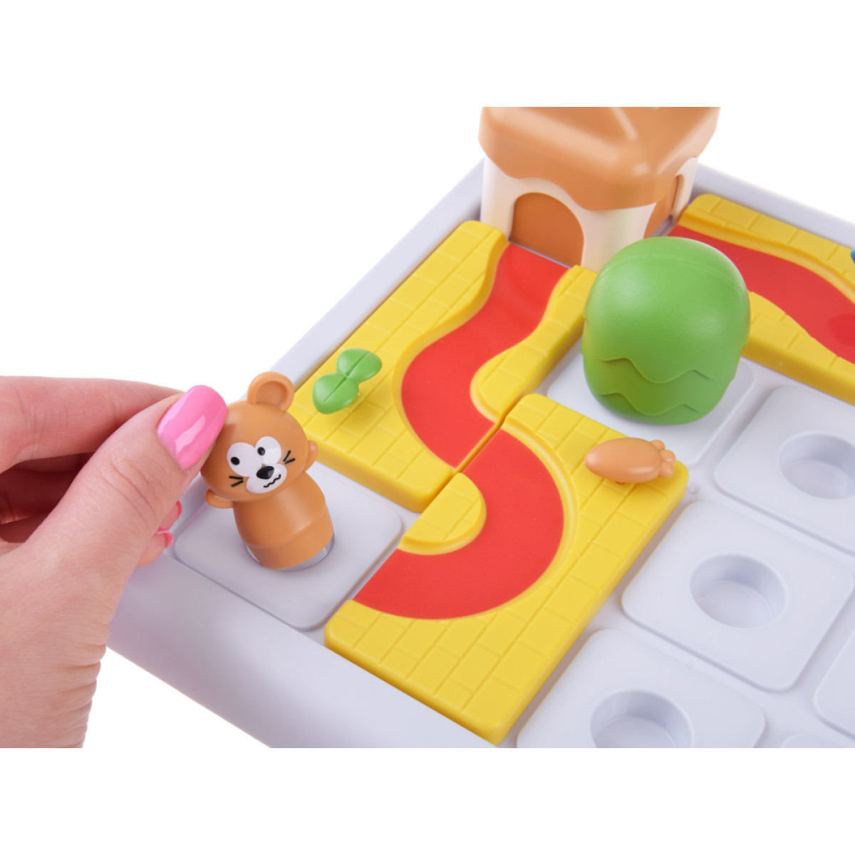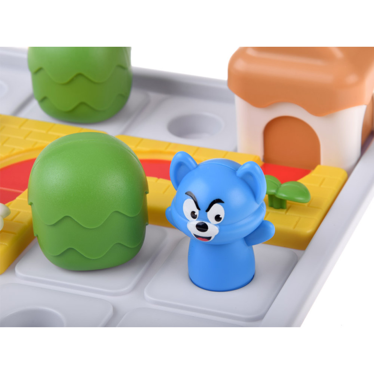 - Izvēlies izaicinājumu no grāmatiņas. Novieto māju, kokus un peli uz dēļa saskaņā ar norādīto zīmējumu. Pievērs uzmanību skursteņa novietojumam mājā - tas norāda pareizo durvju novietojumu.