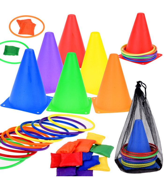 Mērķē, met, izklaidējies! Komplekts pilns ar kustībām un smiekliem! Rotaļlieta bērniem: konusi, stīpas, maisiņi.