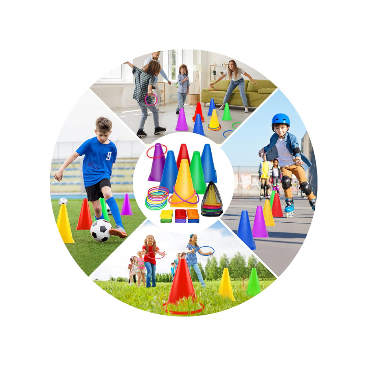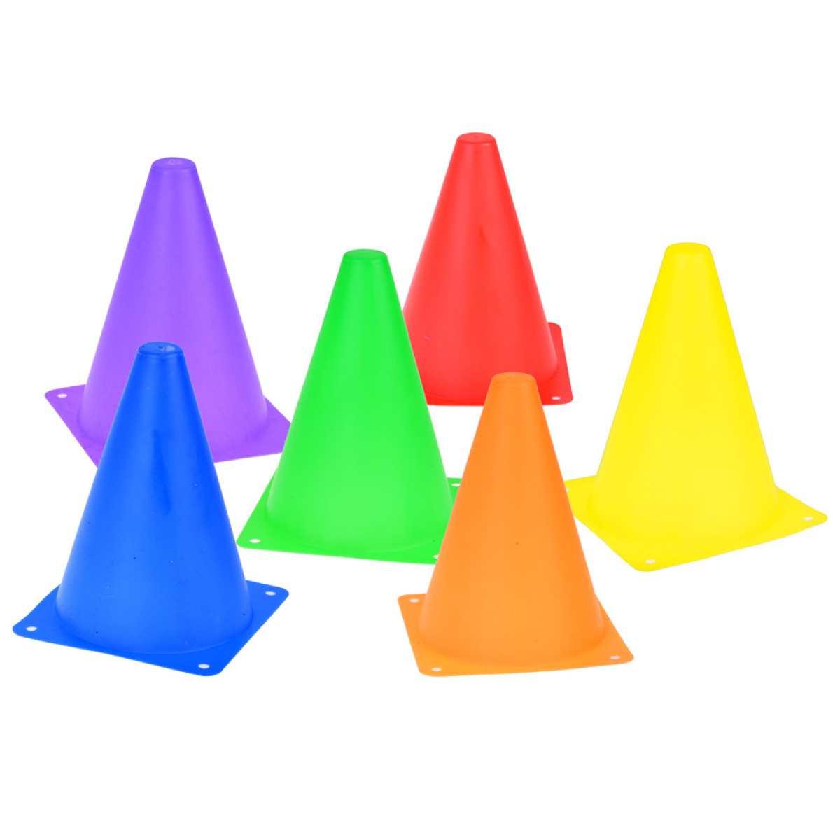 - 6 krāsaini konusi – viegls, izturīgs un labi redzams no attāluma. Der kā mērķi vai spēles lauka marķieri.