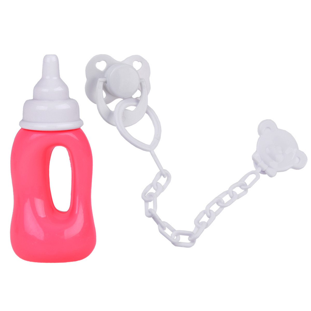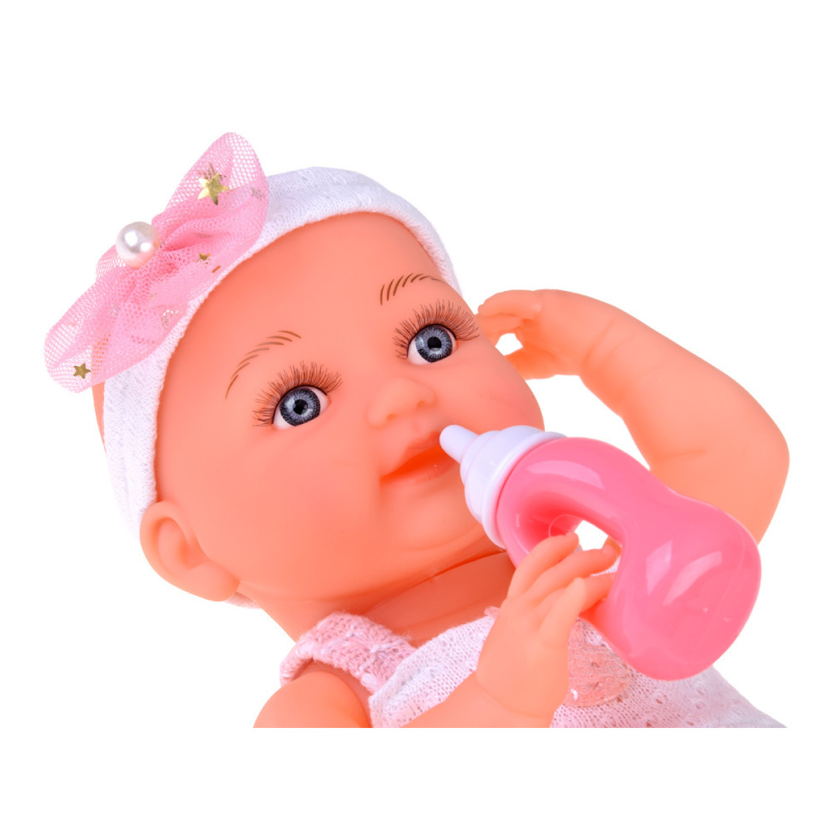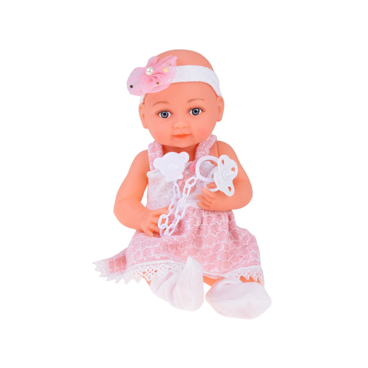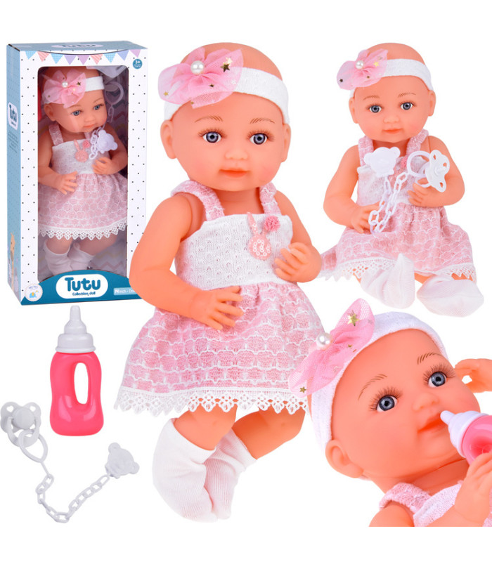 Gumijas lelle bēbis ar rozā kleitu, pudelīti un knupīti ZA5235